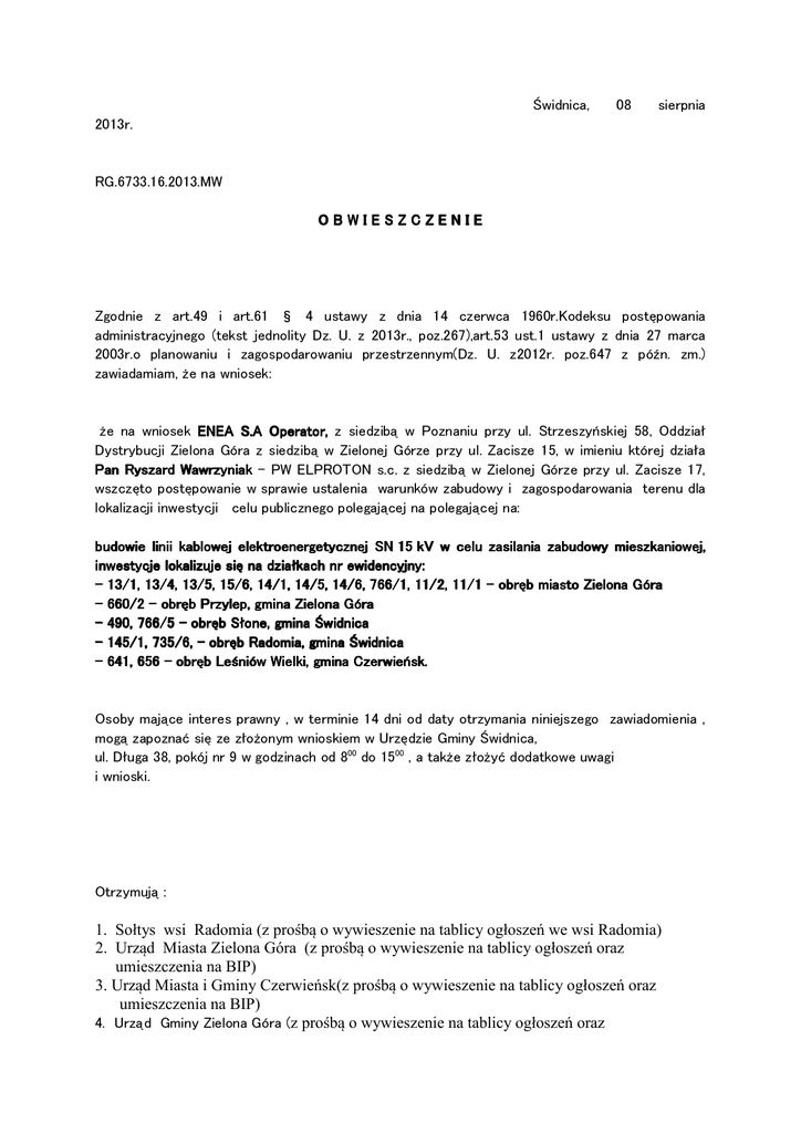 Świdnica, 08 sierpnia 2013r. RG.6733.16.2013.MW OBWIESZCZENIE Zgodnie z art.49 i art.61 § 4 ustawy z dnia 14 czerwca 1960r.Kodeksu postępowania administracyjnego (tekst jednolity Dz. U. z 2013r., poz.267),art.53 ust.1 ustawy z dnia 27 marca 2003r.o planowaniu i zagospodarowaniu przestrzennym(Dz. U. z2012r. poz.647 z późn. zm.) zawiadamiam, że na wniosek: że na wniosek ENEA S.A Operator, z siedzibą w Poznaniu przy ul. Strzeszyńskiej 58, Oddział Dystrybucji Zielona Góra z siedzibą w Zielonej Górze przy ul. Zacisze 15, w imieniu której działa Pan Ryszard Wawrzyniak – PW ELPROTON s.c. z siedzibą w Zielonej Górze przy ul. Zacisze 17, wszczęto postępowanie w sprawie ustalenia warunków zabudowy i zagospodarowania terenu dla lokalizacji inwestycji celu publicznego polegającej na polegającej na: budowie linii kablowej elektroenergetycznej SN 15 kV w celu zasilania zabudowy mieszkaniowej, inwestycje inwestycje lokalizuje się na działkach nr ewidencyjny: - 13/1, 13/4, 13/5, 15/6, 14/1, 14/5, 14/6, 766/1, 11/2, 11/1 – obręb miasto Zielona Góra - 660/2 – obręb Przylep, gmina Zielona Góra - 490, 766/5 – obręb Słone, gmina Świdnica - 145/1, 735/6, – obręb Radomia, Radomia, gmina Świdnica - 641, 656 – obręb Leśniów Wielki, gmina Czerwieńsk. Osoby mające interes prawny , w terminie 14 dni od daty otrzymania niniejszego zawiadomienia , mogą zapoznać się ze złożonym wnioskiem w Urzędzie Gminy Świdnica, ul. Długa 38, pokój nr 9 w godzinach od 800 do 1500 , a także złożyć dodatkowe uwagi i wnioski. Otrzymują : 1. Sołtys wsi Radomia (z prośbą o wywieszenie na tablicy ogłoszeń we wsi Radomia) 2. Urząd Miasta Zielona Góra (z prośbą o wywieszenie na tablicy ogłoszeń oraz umieszczenia na BIP) 3. Urząd Miasta i Gminy Czerwieńsk(z prośbą o wywieszenie na tablicy ogłoszeń oraz umieszczenia na BIP) 4. Urząd Gminy Zielona Góra (z prośbą o wywieszenie na tablicy ogłoszeń oraz umieszczenia na BIP) 5. a/a ( umieszczono w BIP oraz wywieszono na tablicy ogłoszeń w Urzędzie Gminy)