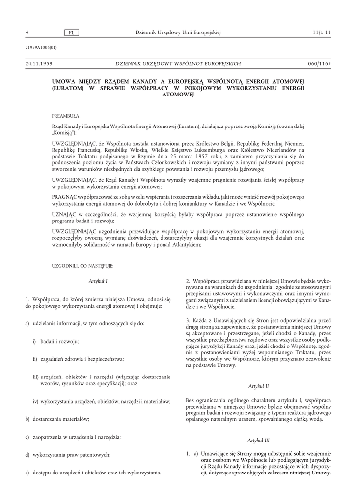 4 Dziennik Urzędowy Unii Europejskiej PL 11/t. 11 21959A1006(01) 24.11.1959 DZIENNIK URZĘDOWY WSPÓLNOT EUROPEJSKICH 060/1165 UMOWA MIĘDZY RZĄDEM KANADY A EUROPEJSKĄ WSPÓLNOTĄ ENERGII ATOMOWEJ (EURATOM) W SPRAWIE WSPÓŁPRACY W POKOJOWYM WYKORZYSTANIU ENERGII ATOMOWEJ PREAMBUŁA Rząd Kanady i Europejska Wspólnota Energii Atomowej (Euratom), działająca poprzez swoją Komisję (zwaną dalej „Komisją”); UWZGLĘDNIAJĄC, że Wspólnota została ustanowiona przez Królestwo Belgii, Republikę Federalną Niemiec, Republikę Francuską, Republikę Włoską, Wielkie Księstwo Luksemburga oraz Królestwo Niderlandów na podstawie Traktatu podpisanego w Rzymie dnia 25 marca 1957 roku, z zamiarem przyczyniania się do podnoszenia poziomu życia w Państwach Członkowskich i rozwoju wymiany z innymi państwami poprzez stworzenie warunków niezbędnych dla szybkiego powstania i rozwoju przemysłu jądrowego; UWZGLĘDNIAJĄC, że Rząd Kanady i Wspólnota wyraziły wzajemne pragnienie rozwijania ścisłej współpracy w pokojowym wykorzystaniu energii atomowej; PRAGNĄC współpracować ze sobą w celu wspierania i rozszerzania wkładu, jaki może wnieść rozwój pokojowego wykorzystania energii atomowej do dobrobytu i dobrej koniunktury w Kanadzie i we Wspólnocie; UZNAJĄC w szczególności, że wzajemną korzyścią byłaby współpraca poprzez ustanowienie wspólnego programu badań i rozwoju; UWZGLĘDNIAJĄC uzgodnienia przewidujące współpracę w pokojowym wykorzystaniu energii atomowej, rozpoczęłyby owocną wymianę doświadczeń, dostarczyłyby okazji dla wzajemnie korzystnych działań oraz wzmocniłyby solidarność w ramach Europy i ponad Atlantykiem; UZGODNILI, CO NASTĘPUJE: Artykuł I 1. Współpraca, do której zmierza niniejsza Umowa, odnosi się do pokojowego wykorzystania energii atomowej i obejmuje: a) udzielanie informacji, w tym odnoszących się do: i) badań i rozwoju; ii) zagadnień zdrowia i bezpieczeństwa; iii) urządzeń, obiektów i narzędzi (włączając dostarczanie wzorów, rysunków oraz specyfikacji); oraz iv) wykorzystania urządzeń, obiektów, narzędzi i materiałów; b) dostarczania materiałów; c) zaopatrzenia w urządzenia i narzędzia; d) wykorzystania praw patentowych; e) dostępu do urządzeń i obiektów oraz ich wykorzystania. 2. Współpraca przewidziana w niniejszej Umowie będzie wykonywana na warunkach do uzgodnienia i zgodnie ze stosowanymi przepisami ustawowymi i wykonawczymi oraz innymi wymogami związanymi z udzielaniem licencji obowiązującymi w Kanadzie i we Wspólnocie. 3. Każda z Umawiających się Stron jest odpowiedzialna przed drugą stroną za zapewnienie, że postanowienia niniejszej Umowy są akceptowane i przestrzegane, jeżeli chodzi o Kanadę, przez wszystkie przedsiębiorstwa rządowe oraz wszystkie osoby podlegające jurysdykcji Kanady oraz, jeżeli chodzi o Wspólnotę, zgodnie z postanowieniami wyżej wspomnianego Traktatu, przez wszystkie osoby we Wspólnocie, którym przyznano zezwolenie na podstawie Umowy. Artykuł II Bez ograniczania ogólnego charakteru artykułu I, współpraca przewidziana w niniejszej Umowie będzie obejmować wspólny program badań i rozwoju związany z typem reaktora jądrowego opalanego naturalnym uranem, spowalnianego ciężką wodą. Artykuł III 1. a) Umawiające się Strony mogą udostępnić sobie wzajemnie oraz osobom we Wspólnocie lub podlegającym jurysdykcji Rządu Kanady informacje pozostające w ich dyspozycji, dotyczące spraw objętych zakresem niniejszej Umowy. 11/t. 11 Dziennik Urzędowy Unii Europejskiej PL b) Udzielanie informacji otrzymanych od każdej strony trzeciej na warunkach, które wykluczają takie udzielanie, jest wyłączone z zakresu niniejszej Umowy. c) Informacje uważane przez Umawiającą się Stronę, która ich dostarcza, ze mające wartość handlową, będą udzielane wyłącznie na warunkach określonych przez tę Umawiającą się Stronę. 5 2. Każda z Umawiających się Stron, tam, gdzie tylko to możliwe, dostarczy w swoich szkołach lub obiektach oraz pomoże w uzyskaniu gdziekolwiek w Kanadzie lub we Wspólnocie kształcenia z zagadnień odnoszących się do pokojowego wykorzystania energii atomowej dla uczniów lub osób szkolonych poleconych przez drugą Stronę. Artykuł VI 2. a) Umawiające się Strony będą zachęcać do wymiany informacji i ułatwiać taką wymianę między osobami podlegającymi jurysdykcji Rządu Kanady z jednej strony i osobami we Wspólnocie z drugiej strony w sprawach objętych zakresem niniejszej Umowy. b) Informacje posiadane przez te osoby udzielane będą wyłącznie za zgodą tych osób i na warunkach przez nie określonych. Umawiające się Strony uzgadniają, że za generalnym lub szczególnym zezwoleniem Rządu Kanady lub, tam, gdzie jest to wymagane przez Traktat ustanawiający Europejską Wspólnotę Energii Atomowej (Euratom), Komisji, przedsiębiorstwa rządowe Kanady, Agencja Dostaw Wspólnoty lub osoby podlegające jurysdykcji Rządu Kanady lub we Wspólnocie będą mogły otrzymywać lub dostarczać materiały źródłowe lub specjalne materiały rozszczepialne na podstawie niniejszej Umowy na zasadach handlowych lub innych, jeżeli tak uzgodniono. Artykuł IV Artykuł VII 1. a) Umawiające się Strony udzielą lub przyczynią się do udzielenia sobie wzajemnie lub osobom we Wspólnocie albo podlegającym jurysdykcji Rządu Kanady, na uzgodnionych warunkach, licencji i sublicencji na patenty posiadane przez każdą Umawiającą się Stronę lub przez Stronę, która ma prawo do udzielania licencji lub sublicencji w sprawach objętych zakresem niniejszej Umowy. Umawiające się Strony w takim zakresie, w jakim jest to praktykowane, pomogą osobom we Wspólnocie lub podlegającym jurysdykcji Rządu Kanady w uzyskiwaniu badań i reaktorów energetycznych oraz w uzyskiwaniu pomocy w projektowaniu, budowie i działaniu tych reaktorów. b) Udzielanie licencji lub sublicencji na patenty lub licencj