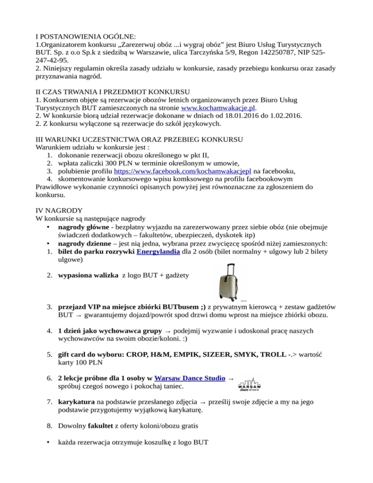 I POSTANOWIENIA OGÓLNE: 1.Organizatorem konkursu „Zarezerwuj obóz ...i wygraj obóz” jest Biuro Usług Turystycznych BUT. Sp. z o.o Sp.k z siedzibą w Warszawie, ulica Tarczyńska 5/9, Regon 142250787, NIP 525247-42-95. 2. Niniejszy regulamin określa zasady udziału w konkursie, zasady przebiegu konkursu oraz zasady przyznawania nagród. II CZAS TRWANIA I PRZEDMIOT KONKURSU 1. Konkursem objęte są rezerwacje obozów letnich organizowanych przez Biuro Usług Turystycznych BUT zamieszczonych na stronie www.kochamwakacje.pl. 2. W konkursie biorą udział rezerwacje dokonane w dniach od 18.01.2016 do 1.02.2016. 2. Z konkursu wyłączone są rezerwacje do szkół językowych. III WARUNKI UCZESTNICTWA ORAZ PRZEBIEG KONKURSU Warunkiem udziału w konkursie jest : 1. dokonanie rezerwacji obozu określonego w pkt II, 2. wpłata zaliczki 300 PLN w terminie określonym w umowie, 3. polubienie profilu https://www.facebook.com/kochamwakacjepl na facebooku, 4. skomentowanie konkursowego wpisu komksowego na profilu facebookowym Prawidłowe wykonanie czynności opisanych powyżej jest równoznaczne za zgłoszeniem do konkursu. IV NAGRODY W konkursie są następujące nagrody • nagrody główne - bezpłatny wyjazdu na zarezerwowany przez siebie obóz (nie obejmuje świadczeń dodatkowych – fakultetów, ubezpieczeń, dyskotek itp) • nagrody dzienne – jest nią jedna, wybrana przez zwycięzcę spośród niżej zamieszonych: 1. bilet do parku rozrywki Energylandia dla 2 osób (bilet normalny + ulgowy lub 2 bilety ulgowe) 2. wypasiona walizka z logo BUT + gadżety 3. przejazd VIP na miejsce zbiórki BUTbusem ;) z prywatnym kierowcą + zestaw gadżetów BUT → gwarantujemy dojazd/powrót spod drzwi domu wprost na miejsce zbiórki obozu. 4. 1 dzień jako wychowawca grupy → podejmij wyzwanie i udoskonal pracę naszych wychowawców na swoim obozie/koloni. :) 5. gift card do wyboru: CROP, H&M, EMPIK, SIZEER, SMYK, TROLL -.> wartość karty 100 PLN 6. 2 lekcje próbne dla 1 osoby w Warsaw Dance Studio → spróbuj czegoś nowego i pokochaj taniec. 7. karykatura na podstawie przesłanego zdjęcia → prześlij swoje zdjęcie a my na jego podstawie przygotujemy wyjątkową karykaturę. 8. Dowolny fakultet z oferty koloni/obozu gratis • każda rezerwacja otrzymuje koszulkę z logo BUT V ZASADY PRZYZNAWANIA I SPOSÓB WYDAWANIA NAGRÓD W KONKURSIE 1. Warunkiem otrzymania nagrody jest wpłata zaliczki w wysokości 300 PLN na rezerwację. 2. Nagrody dzienne Zostaną wybrane przez Komisję Konkursową spośród wszystkich prawidłowych wpisów (komentarzy) na profilu facebookowym zamieszczonych danego dnia i spełniających warunki określone w pkt III. Wyniki konkursu na nagrodę dzienną zostaną ogłoszone następnego dnia do godziny 12.00 na profilu facebookowym. 3. Nagrody główne Zostaną wybrane przez Komisję Konkursową w poniedziałki 25.01, 1.02, 8.02.2016 spośród wszystkich prawidłowych wpisów (komentarzy) na profilu facebookowym zamieszczonych w poprzedzającym dany poniedziałek tygodniu (od poniedziałku do niedzieli włącznie) i spełniających warunki określone w pkt III. Wyniki konkursu na nagrodę główną zostaną ogłoszone następnego dnia do godziny 12.00 na profilu facebookowym. 4. Nagrody przyzna komisja konkursowa składająca się z 3 osób i wyłoni najlepszy wpis. 5. Organizator w przeciągu 5 dni od wyłonienia zwycięzcy i przyznania nagrody dziennej bądź głównej skontaktuje się z każdym laureatem i poinformuje telefonicznie lub mailem o wygranej. VI POSTANOWIENIA DODATKOWE 1. Zdobywca nagrody dziennej lub głównej wyraża zgodę na zamieszczenie tej informacji oraz jego danych osobowych (imię, nazwisko, miasto, wykupiony obóz) na profilu facebookowym oraz na stronach internetowych Organizatora. 2. Zgłoszenie udziału w konkursie poprzez wykonanie czynności określonych w pkt. III jest równoznaczne z akceptacją niniejszego regulaminu konkursu.