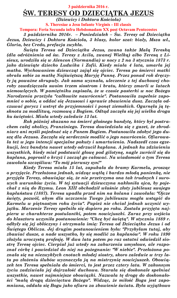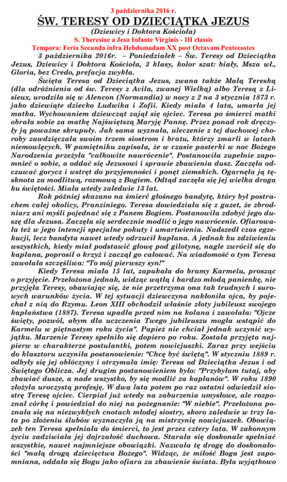 3 października 2016 r. ŚW. TERESY OD DZIECIĄTKA JEZUS (Dziewicy i Doktora Kościoła) S. Theresiae a Jesu Infante Virginis - III classis Tempora: Feria Secunda infra Hebdomadam XX post Octavam Pentecostes 3 października 2016r. – Poniedziałek – Św. Teresy od Dzieciątka Jezus, Dziewicy i Doktora Kościoła, 3 klasy, kolor szat: biały, Msza wł., Gloria, bez Credo, prefacja zwykła. Święta Teresa od Dzieciątka Jezus, zwana także Małą Tereską (dla odróżnienia od św. Teresy z Avila, zwanej Wielką) albo Teresą z Lisieux, urodziła się w Alencon (Normandia) w nocy z 2 na 3 stycznia 1873 r. jako dziewiąte dziecko Ludwika i Zofii. Kiedy miała 4 lata, umarła jej matka. Wychowaniem dziewcząt zajął się ojciec. Teresa po śmierci matki obrała sobie za matkę Najświętszą Maryję Pannę. Przez ponad rok dręczyły ją poważne skrupuły. Jak sama wyznała, uleczenie z tej duchowej choroby zawdzięczała swoim trzem siostrom i bratu, którzy zmarli w latach niemowlęcych. W pamiętniku zapisała, że w czasie pasterki w noc Bożego Narodzenia przeżyła "całkowite nawrócenie". Postanowiła zupełnie zapomnieć o sobie, a oddać się Jezusowi i sprawie zbawienia dusz. Zaczęła odczuwać gorycz i wstręt do przyjemności i ponęt ziemskich. Ogarnęła ją tęsknota za modlitwą, rozmową z Bogiem. Odtąd zaczęła się jej wielka droga ku świętości. Miała wtedy zaledwie 13 lat. Rok później skazano na śmierć głośnego bandytę, który był postrachem całej okolicy, Pranziniego. Teresa dowiedziała się z gazet, że zbrodniarz ani myśli pojednać się z Panem Bogiem. Postanowiła zdobyć jego duszę dla Jezusa. Zaczęła się serdecznie modlić o jego nawrócenie. Ofiarowała też w jego intencji specjalne pokuty i umartwienia. Nadszedł czas egzekucji, lecz bandyta nawet wtedy odrzucił kapłana. A jednak ku zdziwieniu wszystkich, kiedy miał podstawić głowę pod gilotynę, nagle zwrócił się do kapłana, poprosił o krzyż i zaczął go całować. Na wiadomość o tym Teresa zawołała szczęśliwa: "To mój pierwszy syn!" Kiedy Teresa miała 15 lat, zapukała do bramy Karmelu, prosząc o przyjęcie. Przełożona jednak, widząc wątłą i bardzo młodą panienkę, nie przyjęła Teresy, obawiając się, że nie przetrzyma ona tak trudnych i surowych warunków życia. W tej sytuacji dziewczyna nakłoniła ojca, by pojechał z nią do Rzymu. Leon XIII obchodził właśnie złoty jubileusz swojego kapłaństwa (1887). Teresa upadła przed nim na kolana i zawołała: "Ojcze święty, pozwól, abym dla uczczenia Twego jubileuszu mogła wstąpić do Karmelu w piętnastym roku życia". Papież nie chciał jednak uczynić wyjątku. Marzenie Teresy spełniło się dopiero po roku. Została przyjęta najpierw w charakterze postulantki, potem nowicjuszki. Zaraz przy wejściu do klasztoru uczyniła postanowienie: "Chcę być świętą". W styczniu 1889 r. odbyły się jej obłóczyny i otrzymała imię: Teresa od Dzieciątka Jezus i od Świętego Oblicza. Jej drugim postanowieniem było: "Przybyłam tutaj, aby zbawiać dusze, a nade wszystko, by się modlić za kapłanów". W roku 1890 złożyła uroczystą profesję. W dwa lata potem po raz ostatni odwiedził siostrę Teresę ojciec. Cierpiał już wtedy na zaburzenia umysłowe, ale rozpoznał córkę i powiedział do niej na pożegnanie: "W niebie". Przełożona poznała się na niezwykłych cnotach młodej siostry, skoro zaledwie w trzy lata po złożeniu ślubów wyznaczyła ją na mistrzynię nowicjuszek. Obowiązek ten Teresa spełniała do śmierci, to jest przez cztery lata. W zakonnym życiu zadziwiała jej dojrzałość duchowa. Starała się doskonale spełniać wszystkie, nawet najmniejsze obowiązki. Nazwała tę drogę do doskonałości "małą drogą dziecięctwa Bożego". Widząc, że miłość Boga jest zapomniana, oddała się Bogu jako ofiara za zbawienie świata. Była wyjątkowo surowo traktowana przez przełożoną, która uważała, że dziewczyna lekkomyślnie i niepoważnie zgłosiła się do Karmelu. Jej stały uśmiech brała za lekkie traktowanie swojej profesji. Teresa cieszyła się z tych krzyży, bo widziała w nich piękny prezent, jaki może złożyć Bogu. Na rok przed śmiercią zaczęły pojawiać się u Teresy pierwsze objawy daleko już posuniętej gruźlicy: wysoka gorączka, osłabienie, zanik apetytu, a nawet krwotoki. Pierwszy krwotok zaalarmował klasztor w nocy z Wielkiego Czwartku na Wielki Piątek. Mimo to siostra Teresa spełniała nadal wszystkie zlecone jej obowiązki: mistrzyni, zakrystianki i opiekunki jednej ze starszych sióstr. Zima w roku 1896/1897 była wyjątkowo surowa, klasztor zaś był nie ogrzewany. Teresa przeżywała prawdziwe tortury. Nękał ją uciążliwy kaszel i duszność. Przełożona zlekceważyła jej stan. Nie oddano jej do infirmerii ani nie wezwano lekarza. Uczyniono to dopiero wtedy, kiedy stan był już beznadziejny. Jeszcze wówczas zastosowano wobec chorej drakońskie środki, takie jak stawianie baniek. Z poranionymi plecami i piersiami musiała iść do normalnych zajęć i pokut zakonnych, nawet do prania. Do infirmerii posłano ją dopiero w lipcu roku 1897, gdzie po kilkunastu tygodniach niezwykłych mąk 30 września 1897 roku zmarła, zapowiedziawszy: "Chcę, przebywając w niebie, czynić dobro na ziemi. Po śmierci spuszczę na nią deszcz róż". 3 klasy Szaty białe Pnp 4,8-9 Veni de Líbano, sponsa mea, veni de Líbano, veni: vulnerásti cor meum, soror mea sponsa, vulnerásti cor meum. Ps 112,1 Ps. Chwalcie, o dzieci, Pana, Laudáte, púeri, Dóminum: chwalcie imię Pańskie. V. Chwa- laudáte nomen Dómini. ła Ojcu. V. Glória Patri. ORATIO: Panie, któryś powiedział: Jeśli Dómine, qui dixisti: Nisi efsię nie staniecie jako dzieci, nie ficiámini sicut párvuli, non wejdziecie do Królestwa Niebie- intrábitis in regnum coelóskiego; prosimy Cię, daj nam tak rum: da nobis, quaesumus: naśladować pokorę i prost