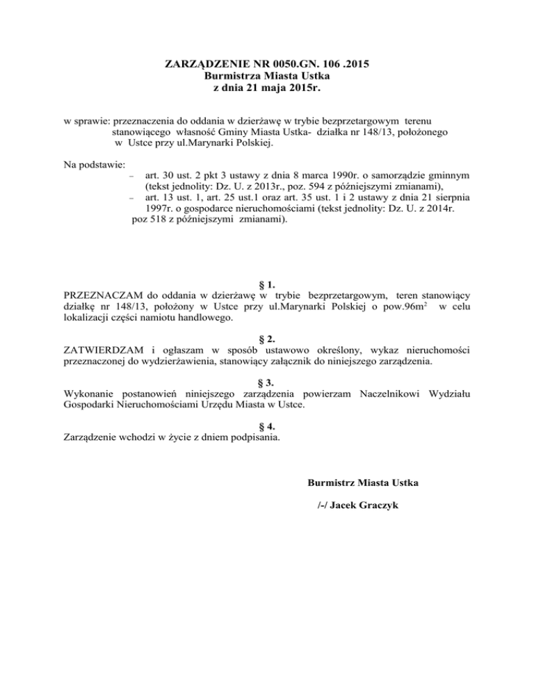 ZARZĄDZENIE NR 0050.GN. 106 .2015 Burmistrza Miasta Ustka z dnia 21 maja 2015r. w sprawie: przeznaczenia do oddania w dzierżawę w trybie bezprzetargowym terenu stanowiącego własność Gminy Miasta Ustka- działka nr 148/13, położonego w Ustce przy ul.Marynarki Polskiej. Na podstawie: art. 30 ust. 2 pkt 3 ustawy z dnia 8 marca 1990r. o samorządzie gminnym (tekst jednolity: Dz. U. z 2013r., poz. 594 z późniejszymi zmianami), art. 13 ust. 1, art. 25 ust.1 oraz art. 35 ust. 1 i 2 ustawy z dnia 21 sierpnia 1997r. o gospodarce nieruchomościami (tekst jednolity: Dz. U. z 2014r. poz 518 z późniejszymi zmianami). § 1. PRZEZNACZAM do oddania w dzierżawę w trybie bezprzetargowym, teren stanowiący działkę nr 148/13, położony w Ustce przy ul.Marynarki Polskiej o pow.96m2 w celu lokalizacji części namiotu handlowego. § 2. ZATWIERDZAM i ogłaszam w sposób ustawowo określony, wykaz nieruchomości przeznaczonej do wydzierżawienia, stanowiący załącznik do niniejszego zarządzenia. § 3. Wykonanie postanowień niniejszego zarządzenia powierzam Naczelnikowi Wydziału Gospodarki Nieruchomościami Urzędu Miasta w Ustce. § 4. Zarządzenie wchodzi w życie z dniem podpisania. Burmistrz Miasta Ustka /-/ Jacek Graczyk Załącznik do zarządzenia nr 0050.GN.106.2015 Burmistrza Miasta Ustka z dnia 21 maja 2015r. WYKAZ nieruchomości przeznaczonej do wydzierżawienia Oznaczenie nieruchomośc i wg ewidencji gruntów nr KW 1 Opis przedmiotu dzierżawy Opis nieruchomości Przeznaczenie nieruchomości i sposób jej zagospodarowania Czynsz dzierżawny Okres dzierżawy 2 3 4 5 6 Działka nr 148/13 ul.Marynarki Polskiej Teren niezabudowany o pow.96 m2 przeznaczony na posadowienie części namiotu handlowego. KW SL1S/000395 20/2 m.p.z.p Działka o pow.96 m2 niezabudowana „CENTRUM 2”- 19 MU położona przy ul.Marynarki Funkcja podstawowa: Polskiej 74. - zabudowa mieszkaniowousługowa. Funkcja dopuszczalna: - usługi nieuciążliwe, niezbędne elementy infrastruktury technicznej. Funkcje wykluczone: - wolno stojące magazyny, wolno stojące garaże i budynki gospodarcze. Czynsz dzierżawny liczony według stawki 3,27zł za m2 pow. dzierżawy w stosunku miesięcznym wynosi: 313,82 zł netto/m-c + 23% VAT, płatny do 15-go każdego miesiąca trwania umowy. Burmistrz Miasta Ustka /-/ Jacek Graczyk Do 31 grudnia 2015r.