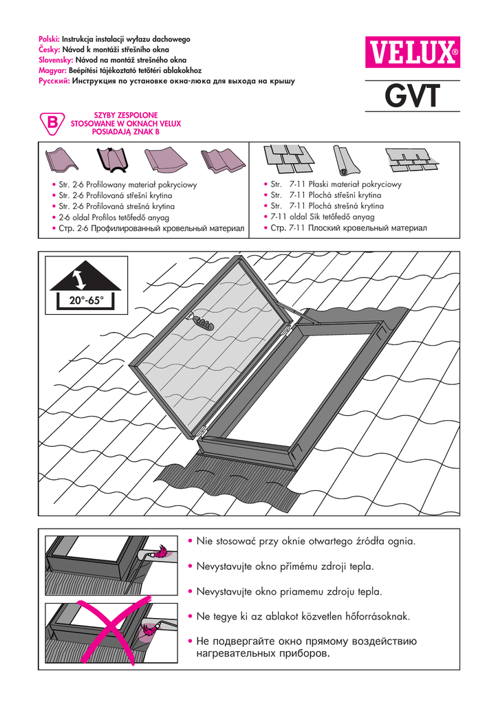 Polski: Instrukcja instalacji wy≥azu dachowego »esky: N·vod k mont·æi st¯eπnÌho okna Slovensky: N·vod na mont·æ streπnÈho okna Magyar: BeÈpÌtÈsi t·jÈkoztatÛ tetıtÈri ablakokhoz Русский: Инструкция по установке окна-люка для выхода на крышу SZYBY ZESPOLONE STOSOWANE W OKNACH VELUX POSIADAJ° ZNAK B • • • • • Str. 2-6 Profilowany materia≥ pokryciowy Str. 2-6 Profilovan· st¯eπnÌ krytina Str. 2-6 Profilovan· streπn· krytina 2-6 oldal Profilos tetıfedı anyag тр. 2-6 рофилированный кровельный материал • • • • • GVT Str. 7-11 P≥aski materia≥ pokryciowy Str. 7-11 Ploch· st¯eπnÌ krytina Str. 7-11 Ploch· streπn· krytina 7-11 oldal SÌk tetıfedı anyag тр. 7-11 лоский кровельный материал 20°-65° • Nie stosowaÊ przy oknie otwartego ºrÛd≥a ognia. • Nevystavujte okno p¯ÌmÈmu zdroji tepla. • Nevystavujte okno priamemu zdroju tepla. • Ne tegye ki az ablakot kˆzvetlen hıforr·soknak. • е подвергайте окно прямому воздействию нагревательных приборов. • Montaø okna w dachu krokwiowym pokrytym profilowanym materia≥em dachowym o profilu maksimum 60 mm • Lat‘ov·nÌ s profilovanou st¯eπnÌ krytinou do max. v˝πky 60 mm • Latovanie s profilovanou streπnou krytinou, max. do v˝πky 60 mm • Szaruf·s tetıszerkezet profilos tetıfedı anyaggal; max. 60 mm • Стропильная конструкция с профилированным кровельным материалом, максимальная высота профиля 60 мм 1a Polski: Rysunek przedstawia konstruk- 1a min . 93 0m m ma x. 1 030 mm cjÍ dachu bez izolacji przeciwwilgociowej. Pokrycie dachowe ≥±cznie z warstw± izolacji przedstawiono na stronie 12. Okno przymocowuje siÍ wprost do ≥at (lub wymianÛw). Naleøy sprawdziÊ czy no∂na (dolna) ≥ata nie jest ≥±czona pomiÍdzy kilkoma s±siednimi krokwiami. No∂n± ≥atÍ przybija siÍ dwoma gwoºdziami do kaødej krokwi. W miarÍ potrzeby u gÛry nad oknem naleøy przymocowaÊ ≥atÍ wspieraj±c±. »esky: Na obr·zku je zn·zornÏna konstrukce st¯eπnÌho pl·πtÏ bez podst¯eπnÌ fÛlie. St¯eπnÌ pl·πt’ s podst¯eπnÌ fÛliÌ viz str. 12. Okno p¯ipevnÏte p¯Ìmo na st¯eπnÌ latÏ. ZajistÏte, aby spodnÌ nosn· lat’ probÌhala spojitÏ p¯es sousedÌcÌ krokve. P¯ipevnÏte ji k obÏma krokvÌm dvÏma h¯ebÌky. Je-li pot¯eba, umÌstÏte na hornÌ stranÏ otvoru podp˘rnou lat’. 630 mm Русский: а рисунке показана 60 -1 50 m m m in .1 5 Magyar: Az ábra az alátétfólia nélkül épülő tetőszerkezetet mutatja be. Alátétfóliás szerkezetre vonatkozó információt a 12. oldalon talál. Rögzítse az ablakot közvetlenül a tetőlécekre. Győződjön meg arról, hogy a teherhordó (alsó) léc nincs toldva a szaruállásban. Rögzítse a teherhordó lécet két-két szöggel mindkét szarufához. Amennyiben szükséges, helyezzen el támasztó lécet a nyílás fölé. m m Slovensky: Na obr·zku je zn·zornen· konπtrukcia streπnÈho pl·πt’a bez podstreπnej fÛlie. Streπn˝ pl·πt’ s podstreπnou fÛliou - vid’. str. 12. Okno pripevnite priamo na streπnÈ laty. Zaistite, aby spodn· nosn· lata prebiehala nepreruπene cez susednÈ krokvy a pripevnite ju k obom krokv·m klincami. Pokial’ je to potrebnÈ, umiestnite na hornej strane otvoru podporn˙ latu. стропильная конструкция без гидроизоляционного материала. тропильная конструкция с гидроизоляционным материалом показана на странице 12. Укрепите окно прямо на обрешетку. Убедитесь, что несущий (нижний) брус обрешетки перекрывает соседние стропила. рикрепите несущий брус обрешетки с помощью двух гвоздей к каждому из стропил. ри необходимости сверху устанавливается дополнительный опорный брус обрешетки. 30-60 mm 2 • P≥yta betonowa z profilowanym materia≥em pokrycia dachu, o wysoko∂ci maksimum 60 mm • Betonov· deska s profilovanou st¯eπnÌ krytinou do max. v˝πky 60 mm • BetÛnov· doska s profilovanou streπnou krytinou, max. do v˝πky 60 mm • Beton lemezes tetőszerkezet profilos tetőfedő anyaggal, max. 60 mm • Бетонная плита с профилированным кровельным материалом, максимальная высота профиля 60 мм 1b Polski: Okno mocuje siÍ do ≥at wpuszczanych w beton. »esky: Namontujte okno p¯Ìmo na latÏ zapuπtÏnÈ do betonu. 1b Slovensky: Namontujte okno priamo na laty zapustenÈ do betÛnu. Magyar: Rögzítse az ablakot közvetlenül a betonba süllyesztett lécekre. Русский: Установите окно на 100 0m m заранее утопленные в бетоне бруски. 630 mm mm 0 -15 60 30-60 mm 3 30-60 mm Polski: Skrzyd≥o naleøy zdj±Ê w celu u≥atwienia instalacji. Wyj±Ê ogranicznik z o∂cieønicy (1). WykrÍciÊ wkrÍty w ∂rodku zawiasÛw i poluzowaÊ wkrÍty dolne (2). »esky: Pro usnadnÏnÌ mont·æe lze vyjmout k¯Ìdlo. UvolnÏte pojistnou vzpÏru z r·mu (1). Odπroubujte vruty uprost¯ed z·vÏsu a uvolnÏte vruty na spodnÌ stranÏ z·vÏs˘ (2). Slovensky: K ulÑahËeniu inπtal·cie je moænÈ vybratÑ okennÈ krÌdlo. UvolÑnite zabezpeËovaciu tyË z r·mu (1). Odstr·Úte skrutky v strednej Ëasti z·vesu a volÑnÈ skrutky na spodnej strane (2). 1 Magyar: Az egyszerűbb beépítés érdekében az ablakszárnyat ki lehet venni. Oldja el a kitámasztó kart a toktól (1). Csavarja ki a pántok közepén található 