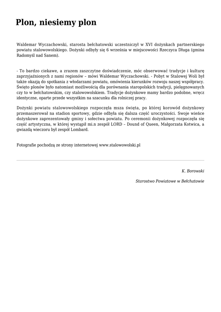 Plon, niesiemy plon Waldemar Wyczachowski, starosta bełchatowski uczestniczył w XVI dożynkach partnerskiego powiatu stalowowolskiego. Dożynki odbyły się 6 września w miejscowości Rzeczyca Długa (gmina Radomyśl nad Sanem). - To bardzo ciekawe, a zrazem zaszczytne doświadczenie, móc obserwować tradycje i kulturę zaprzyjaźnionych z nami regionów – mówi Waldemar Wyczachowski. - Pobyt w Stalowej Woli był także okazją do spotkania z włodarzami powiatu, omówienia kierunków rozwoju naszej współpracy. Święto plonów było natomiast możliwością dla porównania staropolskich tradycji, pielęgnowanych czy to w bełchatowskim, czy stalowowolskiem. Tradycje dożynkowe mamy bardzo podobne, wręcz identyczne, oparte przede wszystkim na szacunku dla rolniczej pracy. Dożynki powiatu stalowowolskiego rozpoczęła msza święta, po której korowód dożynkowy przemaszerował na stadion sportowy, gdzie odbyła się dalsza część uroczystości. Swoje wieńce dożynkowe zaprezentowały gminy i sołectwa powiatu. Po ceremonii dożynkowej rozpoczęła się część artystyczna, w której wystąpił mi.n zespół LORD – Dound of Queen, Małgorzata Kotwica, a gwiazdą wieczoru był zespół Lombard. Fotografie pochodzą ze strony internetowej www.stalowowolski.pl K. Borowski Starostwo Powiatowe w Bełchatowie