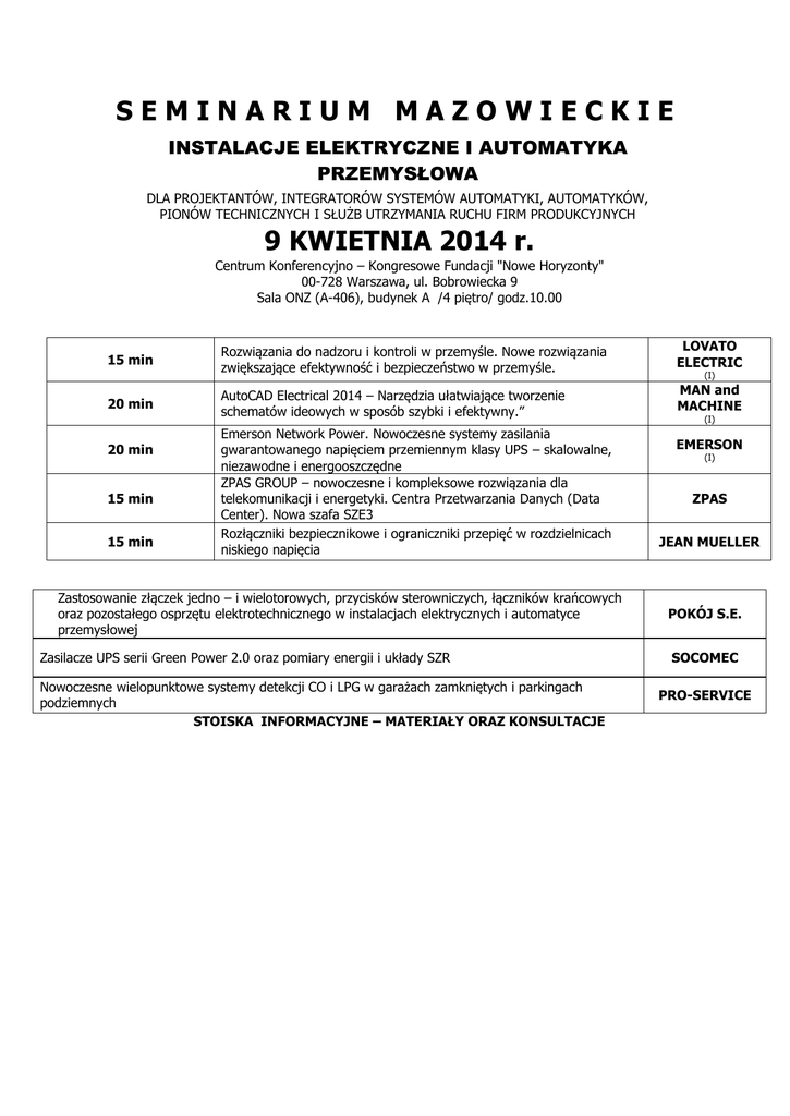 SEMINARIUM MAZOWIECKIE INSTALACJE ELEKTRYCZNE I AUTOMATYKA PRZEMYSŁOWA DLA PROJEKTANTÓW, INTEGRATORÓW SYSTEMÓW AUTOMATYKI, AUTOMATYKÓW, PIONÓW TECHNICZNYCH I SŁUŻB UTRZYMANIA RUCHU FIRM PRODUKCYJNYCH 9 KWIETNIA 2014 r. Centrum Konferencyjno – Kongresowe Fundacji "Nowe Horyzonty" 00-728 Warszawa, ul. Bobrowiecka 9 Sala ONZ (A-406), budynek A /4 piętro/ godz.10.00 15 min 20 min 20 min 15 min 15 min Rozwiązania do nadzoru i kontroli w przemyśle. Nowe rozwiązania zwiększające efektywność i bezpieczeństwo w przemyśle. LOVATO ELECTRIC AutoCAD Electrical 2014 – Narzędzia ułatwiające tworzenie schematów ideowych w sposób szybki i efektywny.” MAN and MACHINE Emerson Network Power. Nowoczesne systemy zasilania gwarantowanego napięciem przemiennym klasy UPS – skalowalne, niezawodne i energooszczędne ZPAS GROUP – nowoczesne i kompleksowe rozwiązania dla telekomunikacji i energetyki. Centra Przetwarzania Danych (Data Center). Nowa szafa SZE3 Rozłączniki bezpiecznikowe i ograniczniki przepięć w rozdzielnicach niskiego napięcia Zastosowanie złączek jedno – i wielotorowych, przycisków sterowniczych, łączników krańcowych oraz pozostałego osprzętu elektrotechnicznego w instalacjach elektrycznych i automatyce przemysłowej Zasilacze UPS serii Green Power 2.0 oraz pomiary energii i układy SZR Nowoczesne wielopunktowe systemy detekcji CO i LPG w garażach zamkniętych i parkingach podziemnych STOISKA INFORMACYJNE – MATERIAŁY ORAZ KONSULTACJE (I) (I) EMERSON (I) ZPAS JEAN MUELLER POKÓJ S.E. SOCOMEC PRO-SERVICE