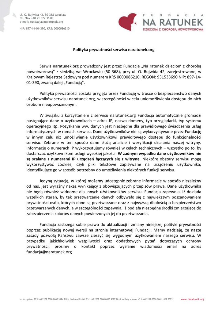 ul. O. Bujwida 42, 50-368 Wrocław tel./fax +48 71 372 36 09 e-mail: [email protected] NIP: 897-14-01-390, KRS: 0000086210 Polityka prywatności serwisu naratunek.org Serwis naratunek.org prowadzony jest przez Fundację „Na ratunek dzieciom z chorobą nowotworową” z siedzibą we Wrocławiu (50-368), przy ul. O. Bujwida 42, zarejestrowanej w Krajowym Rejestrze Sądowym pod numerem KRS 0000086210, REGON: 931533690 NIP: 897-1401-390, zwaną dalej „Fundacją”. Polityka prywatności została przyjęta przez Fundację w trosce o bezpieczeństwo danych użytkowników serwisu naratunek.org, w szczególności w celu uniemożliwienia dostępu do nich osobom nieupoważnionym. W związku z korzystaniem z serwisu naratunek.org Fundacja automatycznie gromadzi następujące dane o użytkownikach – adres IP, nazwa domeny, typ przeglądarki, typ systemu operacyjnego itp. Pozyskanie ww. danych jest niezbędne dla prawidłowego świadczenia usług informatycznych w ramach serwisu. Dane użytkowników nie są wykorzystywane przez Fundację w innym celu niż umożliwienie użytkownikowi prawidłowego dostępu do funkcjonalności serwisu. Zebrane w ten sposób dane służą analizie i weryfikacji działania naszej witryny. Informacje o numerach IP wykorzystujemy również w celach technicznych – wszystko po to, by dostarczać użytkownikom usługi wysokiej jakości. W żadnym wypadku dane użytkowników nie są scalane z numerami IP urządzeń łączących się z witryną. Niektóre obszary serwisu mogą wykorzystywać cookies, czyli pliki tekstowe zapisywane na urządzeniu użytkownika, identyfikujące go w sposób potrzebny do umożliwienia niektórych funkcji serwisu. Jedyną sytuacją, w której możemy udostępnić zebrane informacje w sposób niezależny od nas, jest wyraźny nakaz wynikający z obowiązujących przepisów prawa. Dane użytkownika nie będą również widoczne dla innych użytkowników serwisu. Fundacja zapewnia, iż dokłada wszelkich starań, by tak przetwarzanie danych odbywało się z największym poszanowaniem prywatności osób, których dane są przetwarzane oraz z najwyższą dbałością o bezpieczeństwo przetwarzanych danych, a w szczególności zapewnia, iż podjęła niezbędne środki zmierzające do zabezpieczenia zbiorów danych powierzonych jej do przetwarzania. Fundacja zastrzega sobie prawo do aktualizacji i zmiany niniejszej polityki prywatności poprzez publikację nowej wersji na stronie internetowej Fundacji. Mamy nadzieję, że nasze zasady pozwolą Państwu zawsze cieszyć się wygodnym użytkowaniem naszego serwisu. W przypadku jakichkolwiek wątpliwości oraz dodatkowych pytań dotyczących ochrony prywatności, prosimy o kontakt poprzez wysłanie wiadomości email na adres [email protected] konto ogólne: 97 1160 2202 0000 0000 9394 2103, budowa Kliniki: 73 1160 2202 0000 0000 9627 7810, wpłaty w euro: 43 1160 2202 0000 0001 1862 8023 www.naratunek.org