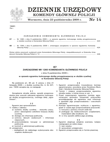 Dziennik Urzędowy Komendy Głównej Policji Nr 14 DZIENNIK URZĘDOWY Poz. 67 ⎯ 423 ⎯ KOMENDY GŁÓWNEJ POLICJI Warszawa, dnia 23 października 2009 r. Nr 14 , , TRESC: Poz.: ZARZĄDZENIA KOMENDANTA GŁÓWNEGO POLICJI 67 ⎯ Nr 1260 z dnia 9 października 2009 r. w sprawie egzaminu kończącego służbę przygotowawczą w służbie cywilnej w Komendzie Głównej Policji ............................................................................. 423 68 ⎯ Nr 1264 z dnia 8 października 2009 r. zmieniające zarządzenie w sprawie regulaminu Komendy Głównej Policji ........................................................................................................................ 424 Wykaz aktów prawnych wydanych przez Komendanta Głównego Policji, nieopublikowanych w Dzienniku Urzędowym Komendy Głównej Policji nr 14 ..................................................................................................... 426 67 ZARZĄDZENIE NR 1260 KOMENDANTA GŁÓWNEGO POLICJI z dnia 9 października 2009 r. w sprawie egzaminu kończącego służbę przygotowawczą w służbie cywilnej w Komendzie Głównej Policji Na podstawie art. 36 ust. 5 ustawy z dnia 21 listopada 2008 r. o służbie cywilnej (Dz. U. Nr 227, poz. 1505) zarządza się, co następuje: §1 Zarządzenie określa zakres, sposób przeprowadzania oraz warunki zaliczenia egzaminu kończącego służbę przygotowawczą, zwanego dalej „egzaminem”. §2 Egzamin jest sprawdzianem: 1) wiedzy z zakresu: a) systemu służby cywilnej – stosunku pracy, praw i obowiązków członków korpusu służby cywilnej, b) dostępu do informacji publicznej, c) ochrony danych osobowych i informacji niejawnych, d) przeciwdziałania korupcji w administracji publicznej, e) kontroli w administracji publicznej, 2) umiejętności – niezbędnych do należytego wykonywania obowiązków służbowych. 1. 2. 3. 4. §3 Egzamin przeprowadza trzyosobowa komisja egzaminacyjna, powołana przez Dyrektora Biura Kadr i Szkolenia Komendy Głównej Policji. Termin i miejsce przeprowadzenia egzaminu określa osoba, o której mowa w ust. 1. Przed rozpoczęciem egzaminu komisja egzaminacyjna sprawdza tożsamość pracownika przystępującego do egzaminu oraz informuje o sposobie jego przeprowadzenia i warunkach zaliczenia. Komisja egzaminacyjna wyklucza z egzaminu, jeżeli w czasie jego przeprowadzania pracownik: 1) korzysta z pomocy innych osób lub 2) posługuje się niedozwolonymi urządzeniami, materiałami albo środkami, lub 3) w inny sposób zakłóca jego przebieg. §4 1. Egzamin obejmuje odrębnie oceniane, kolejno następujące po sobie etapy: 1) test wiedzy; 2) sprawdzian umiejętności. 2. Egzamin przeprowadza się w formie pisemnej. Dziennik Urzędowy Komendy Głównej Policji Nr 14 Poz. 67, 68 ⎯ 424 ⎯ 3. Test wiedzy zawiera 30 pytań testowych i trwa 30 minut. Za każdą prawidłową odpowiedź pracownik zdający egzamin otrzymuje 1 punkt, za odpowiedź nieprawidłową lub jej brak – 0 punktu. 4. Do sprawdzianu umiejętności komisja egzaminacyjna dopuszcza pracownika zdającego egzamin, jeżeli z testu wiedzy uzyskał co najmniej 18 punktów. 5. Sprawdzian umiejętności polega na rozwiązaniu jednego zadania ocenianego w skali od 0 do 15 punktów. Warunkiem zaliczenia tego etapu egzaminu jest uzyskanie co najmniej 9 punktów. 6. Test wiedzy i sprawdzian umiejętności opracowuje komórka organizacyjna Komendy Głównej Policji właściwa w sprawach szkolenia, na podstawie propozycji przygotowywanych przez dyrektorów biur lub równorzędnych komórek organizacyjnych Komendy Głównej Policji. 7. Warunkiem zaliczenia egzaminu jest uzyskanie przez pracownika zdającego egzamin co najmniej 27 punktów. 8. O wynikach egzaminu komisja egzaminacyjna powiadamia pracowników zdających egzamin w dniu jego przeprowadzenia. 3. Egzamin poprawkowy obejmuje etapy egzaminu, z których pracownik zdający egzamin nie uzyskał wymaganej liczby punktów. 4. Do egzaminu poprawkowego stosuje się odpowiednio przepisy § 3 i 4. §6 1. Z przeprowadzonego egzaminu komisja egzaminacyjna sporządza protokół, który powinien zawierać określenie składu komisji egzaminacyjnej, imiona i nazwiska pracowników przystępujących do egzaminu oraz wyniki egzaminu. 2. Na podstawie protokołu, o którym mowa w ust. 1, Dyrektor Biura Kadr i Szkolenia Komendy Głównej Policji wydaje pracownikowi zaświadczenie o wyniku egzaminu. 3. Zaświadczenie, o którym mowa w ust. 2, włącza się do akt osobowych pracownika. §7 Traci moc decyzja nr 745 Komendanta Głównego Policji z dnia 15 października 2007 r. w sprawie programu służby przygotowawczej dla pracowników służby cywilnej (Dz. Urz. KGP Nr 19, poz. 142). §8 Zarządzenie wchodzi w życie z dniem podpisania. §5 1. W przypadku niezaliczenia egzaminu pracownik ma prawo przystąpić do egzaminu poprawkowego. 2. Egzamin poprawkowy przeprowadza się w terminie od 7 do 14 dni od daty egzaminu, o którym mowa w § 4. Komendant Główny Policji gen. insp. Andrzej Matejuk 68 ZARZĄDZENIE NR 1264 KOMENDANTA GŁÓWNEGO POLICJI z dnia 8 października 2009 r. zmieniające zarządzenie w sprawie regulaminu Komendy Głównej Policji Na podstawie art. 7 ust. 4 ustawy z dnia 6 kwietnia 1990 r. o Policji (Dz. U. z 2007 r. Nr 43, poz. 277, z późn. zm.1)) zarządza się, co następuje: §1 W zarządzeniu nr 372 Komendanta Głównego Policji z dnia 14 kwietnia 2008 r. w sprawie regulaminu Komendy Głównej Policji (Dz. Urz. KGP Nr 8, poz. 47 oraz z 2009 r. Nr 2, poz. 9) wpro- 1) Zmiany tekstu jednolitego wymienionej ustawy zostały ogłoszone w Dz. U. z 2007 r. Nr 57, poz. 390, Nr 120, poz. 818, Nr 140, poz. 981 i Nr 165, poz. 1170, z 2008 r. Nr 86, poz. 521, Nr 171, poz. 1065 i Nr 237, poz. 1651 oraz z 2009 r. Nr 22, poz. 120, Nr 62, poz. 504, Nr 85, poz. 716, Nr 97, poz. 803, Nr 98, poz. 817 i Nr 115, poz.959. wadza się następujące zmiany: 1) w § 9 uchyla się ust. 3; 2) w § 12: a) w ust. 1 uchyla się pkt 3, b) w