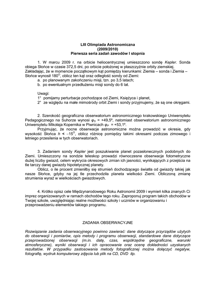 LIII Olimpiada Astronomiczna (2009/2010) Pierwsza seria zadań zawodów I stopnia 1. W marcu 2009 r. na orbicie heliocentrycznej umieszczono sondę Kepler. Sonda obiega Słońce w czasie 372,5 dni, po orbicie położonej w płaszczyźnie orbity ziemskiej. Zakładając, że w momencie początkowym kąt pomiędzy kierunkami: Ziemia – sonda i Ziemia – Słońce wynosił 180O, oblicz ten kąt oraz odległość sondy od Ziemi: a. po planowanym zakończeniu misji, tzn. po 3,5 latach; b. po ewentualnym przedłużeniu misji sondy do 6 lat. Uwagi: 1° pomijamy perturbacje pochodzące od Ziemi, Księżyca i planet, 2° ze względu na małe mimośrody orbit Ziemi i sondy przyjmujemy, że są one okręgami. 2. Szerokość geograficzna obserwatorium astronomicznego krakowskiego Uniwersytetu Pedagogicznego na Suhorze wynosi φS = +49,5º, natomiast obserwatorium astronomicznego Uniwersytetu Mikołaja Kopernika w Piwnicach φP = +53,1º. Przyjmując, że nocne obserwacje astronomiczne można prowadzić w okresie, gdy wysokość Słońca h < −15O, oblicz różnicę pomiędzy takimi okresami podczas zimowego i letniego przesilenia w tych obserwatoriach. 3. Zadaniem sondy Kepler jest poszukiwanie planet pozasłonecznych podobnych do Ziemi. Umieszczony na sondzie teleskop prowadzi równoczesne obserwacje fotometryczne dużej liczby gwiazd, celem wykrycia okresowych zmian ich jasności, wynikających z przejścia na tle tarczy danej gwiazdy hipotetycznej planety. Oblicz, o ile procent zmieniłby się strumień dochodzącego światła od gwiazdy takiej jak nasze Słońce, gdyby na jej tle przechodziła planeta wielkości Ziemi. Obliczoną zmianę strumienia wyraź w wielkościach gwiazdowych. 4. Krótko opisz cele Międzynarodowego Roku Astronomii 2009 i wymień kilka znanych Ci imprez organizowanych w ramach obchodów tego roku. Zaproponuj program takich obchodów w Twojej szkole, uwzględniając realne możliwości szkoły i uczniów w organizowaniu i przeprowadzeniu elementów takiego programu. ZADANIA OBSERWACYJNE Rozwiązanie zadania obserwacyjnego powinno zawierać: dane dotyczące przyrządów użytych do obserwacji i pomiarów, opis metody i programu obserwacji, standardowe dane dotyczące przeprowadzonej obserwacji (m.in. datę, czas, współrzędne geograficzne, warunki atmosferyczne), wyniki obserwacji i ich opracowanie oraz ocenę dokładności uzyskanych rezultatów. W przypadku zastosowania metody fotograficznej można dołączyć negatyw, fotografię, wydruk komputerowy zdjęcia lub plik na CD, DVD itp. 1. Skontroluj prawidłowość wskazań zegara słonecznego znajdującego się w Twojej lub pobliskiej miejscowości. W tym celu dokonaj odczytu wskazań zegara słonecznego w różnych momentach czasu urzędowego i porównaj te wskazania z obliczonym lokalnym czasem prawdziwym słonecznym dla tych momentów. Skomentuj otrzymane wyniki. Swoje obserwacje udokumentuj fotograficznie. 2. Sfotografuj (co najmniej dwukrotnie) planetoidę (3) Juno, która od początku września do połowy października będzie widoczna przez całą noc, osiągając w opozycji 18 września 2009 roku jasnosć 7,7m. Wcześniej wyznacz realny zasięg (w wielkościach gwiazdowych) przyrządu, który posłuży Ci do wykonania zdjęć. Na każdym ze zdjęć zaznacz strzałkami zidentyfikowane jaśniejsze gwiazdy oraz planetoidę. Poniższa tabelka zawiera trzy przewidywane w tym czasie pozycje planetoidy. Data α2000 h δ2000 8 września 2009 0 08 m -1O05’ 18 września 2009 0h02m -3O11’ 18 października 2009 23h44m -9O03’ 3. Jako rozwiązanie zadania obserwacyjnego można również nadesłać opracowane wyniki innych własnych obserwacji prowadzonych w ostatnim roku. Rozwiązanie jednego zadania obserwacyjnego należy nadesłać wraz z rozwiązaniami drugiej serii zadań zawodów I stopnia – do dnia 16 listopada 2009 r.