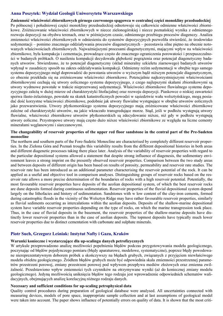 Anna Poszytek: Wydział Geologii Uniwersytetu Warszawskiego Zmienność właściwości zbiornikowych górnego czerwonego spągowca w centralnej części monokliny przedsudeckiej Po północnej i południowej części monokliny przedsudeckiej odnotowuje się całkowicie odmienne właściwości zbiornikowe. Zróżnicowanie właściwości zbiornikowych w niecce zielonogórskiej i niecce poznańskiej wynika z odmiennego rozwoju depozycji na obydwu terenach, oraz w późniejszym czasie, odmiennego przebiegu procesów diagenezy. Analiza zmienności właściwości zbiornikowych w odniesieniu do systemów depozycyjnych pozwoliła stwierdzić, że środowisko sedymentacji – pomimo znacznego oddziaływania procesów diagenetycznych – pozostawia silne piętno na obecnie notowanych właściwościach zbiornikowych. Najważniejszymi procesami diagenetycznymi, mającymi wpływ na właściwości zbiornikowe, była kompakcja i cementacja, prowadzące często do znacznego ograniczenia porowatości i przepuszczalności w badanych próbkach. O nasileniu kompakcji decydowała głębokość pogrążenia oraz potencjał diagenetyczny badanych utworów. Stwierdzono, że to potencjał diagenetyczny (skład mineralny szkieletu ziarnowego) badanych utworów wpłynął w zasadniczy sposób na zakres oddziaływania kompakcji. Odmienny reżim sedymentacji w obrębie tego samego systemu depozycyjnego mógł doprowadzić do powstania utworów o wyższym bądź niższym potencjale diagenetycznym, co obecnie przekłada się na zróżnicowane właściwości zbiornikowe. Potencjalnie najkorzystniejszymi właściwościami zbiornikowymi cechują się utwory eolicznego systemu depozycyjnego, z czego najlepszymi skałami zbiornikowymi są utwory wydmowe powstałe w trakcie nieprzerwanej sedymentacji. Właściwości zbiornikowe fluwialnego systemu depozycyjnego zależą w dużej mierze od charakterystyki litofacjalnej oraz rozwoju depozycji. Piaskowce o niskiej zawartości spoiwa ilasto-żelazistego, powstałe na skutek katastroficznych powodzi w sąsiedztwie wału wolsztyńskiego, mogą posiadać dość korzystne właściwości zbiornikowe, podobnie jak utwory fluwialne występujące w obrębie utworów eolicznych jako przewarstwienia. Utwory płytkomorskiego systemu depozycyjnego mają zróżnicowane właściwości zbiornikowe zależne od charakterystyki utworów, na jakie wkraczało transgredujące morze. Stąd, jeśli w podłożu występują utwory fluwialne, właściwości zbiornikowe utworów płytkomorskich są zdecydowanie niższe, niż gdy w podłożu występują utwory eoliczne. Przystropowe utwory mają często dużo niższe właściwości zbiornikowe ze względu na liczne cementy minerałami węglanowymi i siarczanowymi. The changeability of reservoir properties of the upper red floor sandstone in the central part of the Pre-Sudeten monocline The northern and southern parts of the Fore-Sudetic Monocline are characterised by completely different reservoir properties. In the Zielona Góra and Poznań troughs this variability results from the different depositional histories in both areas and different diagenetic processes taking there place later. Analysis of the variability of reservoir properties with regard to the particular depositional systems allowed a statement that despite strong influence of diagenesis, the sedimentary environment leaves a strong imprint on the presently observed reservoir properties. Comparison between the two study areas and between deposits of different origin has been based on results of porosity, permeability and reservoir rate studies. The reservoir rate has been introduced as an additional parameter characterising the reservoir potential of the rock. It can be applied as a useful and objective tool in comparison analyses. Distinguishing groups of reservoir rocks based on the reservoir rate allows a more precise determination of the boundaries of rocks with a high reservoir potential. Potentially, the most favourable reservoir properties have deposits of the aeolian depositional system, of which the best reservoir rocks are dune deposits formed during continuous sedimentation. Reservoir properties of the fluvial depositional system depend largely on the lithofacies and history of sedimentation. Sandstones with w low content of the clay-iron cements, formed during catastrophic floods in the vicinity of the Wolsztyn Ridge may have rather favourable reservoir properties, similarly as fluvial sediments occurring as intercalations within the aeolian deposits. Deposits of the shallow-marine depositional system have variable reservoir properties depending on the type of rocks, on which the marine transgression took place. Thus, in the case of fluvial deposits in the basement, the reservoir properties of the shallow-marine deposits have distinctly lower reservoir properties than in the case of aeolian deposits. The topmost deposits have typically much lower reservoir properties due to distinct cementation with carbonate and sulphate minerals. Piotr Such, Grzegorz Leśniak: Instytut Nafty i Gazu, Kraków Warunki konieczne i wystarczające dla up-scalingu danych petrofizycznych W artykule przeprowadzono analizę możliwości popełnienia błędów podczas przygotowywania modelu geologicznego, poczynając od błędów pojedynczego pomiaru (błędy aparaturowe, modelowe, systematyczne), poprzez błędy powodowane niereprezentatywnym doborem próbek a skończywszy na błędach grubych, związanych z przyjęciem niewłaściwego modelu obiektu geologicznego. Źródłem błędów grubych może być odpowiednia skala zmienności przestrzennej parametrów przestrzeni porowej, zmiany przestrzeni porowej pod wpływem przepływu mediów złożowych oraz zmienna zwilżalność. Przedstawiono wpływ zmienności tych czynników na otrzymywane wyniki (aż do koniecznej zmiany modelu geologicznego). Jedyną możliwością uniknięcia błędów tego rodzaju jest wprowadzenie odpowiednich schematów walidacyjn