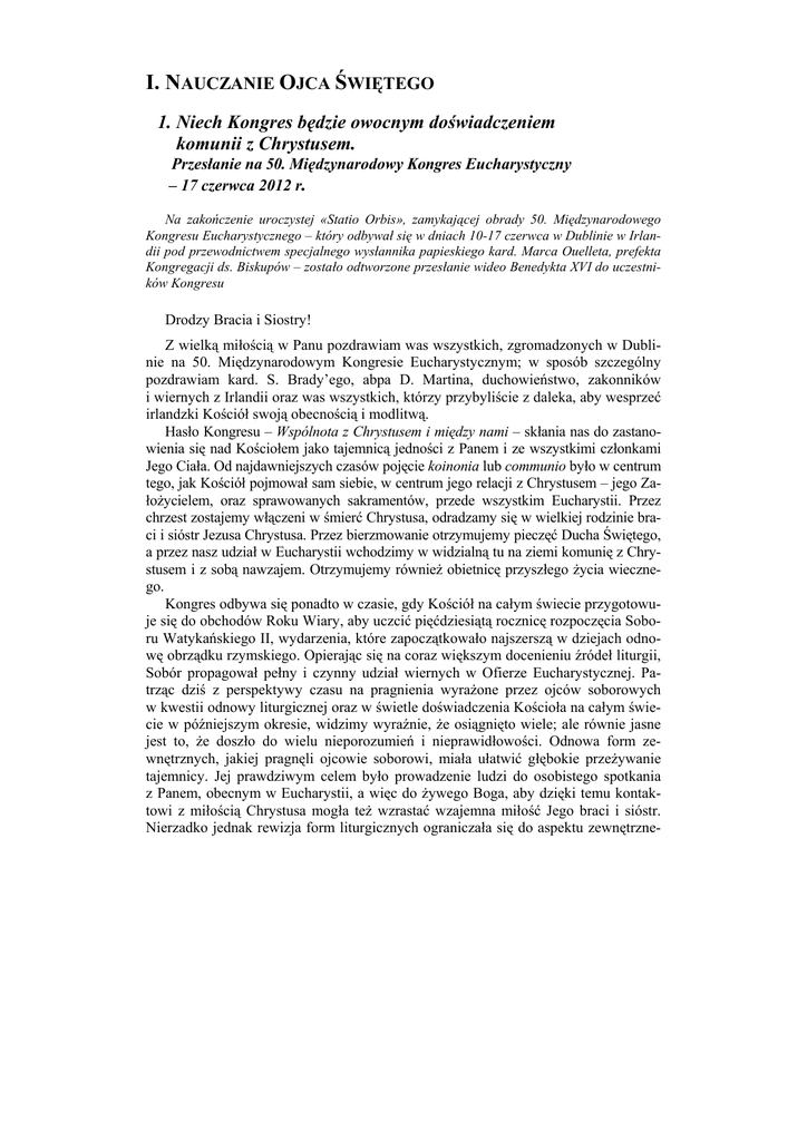 I. NAUCZANIE OJCA ŚWIĘTEGO 1. Niech Kongres będzie owocnym doświadczeniem komunii z Chrystusem. Przesłanie na 50. Międzynarodowy Kongres Eucharystyczny – 17 czerwca 2012 r. Na zakończenie uroczystej «Statio Orbis», zamykającej obrady 50. Międzynarodowego Kongresu Eucharystycznego – który odbywał się w dniach 10-17 czerwca w Dublinie w Irlandii pod przewodnictwem specjalnego wysłannika papieskiego kard. Marca Ouelleta, prefekta Kongregacji ds. Biskupów – zostało odtworzone przesłanie wideo Benedykta XVI do uczestników Kongresu Drodzy Bracia i Siostry! Z wielką miłością w Panu pozdrawiam was wszystkich, zgromadzonych w Dublinie na 50. Międzynarodowym Kongresie Eucharystycznym; w sposób szczególny pozdrawiam kard. S. Brady’ego, abpa D. Martina, duchowieństwo, zakonników i wiernych z Irlandii oraz was wszystkich, którzy przybyliście z daleka, aby wesprzeć irlandzki Kościół swoją obecnością i modlitwą. Hasło Kongresu – Wspólnota z Chrystusem i między nami – skłania nas do zastanowienia się nad Kościołem jako tajemnicą jedności z Panem i ze wszystkimi członkami Jego Ciała. Od najdawniejszych czasów pojęcie koinonia lub communio było w centrum tego, jak Kościół pojmował sam siebie, w centrum jego relacji z Chrystusem – jego Założycielem, oraz sprawowanych sakramentów, przede wszystkim Eucharystii. Przez chrzest zostajemy włączeni w śmierć Chrystusa, odradzamy się w wielkiej rodzinie braci i sióstr Jezusa Chrystusa. Przez bierzmowanie otrzymujemy pieczęć Ducha Świętego, a przez nasz udział w Eucharystii wchodzimy w widzialną tu na ziemi komunię z Chrystusem i z sobą nawzajem. Otrzymujemy również obietnicę przyszłego życia wiecznego. Kongres odbywa się ponadto w czasie, gdy Kościół na całym świecie przygotowuje się do obchodów Roku Wiary, aby uczcić pięćdziesiątą rocznicę rozpoczęcia Soboru Watykańskiego II, wydarzenia, które zapoczątkowało najszerszą w dziejach odnowę obrządku rzymskiego. Opierając się na coraz większym docenieniu źródeł liturgii, Sobór propagował pełny i czynny udział wiernych w Ofierze Eucharystycznej. Patrząc dziś z perspektywy czasu na pragnienia wyrażone przez ojców soborowych w kwestii odnowy liturgicznej oraz w świetle doświadczenia Kościoła na całym świecie w późniejszym okresie, widzimy wyraźnie, że osiągnięto wiele; ale równie jasne jest to, że doszło do wielu nieporozumień i nieprawidłowości. Odnowa form zewnętrznych, jakiej pragnęli ojcowie soborowi, miała ułatwić głębokie przeżywanie tajemnicy. Jej prawdziwym celem było prowadzenie ludzi do osobistego spotkania z Panem, obecnym w Eucharystii, a więc do żywego Boga, aby dzięki temu kontaktowi z miłością Chrystusa mogła też wzrastać wzajemna miłość Jego braci i sióstr. Nierzadko jednak rewizja form liturgicznych ograniczała się do aspektu zewnętrzne- 6 Nauczanie Ojca Świętego go, a «czynny udział» mylono z czynnościami zewnętrznymi. Dlatego wiele jeszcze pozostaje do zrobienia w zakresie prawdziwej odnowy liturgicznej. W zmienionym świecie, coraz bardziej skupionym na rzeczach materialnych, musimy nauczyć się rozpoznawania na nowo tajemniczej obecności zmartwychwstałego Pana, który jako jedyny może nadać rozmach i głębię naszemu życiu. Eucharystia jest kultem całego Kościoła, ale wymaga także pełnego zaangażowania każdego chrześcijanina w misję Kościoła. Zawiera wezwanie, aby być świętym ludem Bożym, ale również wezwanie do osobistej świętości; powinna być sprawowana z wielką radością i prostotą, a jednocześnie w sposób możliwie najbardziej godny i z szacunkiem; zachęca nas do skruchy za nasze grzechy, a także do przebaczania naszym braciom i siostrom; łączy nas w Duchu Świętym, a także poleca w tym samym Duchu nieść innym Dobrą Nowinę o zbawieniu. Co więcej, Eucharystia jest pamiątką ofiary Chrystusa na krzyżu, Jego ciała i krwi ofiarowanych w nowym i wiecznym przymierzu na odpuszczenie grzechów i przemianę świata. Irlandia była przez wieki kształtowana przez Mszę Św. na najgłębszym poziomie, a dzięki jej mocy i łasce całe pokolenia mnichów, męczenników i misjonarzy bohatersko żyły wiarą na własnej ziemi oraz głosiły Dobrą Nowinę o Bożej miłości i Bożym przebaczeniu daleko od jej wybrzeży. Jesteście dziedzicami Kościoła, który był potężną siłą dobra w świecie i który wpoił ogromnej liczbie innych ludzi głęboką i trwałą miłość do Chrystusa i Jego Świętej Matki. Wasi przodkowie w Kościele irlandzkim wiedzieli, jak dążyć do świętości i konsekwencji w życiu osobistym, jak głosić płynącą z Ewangelii radość, jak ukazywać znaczenie przynależności do Kościoła powszechnego w jedności ze Stolicą Piotrową i jak wpajać następnym pokoleniom umiłowanie wiary i chrześcijańskich cnót. Nasza wiara katolicka, przepojona głębokim poczuciem obecności Boga, urzeczona pięknem otaczającego nas stworzenia i oczyszczona przez osobistą pokutę oraz świadomość Bożego przebaczenia, jest dziedzictwem, które z pewnością jest udoskonalane i wzbogacane wtedy, gdy regularnie składane jest na ołtarzu Pana w ofierze Mszy św. Dziękczynienie i radość z powodu tak wspaniałej historii wiary i miłości zostały niedawno w straszny sposób zaburzone przez ujawnienie grzechów popełnionych przez kapłanów i osoby konsekrowane w stosunku do osób powierzonych ich opiece. Zamiast ukazywać im drogę do Chrystusa, do Boga, zamiast dawać świadectwo o Jego dobroci, dopuścili się oni wobec nich nadużyć i podważyli wiarygodność orędzia Kościoła. Jak można wytłumaczyć fakt, że grzeszyli w ten sposób ludzie, którzy regularnie przyjmowali Ciało Pańskie i wyznawali swoje grzechy w sakramencie pokuty? Pozostaje to tajemnicą. Ale widocznie ich chrześcijaństwo nie karmiło się już radosnym spotkaniem z Jezusem Chryst