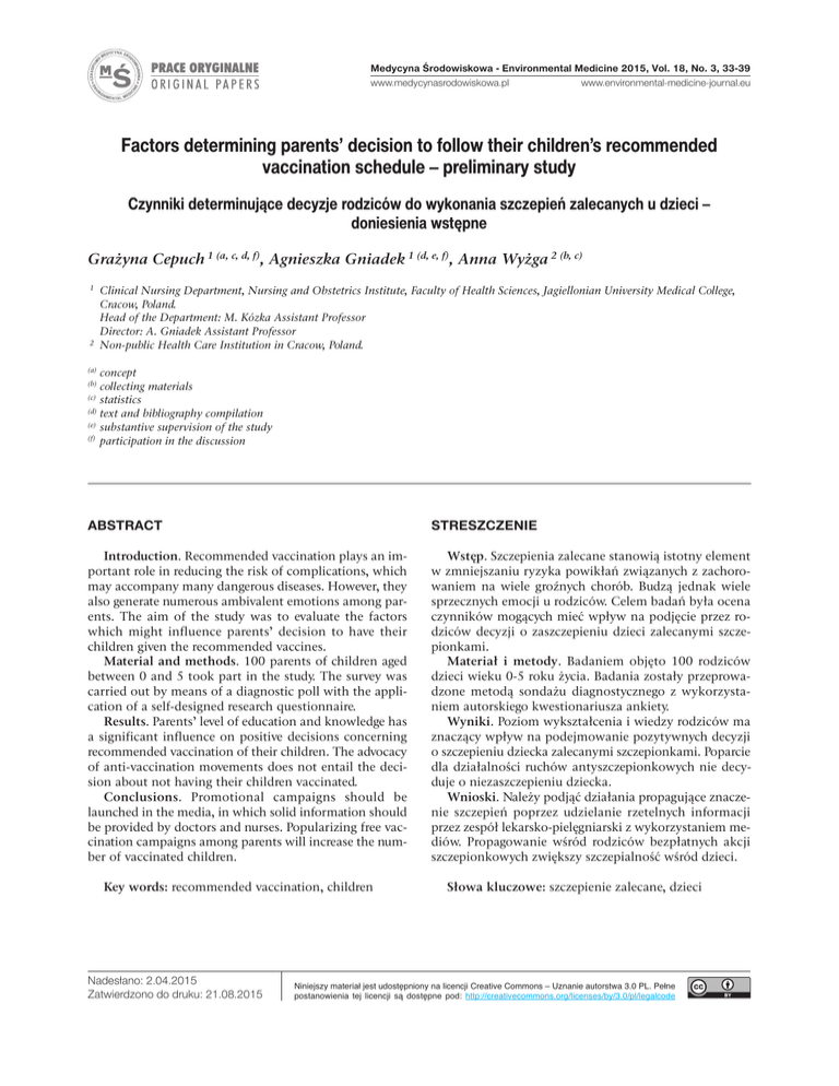 Medycyna Środowiskowa - Environmental Medicine 2015, Vol. 18, No. 3, 33-39 www.environmental-medicine-journal.eu www.medycynasrodowiskowa.pl Factors determining parents’ decision to follow their children’s recommended vaccination schedule – preliminary study Czynniki determinujące decyzje rodziców do wykonania szczepień zalecanych u dzieci – doniesienia wstępne Grażyna Cepuch 1 (a, c, d, f), Agnieszka Gniadek 1 (d, e, f), Anna Wyżga 2 (b, c) 1 2 Clinical Nursing Department, Nursing and Obstetrics Institute, Faculty of Health Sciences, Jagiellonian University Medical College, Cracow, Poland. Head of the Department: M. Kózka Assistant Professor Director: A. Gniadek Assistant Professor Non-public Health Care Institution in Cracow, Poland. concept collecting materials (c) statistics (d) text and bibliography compilation (e) substantive supervision of the study (f) participation in the discussion (a) (b) AbstrAct Introduction. Recommended vaccination plays an important role in reducing the risk of complications, which may accompany many dangerous diseases. However, they also generate numerous ambivalent emotions among parents. The aim of the study was to evaluate the factors which might influence parents’ decision to have their children given the recommended vaccines. Material and methods. 100 parents of children aged between 0 and 5 took part in the study. The survey was carried out by means of a diagnostic poll with the application of a self-designed research questionnaire. Results. Parents’ level of education and knowledge has a significant influence on positive decisions concerning recommended vaccination of their children. The advocacy of anti-vaccination movements does not entail the decision about not having their children vaccinated. Conclusions. Promotional campaigns should be launched in the media, in which solid information should be provided by doctors and nurses. Popularizing free vaccination campaigns among parents will increase the number of vaccinated children. Key words: recommended vaccination, children Nadesłano: 2.04.2015 Zatwierdzono do druku: 21.08.2015 strEszczENiE Wstęp. Szczepienia zalecane stanowią istotny element w zmniejszaniu ryzyka powikłań związanych z zachorowaniem na wiele groźnych chorób. Budzą jednak wiele sprzecznych emocji u rodziców. Celem badań była ocena czynników mogących mieć wpływ na podjęcie przez rodziców decyzji o zaszczepieniu dzieci zalecanymi szczepionkami. Materiał i metody. Badaniem objęto 100 rodziców dzieci wieku 0-5 roku życia. Badania zostały przeprowadzone metodą sondażu diagnostycznego z wykorzystaniem autorskiego kwestionariusza ankiety. Wyniki. Poziom wykształcenia i wiedzy rodziców ma znaczący wpływ na podejmowanie pozytywnych decyzji o szczepieniu dziecka zalecanymi szczepionkami. Poparcie dla działalności ruchów antyszczepionkowych nie decyduje o niezaszczepieniu dziecka. Wnioski. Należy podjąć działania propagujące znaczenie szczepień poprzez udzielanie rzetelnych informacji przez zespół lekarsko-pielęgniarski z wykorzystaniem mediów. Propagowanie wśród rodziców bezpłatnych akcji szczepionkowych zwiększy szczepialność wśród dzieci. Słowa kluczowe: szczepienie zalecane, dzieci Niniejszy materiał jest udostępniony na licencji Creative Commons – Uznanie autorstwa 3.0 PL. Pełne postanowienia tej licencji są dostępne pod: http://creativecommons.org/licenses/by/3.0/pl/legalcode 34 Medycyna Środowiskowa - Environmental Medicine 2015, Vol. 18, No. 3 Grażyna Cepuch, Agnieszka Gniadek, Anna Wyżga: Factors determining parents’ decision to follow their children’s recommended vaccination schedule iNtroductioN The vaccination schedule for Poland assigns basic prophylactic vaccination, which is compulsory (Dz.U. Nr 180 poz.1215; Dz. U. Nr 182 poz. 1086). Apart from compulsory vaccination, parents have a wide variety of additional recommended vaccines to choose from and, although they are not free , many parents decide to have them given to their children. Nowadays there is a vast assortment of vaccines available on the market and their administration should be a common decision of parents and pediatricians [1–6]. New possibilities for preventing more and more diseases, which have been emerging recently, give rise not only to public discussion about recommended vaccination but also to fierce opposition from those who start campaigns against artificial immunization of children. In the 1990s there appeared numerous hypotheses about the potential harmfulness of vaccination, which have not been scientifically proved so far [7–10]. Parents often tend to base their opinions about health only on press coverage, radio and television programmes and numerous web portals. As a result of media chaos, they might lose their confidence in vaccination and see it only as a potential threat to their children. Due to a large amount of contradictory information which surrounds parents they often feel confused and worried about their children’s health condition and also have a lot of doubts about vaccines and their impact. Parents may present various attitudes towards vaccination, ranging from full confidence and following recommended schedules to complete refusal to have their children given vaccination, but all of them expect competent and honest information about vaccination and possible side effects from the medical staff. Therefore, it is important to reiterate that only thorough knowledge about obligatory as well as recommended vaccination spread by medical staff might help parents make their decisions and confirm their validity [11–14]. Medical staff directly responsible for administering prophylactic vaccination of both children and adults is obliged to continuously broaden their knowledge in this field, as only in this way can they be a source of knowledge and support for parents. Similar attitude should be expected from other staff responsible for taking care of ch