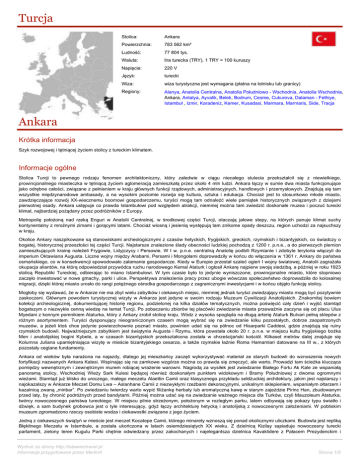 Turcja Stolica: Ankara Powierzchnia: 783 562 km² Ludność: 77 804 tys. Waluta: lira turecka (TRY), 1 TRY = 100 kuruszy Napięcie: 220 V Język: turecki Wiza: wiza turystyczna jest wymagana (płatna na lotnisku lub granicy) Regiony: Alanya, Anatolia Centralna, Anatolia Południowo - Wschodnia, Anatolia Wschodnia, Ankara, Antalya, Ayvalik, Belek, Bodrum, Cesme, Cukurova, Dalaman - Fethiye, Istambuł , Izmir, Karadeniz, Kemer, Kusadasi, Marmara, Marmaris, Side, Tracja Ankara Krótka informacja Szyk rozwojowej i tętniącej życiem stolicy z tureckim klimatem. Informacje ogólne Stolica Turcji to pewnego rodzaju fenomen architektoniczny, który zaledwie w ciągu niecałego stulecia przekształcił się z niewielkiego, prowincjonalnego miasteczka w tętniącą życiem aglomeracją zamieszkałą przez około 4 mln ludzi. Ankara łączy w sumie dwa miasta funkcjonujące jako odrębne całości, związane z pełnieniem w kraju głównych funkcji rządowych, administracyjnych, handlowych i przemysłowych. Znajdują się tam wszystkie międzynarodowe ambasady, a na wysokim poziomie rozwija się kultura, sztuka i edukacja. Chociaż jest to stosunkowo młode miasto, zawdzięczające rozwój XX-wiecznemu boomowi gospodarczemu, turyści mogą tam odnaleźć wiele pamiątek historycznych związanych z dziejami pierwotnej osady. Ankara ustępuje co prawda Istambułowi pod względem atrakcji, niemniej można tam zwiedzić doskonałe muzea i poczuć turecki klimat, najbardziej pożądany przez podróżników z Europy. Metropolię położoną nad rzeką Enguri w Anatolii Centralnej, w środkowej części Turcji, otaczają jałowe stepy, na których panuje klimat suchy kontynentalny z mroźnymi zimami i gorącymi latami. Chociaż wiosną i jesienią występują tam znikome opady deszczu, region uchodzi za najsuchszy w kraju. Okolice Ankary naszpikowane są stanowiskami archeologicznymi z czasów hetyckich, frygijskich, greckich, rzymskich i bizantyjskich, co świadczy o bogatej, historycznej przeszłości tej części Turcji. Najstarsze znalezione ślady obecności ludzkiej pochodzą z 1200 r. p.n.e., a do pierwszych plemion zamieszkujących krainę należeli Frygowie, Lidyjczycy i Persowie. W I w. p.n.e. centralną Anatolię podbili Rzymianie i zdobyte terytoria włączyli do imperium Oktawiana Augusta. Liczne wojny między Arabami, Persami i Mongołami doprowadziły w końcu do włączenia w 1361 r. Ankary do państwa osmańskiego, co w konsekwencji spowodowało załamanie gospodarcze. Kiedy w Europie przestał szaleć ogień I wojny światowej, Anatolii zagrażała okupacja aliantów, na którą odpowiedział przywódca ruchu narodowego Kemal Ataturk i ogłosił Ankarę najpierw swoją siedzibą, a później w roku 1923 stolicą Republiki Tureckiej, odbierając to miano Istambułowi. W tym czasie było to jedynie wyniszczone, prowincjonalne miasto, które stopniowo zaczęło inwestować w nowe gmachy, parki i ulice. Perspektywa znalezienia pracy przez ubogie wówczas społeczeństwo doprowadziła do kolosalnej migracji, dzięki której miasto urosło do rangi potężnego ośrodka gospodarczego z zagranicznymi inwestycjami i w końcu objęło funkcję stolicy. Mogłoby się wydawać, że w Ankarze nie ma zbyt wielu zabytków i ciekawych miejsc, niemniej jednak turyści zwiedzający miasto mogą być pozytywnie zaskoczeni. Głównym powodem turystycznej wizyty w Ankarze jest jedyne w swoim rodzaju Muzeum Cywilizacji Anatolijskich. Znakomitej bowiem kolekcji archeologicznej, dokumentującej historię regionu, podzielonej na kilka działów tematycznych, można poświęcić cały dzień i wyjść stamtąd bogatszym o niezwykle cenną wiedzę na temat Turcji. Po zobaczeniu zbiorów tej placówki zwiedzanie miasta przeważnie zaczyna się od placu Ulus Myedani z konnym pomnikiem Ataturka, który z Ankary zrobił stolicę kraju. Wódz z wysoka spogląda na długą arterię Ataturk Bulvari pełną sklepów z różnym asortymentem. Turyści dysponujący nieograniczonym czasem mogą wybrać się na zwiedzanie kilku pozostałych, dobrze zaopatrzonych muzeów, a jeżeli ktoś chce jedynie powierzchownie poznać miasto, powinien udać się na północ od Hisarparki Caddesi, gdzie znajdują się ruiny rzymskich budowli. Najważniejszym zabytkiem jest świątynia Augusta i Rzymu, która powstała około 20 r. p.n.e. w miejscu kultu frygijskiego bożka Men i anatolijskiej bogini Kybele, a w czasach bizantyjskich przekształcona została w chrześcijański kościół. Kilkaset metrów dalej znajduje się Kolumna Juliana upamiętniająca wizytę w mieście bizantyjskiego cesarza, a także rzymskie łaźnie Roma Hamamlari datowane na III w., z których pozostały ceglane fundamenty. Ankara od wieków była narażona na najazdy, dlatego jej mieszkańcy zaczęli wykorzystywać materiał ze starych budowli do wznoszenia nowych fortyfikacji nazwanych Ankara Kalesi. Wspinając się na zamkowe wzgórze można co prawda się zmęczyć, ale warto. Prowadzi tam ścieżka klucząca pomiędzy wewnętrznym i zewnętrznym murem robiącej wrażenie warowni. Nagrodą za wysiłek jest zwiedzanie Białego Fortu Ak Kale ze wspaniałą panoramą stolicy, Wschodniej Wieży Sark Kulesi będącej również doskonałym punktem widokowym i Bramy Południowej z dwoma ogromnymi wieżami. Stamtąd już blisko do uroczego, małego meczetu Alaettin Camii oraz klasycznego przykładu seldżuckiej architektury, jakim jest najstarszy i najokazalszy w Ankarze Meczet Domu Lwa – Aslanhane Camii z niezwykłymi rzeźbami dekoracyjnymi, unikalnym sklepieniem, wspaniałym ołtarzem i kazalnicą zwaną „minbar”. Po zwiedzeniu twierdzy warto wypić filiżankę herbaty lub aromatyczną kawę w starym zajeździe Pirinc Han, zbudowanym przed laty, by chronić podróżnych przed bandytami. Później można udać się na zwiedzanie ważnego miejsca dla Turków, czyli Mauzoleum Ataturka, twórcy nowoczesnego państwa tureckiego. W miejscu pilnie strzeżonym, po
