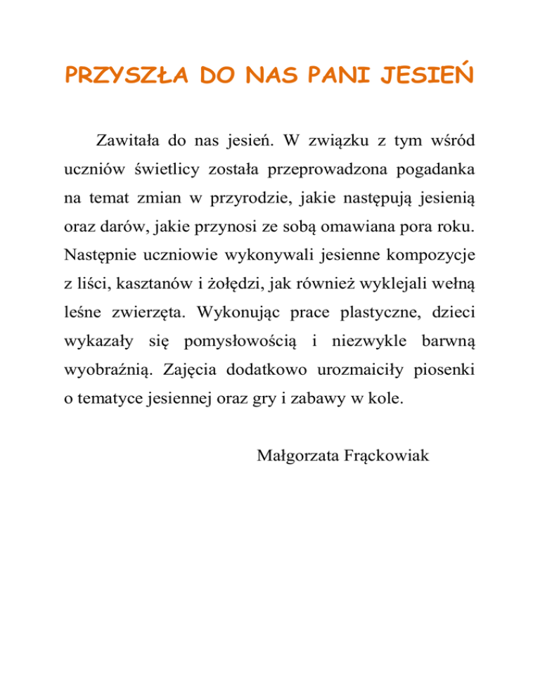PRZYSZŁA DO NAS PANI JESIEŃ Zawitała do nas jesień. W związku z tym wśród uczniów świetlicy została przeprowadzona pogadanka na temat zmian w przyrodzie, jakie następują jesienią oraz darów, jakie przynosi ze sobą omawiana pora roku. Następnie uczniowie wykonywali jesienne kompozycje z liści, kasztanów i żołędzi, jak również wyklejali wełną leśne zwierzęta. Wykonując prace plastyczne, dzieci wykazały się pomysłowością i niezwykle barwną wyobraźnią. Zajęcia dodatkowo urozmaiciły piosenki o tematyce jesiennej oraz gry i zabawy w kole. Małgorzata Frąckowiak