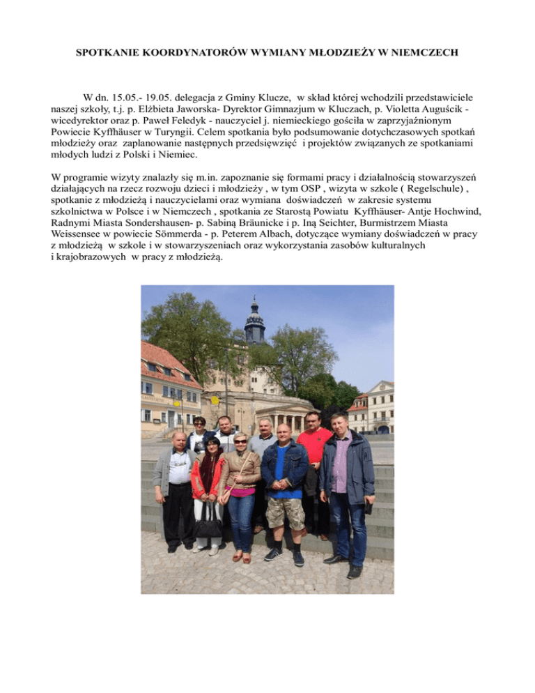 SPOTKANIE KOORDYNATORÓW WYMIANY MŁODZIEŻY W NIEMCZECH W dn. 15.05.- 19.05. delegacja z Gminy Klucze, w skład której wchodzili przedstawiciele naszej szkoły, t.j. p. Elżbieta Jaworska- Dyrektor Gimnazjum w Kluczach, p. Violetta Auguścik wicedyrektor oraz p. Paweł Feledyk - nauczyciel j. niemieckiego gościła w zaprzyjaźnionym Powiecie Kyffhäuser w Turyngii. Celem spotkania było podsumowanie dotychczasowych spotkań młodzieży oraz zaplanowanie następnych przedsięwzięć i projektów związanych ze spotkaniami młodych ludzi z Polski i Niemiec. W programie wizyty znalazły się m.in. zapoznanie się formami pracy i działalnością stowarzyszeń działających na rzecz rozwoju dzieci i młodzieży , w tym OSP , wizyta w szkole ( Regelschule) , spotkanie z młodzieżą i nauczycielami oraz wymiana doświadczeń w zakresie systemu szkolnictwa w Polsce i w Niemczech , spotkania ze Starostą Powiatu Kyffhäuser- Antje Hochwind, Radnymi Miasta Sondershausen- p. Sabiną Bräunicke i p. Iną Seichter, Burmistrzem Miasta Weissensee w powiecie Sömmerda - p. Peterem Albach, dotyczące wymiany doświadczeń w pracy z młodzieżą w szkole i w stowarzyszeniach oraz wykorzystania zasobów kulturalnych i krajobrazowych w pracy z młodzieżą.