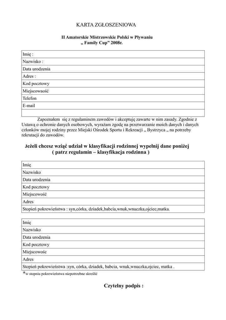 KARTA ZGŁOSZENIOWA II Amatorskie Mistrzowskie Polski w Pływaniu „ Family Cup” 2008r. Imię : Nazwisko : Data urodzenia Adres : Kod pocztowy Miejscowaość Telefon E-mail Zapoznałem się z regulaminem zawodów i akceptuję zawarte w nim zasady. Zgodnie z Ustawą o ochronie danych osobowych, wyrażam zgodę na przetwarzanie moich danych i danych członków mojej rodziny przez Miejski Ośrodek Sportu i Rekreacji „ Bystrzyca „ na potrzeby rekrutacji do zawodów. Jeżeli chcesz wziąć udział w klasyfikacji rodzinnej wypełnij dane poniżej ( patrz regulamin – klasyfikacja rodzinna ) Imię Nazwisko Data urodzenia Kod pocztowy Miejscowość Adres Stopień pokrewieństwa : syn,córka, dziadek,babcia,wnuk,wnuczka,ojciec,matka. Imię Nazwisko Data urodzenia Kod pocztowy Miejscowośc Adres Stopień pokrewieństwa :syn, córka, dziadek, babcia, wnuk,wnuczka,ojciec, matka . *w stopniu pokrewieństwa niepotrzebne skreślić Czytelny podpis :