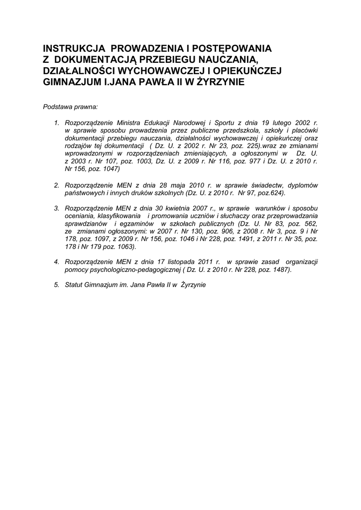 INSTRUKCJA PROWADZENIA I POSTĘPOWANIA Z DOKUMENTACJĄ PRZEBIEGU NAUCZANIA, DZIAŁALNOŚCI WYCHOWAWCZEJ I OPIEKUŃCZEJ GIMNAZJUM I.JANA PAWŁA II W ŻYRZYNIE Podstawa prawna: 1. Rozporządzenie Ministra Edukacji Narodowej i Sportu z dnia 19 lutego 2002 r. w sprawie sposobu prowadzenia przez publiczne przedszkola, szkoły i placówki dokumentacji przebiegu nauczania, działalności wychowawczej i opiekuńczej oraz rodzajów tej dokumentacji ( Dz. U. z 2002 r. Nr 23, poz. 225).wraz ze zmianami wprowadzonymi w rozporządzeniach zmieniających, a ogłoszonymi w Dz. U. z 2003 r. Nr 107, poz. 1003, Dz. U. z 2009 r. Nr 116, poz. 977 i Dz. U. z 2010 r. Nr 156, poz. 1047) 2. Rozporządzenie MEN z dnia 28 maja 2010 r. w sprawie świadectw, dyplomów państwowych i innych druków szkolnych (Dz. U. z 2010 r. Nr 97, poz.624). 3. Rozporządzenie MEN z dnia 30 kwietnia 2007 r., w sprawie warunków i sposobu oceniania, klasyfikowania i promowania uczniów i słuchaczy oraz przeprowadzania sprawdzianów i egzaminów w szkołach publicznych (Dz. U. Nr 83, poz. 562, ze zmianami ogłoszonymi: w 2007 r. Nr 130, poz. 906, z 2008 r. Nr 3, poz. 9 i Nr 178, poz. 1097, z 2009 r. Nr 156, poz. 1046 i Nr 228, poz. 1491, z 2011 r. Nr 35, poz. 178 i Nr 179 poz. 1063). 4. Rozporządzenie MEN z dnia 17 listopada 2011 r. w sprawie zasad organizacji pomocy psychologiczno-pedagogicznej ( Dz. U. z 2010 r. Nr 228, poz. 1487). 5. Statut Gimnazjum im. Jana Pawła II w Żyrzynie ROZDZIAŁ I Postanowienia ogólne § 1. Instrukcja prowadzenia i postępowania z dokumentacją nauczania, dokumentowania procesu wychowawczo-opiekuńczego w Gimnazjum im. Jana Pawła II w Żyrzynie, zwana dalej instrukcją, określa rodzaj dokumentacji pedagogicznej w szkole, sposób jej prowadzenia, przechowywania, udostępniania, zakres odpowiedzialności za jej prowadzenie i archiwizowanie. Ponadto instrukcja określa techniki prowadzenia poszczególnych rodzajów dokumentacji oraz wykaz umieszczanych w nich zapisów. 2. Instrukcja obowiązuje pracowników zatrudnionych na stanowiskach pedagogicznych w szkole, w tym uprawnionych do sprawowania nadzoru pedagogicznego oraz pracowników sekretariatu. 3. Odpowiedzialność za właściwe prowadzenie i przechowywanie dokumentacji przebiegu nauczania, działalności wychowawczej i opiekuńczej oraz za wydawanie przez szkołę dokumentów zgodnych z posiadaną dokumentacją ( zaświadczenia, odpisy, kopie i inne) ponosi dyrektor szkoły. 4. Osoby odpowiedzialne za wytwarzanie, przetwarzania, odtwarzanie oraz posługiwanie się dokumentacją pedagogiczną w trakcie czynności związanych z wykonywaniem obowiązków są zobowiązane do ścisłego stosowania zapisów poniższej instrukcji. ROZDZIAŁ II Rodzaje dokumentacji nauczania i działalności wychowawczo – opiekuńczej § 2.1. Dokumentację przebiegu nauczania oraz podejmowanych działań i ich efektów w Gimnazjum im. Jana Pawła II w Żyrzynie stanowią: księga ewidencji; księga uczniów; arkusze ocen; księga arkuszy ocen; dziennik lekcyjny, odrębny dla każdego oddziału; dziennik wychowawcy, określony w statucie szkoły; dziennik zajęć w świetlicy; dziennik zajęć dydaktyczno-wyrównawczych; dziennik indywidualnych zajęć rewalidacyjno-wychowawczych; dziennik indywidualnego nauczania; dziennik pedagoga/psychologa; dziennik zadań i czynność nauczyciela, wg art. 42 ust. 2 KN, określony w statucie szkoły; 13) Ewidencja Kart Indywidualnych Potrzeb Ucznia; 14) Karty Indywidualnych Potrzeb Ucznia 15) indywidualne teczki dla uczniów objętych pomocą psychologiczno-pedagogiczną; 1) 2) 3) 4) 5) 6) 7) 8) 9) 10) 11) 12) 16) uchwały rady pedagogicznej dotyczące klasyfikowania, promowania oraz ukończenia szkoły; 17) pisemne prace kontrolne i egzaminacyjne 2. Wymienione w ust. 1 rodzaje dokumentów stosowane są w celu: 1) Księga ewidencji w Gimnazjum odnotowuje się corocznie, w porozumieniu z gminą Żyrzyn informacje o spełnianiu przez młodzież do -18 lat obowiązku szkolnego lub obowiązku nauki; 2) Księga uczniów – rejestr uczniów przyjętych do szkoły oraz klasy, do której został uczeń przyjęty. W księdze uczniów odnotowuje się datę ukończenia szkoły albo datę i przyczynę opuszczenia szkoły przez ucznia; 3) Arkusze ocen – rejestr uchwał rady pedagogicznej wyrażonych w sprawach indywidualnych dotyczących klasyfikowania, promowania i ukończenia szkoły oraz osiągnięcia ucznia, wyrażone w skali określonej w rozporządzeniu MEN o ocenianiu, promowaniu i klasyfikowaniu uczniów w publicznych szkołach Arkusze ocen prowadzone są osobno dla każdego ucznia; 4) Księga arkuszy ocen – zbiór arkuszy ocen uczniów urodzonych w jednym roku, którzy ukończyli lub opuścili szkołę; 5) Dziennik lekcyjny – dokument prowadzony dla każdego oddziału odrębnie w poszczególnych latach szkolnych. Dokumentuje bieżącą pracę nauczyciela i osiągnięcia uczniów. Stanowi dowód obecności nauczyciela w pracy oraz obecności uczniów na zajęciach. 6) Dziennik wychowawcy – dokument prowadzony przez każdego wychowawcę oddziału – dokumentuje czynności wychowawcy oddziału, kontakty z rodzicami, potwierdzenia przekazywanych rodzicom komunikatów i informacji o dziecku, procedurę oceniania zachowania oraz zgody lub sprzeciwy rodziców od udziału dziecka w określonych zajęciach; 7) Dziennik zajęć w świetlicy – dokument przeznaczony do rejestracji działań opiekuńczych w świetlicy szkolnej w każdej odrębnej grupie świetlicowej, a także obecności dzieci w danym roku szkolnym; 8) Dziennik zajęć pozalekcyjnych, dydaktyczno-wychowawczych, specjalistycznych, rewalidacyjnych, itp. – dokument służący do rejestrowania przebiegu zajęć, tematyki zajęć i obecności uczniów. Prowadzony jest dla grup, do których kierowana jest określona forma pomocy psychologiczno-pedagogicznej; 9) Dziennik indywidualnych zajęć rewalidacyjno-wychowawczych – dokument przeznaczony do rejestracji zajęć rewa