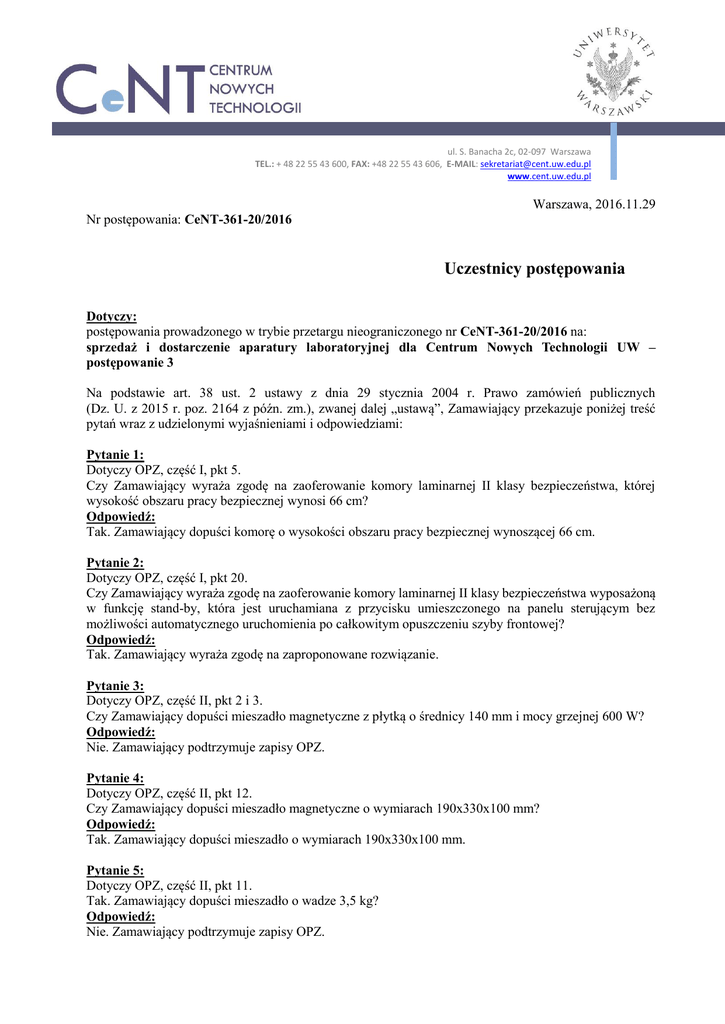 ul. S. Banacha 2c, 02-097 Warszawa TEL.: + 48 22 55 43 600, FAX: +48 22 55 43 606, E-MAIL: [email protected] www.cent.uw.edu.pl Warszawa, 2016.11.29 Nr postępowania: CeNT-361-20/2016 Uczestnicy postępowania Dotyczy: postępowania prowadzonego w trybie przetargu nieograniczonego nr CeNT-361-20/2016 na: sprzedaż i dostarczenie aparatury laboratoryjnej dla Centrum Nowych Technologii UW – postępowanie 3 Na podstawie art. 38 ust. 2 ustawy z dnia 29 stycznia 2004 r. Prawo zamówień publicznych (Dz. U. z 2015 r. poz. 2164 z późn. zm.), zwanej dalej „ustawą”, Zamawiający przekazuje poniżej treść pytań wraz z udzielonymi wyjaśnieniami i odpowiedziami: Pytanie 1: Dotyczy OPZ, część I, pkt 5. Czy Zamawiający wyraża zgodę na zaoferowanie komory laminarnej II klasy bezpieczeństwa, której wysokość obszaru pracy bezpiecznej wynosi 66 cm? Odpowiedź: Tak. Zamawiający dopuści komorę o wysokości obszaru pracy bezpiecznej wynoszącej 66 cm. Pytanie 2: Dotyczy OPZ, część I, pkt 20. Czy Zamawiający wyraża zgodę na zaoferowanie komory laminarnej II klasy bezpieczeństwa wyposażoną w funkcję stand-by, która jest uruchamiana z przycisku umieszczonego na panelu sterującym bez możliwości automatycznego uruchomienia po całkowitym opuszczeniu szyby frontowej? Odpowiedź: Tak. Zamawiający wyraża zgodę na zaproponowane rozwiązanie. Pytanie 3: Dotyczy OPZ, część II, pkt 2 i 3. Czy Zamawiający dopuści mieszadło magnetyczne z płytką o średnicy 140 mm i mocy grzejnej 600 W? Odpowiedź: Nie. Zamawiający podtrzymuje zapisy OPZ. Pytanie 4: Dotyczy OPZ, część II, pkt 12. Czy Zamawiający dopuści mieszadło magnetyczne o wymiarach 190x330x100 mm? Odpowiedź: Tak. Zamawiający dopuści mieszadło o wymiarach 190x330x100 mm. Pytanie 5: Dotyczy OPZ, część II, pkt 11. Tak. Zamawiający dopuści mieszadło o wadze 3,5 kg? Odpowiedź: Nie. Zamawiający podtrzymuje zapisy OPZ. ul. S. Banacha 2c, 02-097 Warszawa TEL.: + 48 22 55 43 600, FAX: +48 22 55 43 606, E-MAIL: [email protected] www.cent.uw.edu.pl Pytanie 6: Dotyczy OPZ, część II, pkt 2. Czy Zamawiający dopuści mieszadło magnetyczne z płytką o średnicy 170 mm? Odpowiedź: Nie. Zamawiający podtrzymuje zapisy OPZ. Pytanie 7: Dotyczy OPZ, wymagania ogólne, pkt 7. Czy Zamawiający wyrazi zgodę na zapewnienie serwisu w pełni wykwalifikowanego z ponad 20 letnim doświadczeniem w naprawach urządzeń będących przedmiotem postępowania, jednakże nie posiadającym autoryzacji producenta Odpowiedź: Nie. Zamawiający podtrzymuje zapisy OPZ. Powyższe wyjaśnienia są wiążące dla wszystkich Wykonawców i należy je uwzględnić przy sporządzaniu oferty. Zamawiający informuje, że terminy składania i otwarcia ofert pozostają bez zmian. Z-ca Dyrektora Centrum Nowych Technologii UW mgr inż. Ewa Jastrzębska