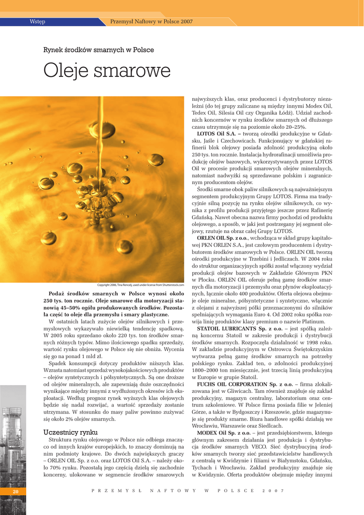 Wstęp Przemysł Naftowy w Polsce 2007 Rynek środków smarnych w Polsce Oleje smarowe najwyższych klas, oraz producenci i dystrybutorzy niezależni (do tej grupy zaliczane są między innymi Modex Oil, Tedex Oil, Silesia Oil czy Organika Łódź). Udział zachodnich koncernów w rynku środków smarnych od dłuższego czasu utrzymuje się na poziomie około 20–25%. LOTOS Oil S.A. – tworzą ośrodki produkcyjne w Gdańsku, Jaśle i Czechowicach. Funkcjonujący w gdańskiej rafinerii blok olejowy posiada zdolność produkcyjną około 250 tys. ton rocznie. Instalacja hydrorafinacji umożliwia produkcję olejów bazowych, wykorzystywanych przez LOTOS Oil w procesie produkcji smarowych olejów mineralnych, natomiast nadwyżki są sprzedawane polskim i zagranicznym producentom olejów. Środki smarne obok paliw silnikowych są najważniejszym segmentem produkcyjnym Grupy LOTOS. Firma ma tradycyjnie silną pozycję na rynku olejów silnikowych, co wynika z profilu produkcji przyjętego jeszcze przez Rafinerię Gdańską. Nawet obecna nazwa firmy pochodzi od produktu olejowego, a sposób, w jaki jest postrzegany jej segment olejowy, rzutuje na obraz całej Grupy LOTOS. ORLEN OIL Sp. z o.o., wchodząca w skład grupy kapitałowej PKN ORLEN S.A., jest czołowym producentem i dystrybutorem środków smarowych w Polsce. ORLEN OIL tworzą ośrodki produkcyjne w Trzebini i Jedliczach. W 2004 roku do struktur organizacyjnych spółki został włączony wydział produkcji olejów bazowych w Zakładzie Głównym PKN w Płocku. ORLEN OIL oferuje pełną gamę środków smarnych dla motoryzacji i przemysłu oraz płynów eksploatacyjnych, łącznie około 400 produktów. Oferta olejowa obejmuje oleje mineralne, półsyntetyczne i syntetyczne, włącznie z olejami z najwyższej półki przeznaczonymi do silników spełniających wymagania Euro 4. Od 2002 roku spółka rozwija linię produktów klasy premium o nazwie Platinum. STATOIL LUBRICANTS Sp. z o.o. – jest spółką zależną koncernu Statoil w zakresie produkcji i dystrybucji środków smarnych. Rozpoczęła działalność w 1998 roku. W zakładzie produkcyjnym w Ostrowcu Świętokrzyskim wytwarza pełną gamę środków smarnych na potrzeby polskiego rynku. Zakład ten, o zdolności produkcyjnej 1800–2000 ton miesięcznie, jest trzecią linią produkcyjną w Europie w grupie Statoil. FUCHS OIL CORPORATION Sp. z o.o. – firma zlokalizowana jest w Gliwicach. Tam również znajduje się zakład produkcyjny, magazyn centralny, laboratorium oraz centrum szkoleniowe. W Polsce firma posiada filie w Jeleniej Górze, a także w Bydgoszczy i Rzeszowie, gdzie magazynuje się produkty smarne. Biura handlowe spółki działają we Wrocławiu, Warszawie oraz Siedlcach. MODEX Oil Sp. z o.o. – jest przedsiębiorstwem, którego głównym zakresem działania jest produkcja i dystrybucja środków smarnych VECO. Sieć dystrybucyjną środków smarnych tworzy sieć przedstawicielstw handlowych z centralą w Kwidzynie i filiami w Białymstoku, Gdańsku, Tychach i Wrocławiu. Zakład produkcyjny znajduje się w Kwidzynie. Oferta produktów obejmuje między innymi Copyright 2006, Tina Rencelj, used under license from Shutterstock.com Podaż środków smarnych w Polsce wynosi około 250 tys. ton rocznie. Oleje smarowe dla motoryzacji stanowią 45–50% ogółu produkowanych środków. Pozostała część to oleje dla przemysłu i smary plastyczne. W ostatnich latach zużycie olejów silnikowych i przemysłowych wykazywało niewielką tendencję spadkową. W 2005 roku sprzedano około 220 tys. ton środków smarnych różnych typów. Mimo ilościowego spadku sprzedaży, wartość rynku olejowego w Polsce się nie obniża. Wycenia się go na ponad 1 mld zł. Spadek konsumpcji dotyczy produktów niższych klas. Wzrasta natomiast sprzedaż wysokojakościowych produktów – olejów syntetycznych i półsyntetycznych. Są one droższe od olejów mineralnych, ale zapewniają duże oszczędności wynikające między innymi z wydłużonych okresów ich eksploatacji. Według prognoz rynek wyższych klas olejowych będzie się nadal rozwijać, a wartość sprzedaży zostanie utrzymana. W stosunku do masy paliw powinno zużywać się około 2% olejów smarnych. Uczestnicy rynku Struktura rynku olejowego w Polsce nie odbiega znacząco od innych krajów europejskich, to znaczy dominują na nim podmioty krajowe. Do dwóch największych graczy – ORLEN OIL Sp. z o.o. oraz LOTOS Oil S.A. – należy około 70% rynku. Pozostałą jego częścią dzielą się zachodnie koncerny, ulokowane w segmencie środków smarowych 20 P R Z E M Y S Ł N A F T O W Y W P O L S C E 2 0 0 7