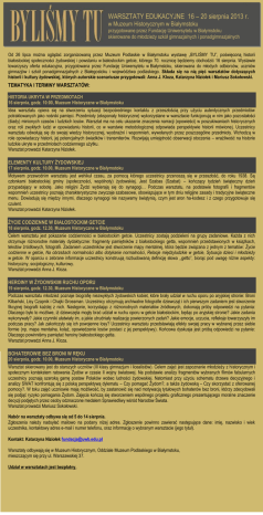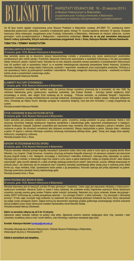 WARSZTATY EDUKACYJNE 16 – 20 sierpnia 2013 r. w Muzeum Historycznym w Białymstoku przygotowane przez Fundację Uniwersytetu w Białymstoku skierowane do młodzieży szkół gimnazjalnych i ponadgimnazjalnych Od 26 lipca można oglądać zorganizowaną przez Muzeum Podlaskie w Białymstoku wystawę „BYLIŚMY TU”, poświęconą historii białostockiej społeczności żydowskiej i powstaniu w białostockim getcie, którego 70. rocznicę będziemy obchodzić 16 sierpnia. Wystawie towarzyszy oferta edukacyjna, przygotowana przez Fundację Uniwersytetu w Białymstoku, skierowana do młodych odbiorców, uczniów gimnazjów i szkół ponadgimnazjalnych z Białegostoku i województwa podlaskiego. Składa się na nią pięć warsztatów dotyczących historii i kultury żydowskiej, których autorskie scenariusze przygotowali: Anna J. Kloza, Katarzyna Niziołek i Mariusz Sokołowski. TEMATYKA I TERMINY WARSZTATÓW: HISTORIA UKRYTA W PRZEDMIOTACH 16 sierpnia, godz. 10:00, Muzeum Historyczne w Białymstoku Idea warsztatu opiera się na stworzeniu sytuacji bezpośredniego kontaktu z przeszłością przy użyciu autentycznych przedmiotów potraktowanych jako nośniki pamięci. Przedmioty (eksponaty historyczne) wykorzystane w warsztacie funkcjonują w nim jako pozostałości (ślady) minionych czasów i ludzkich losów. Warsztat ma na celu ukazanie znaczenia narracji (opowieści) w poszukiwaniach historycznych oraz roli zwykłych ludzi w opowiadaniu historii, co w warstwie metodologicznej odpowiada perspektywie historii mówionej. Uczestnicy warsztatu odwołują się do swojej wiedzy historycznej, wyobraźni i wspomnień, wywołanych przez poszczególne przedmioty. Wchodzą w role opowiadaczy historii, jej potencjalnych świadków i transmiterów. Rozwijają umiejętność obserwacji otoczenia – wrażliwość na historie ludzkie ukryte w przedmiotach codziennego użytku. Warsztat prowadzi Katarzyna Niziołek. ELEMENTY KULTURY ŻYDOWSKIEJ 17 sierpnia, godz. 10.00, Muzeum Historyczne w Białymstoku Motywem przewodnim warsztatu jest wehikuł czasu, za pomocą którego uczestnicy przenoszą się w przeszłość, do roku 1938. Są członkami białostockiej gminy (społeczności, wspólnoty) żydowskiej. Jest Szabas (Szabat) – kończący tydzień świąteczny dzień przypadający w sobotę. Jako religijni Żydzi wybierają się do synagogi… Podczas warsztatu, na podstawie fotografii i fragmentów wspomnień uczestnicy poznają charakterystyczne zwyczaje szabasowe, obowiązujące w tym dniu religijne zasady i tradycyjne świąteczne menu. Dowiadują się między innymi, dlaczego synagogi nie nazywamy świątynią, czym jest aron ha-kodesz i z czego przygotowuje się czulent. Warsztat prowadzi Katarzyna Niziołek. ŻYCIE CODZIENNE W BIAŁOSTOCKIM GETCIE 18 sierpnia, godz. 12.30, Muzeum Historyczne w Białymstoku Celem warsztatu jest pokazanie codzienności w białostockim getcie. Uczestnicy zostają podzieleni na grupy zadaniowe. Każda z nich otrzymuje różnorodne materiały dydaktyczne: fragmenty pamiętników z białostockiego getta, wspomnień przedstawionych w książkach, tekstów źródłowych, fotografii. Zadaniem uczestników jest stworzenie mapy mentalnej, która będzie związana z jednym z tematów: Życie codzienne w getcie, Na obrzeżach normalności albo dotykanie normalności, Relacje międzyludzkie w getcie, Sytuacja dzieci i młodzieży w getcie. W oparciu o zebrane informacje uczestnicy konstruują rozbudowaną definicję słowa ,,getto”, biorąc pod uwagę różne aspekty: historyczny, socjologiczny, kulturowy. Warsztat prowadzi Anna J. Kloza. HEROINY W ŻYDOWSKIM RUCHU OPORU 19 sierpnia, godz. 12.30, Muzeum Historyczne w Białymstoku Podczas warsztatu młodzież poznaje biografię niezwykłych żydowskich kobiet, które brały udział w ruchu oporu po aryjskiej stronie: Broni Klibański, Lisy Czapnik i Chajki Grossman. Uczestnicy otrzymują archiwalne fotografie dziewcząt i ich pierwszym zadaniem jest stworzenie fikcyjnej biografii każdej z nich. Następnie, korzystając z różnorodnych materiałów źródłowych, dokonają próby odpowiedzi na pytania: Dlaczego było to możliwe, iż dziewczęta mogły brać udział w ruchu oporu w getcie białostockim, będąc po aryjskiej stronie? Jakie zadania wykonywały? Jakie czynniki ułatwiały im, a jakie utrudniały realizację powierzonych zadań? Jakie emocje, uczucia, refleksje towarzyszyły im podczas pracy? Jak zakończyły się ich powojenne losy? Uczestnicy warsztatu przedstawiają efekty swojej pracy w wybranej przez siebie formie (np. mapa mentalna, kolaż, opowiedzenie losów postaci z jej perspektywy). Końcowa dyskusja jest próbą odpowiedzi na pytanie: Dlaczego powinniśmy pamiętać heroiny białostockiego getta. Warsztat prowadzi Anna J. Kloza. BOHATEROWIE BEZ BRONI W RĘKU 20 sierpnia, godz. 10.00, Muzeum Historyczne w Białymstoku Warsztat skierowany jest do starszych uczniów (III klasy gimnazjum i licealistów). Celem zajęć jest zapoznanie młodzieży z historycznym i społecznym kontekstem ratowania Żydów w czasie II wojny światowej. Na podstawie analizy fragmentów wybranych filmów fabularnych uczestnicy poznają szeroką gamę postaw Polaków wobec ludności żydowskiej. Natomiast przy użyciu schematu drzewa decyzyjnego i analizy SWAT konfrontują się z polską perspektywą dylematu – Czy pomagać Żydom?, a także żydowską – Czy skorzystać z oferowanej pomocy?. W toku zajęć uczniowie mają możliwość, by zastanowić się nad motywacją tytułowych bohaterów bez broni, którzy zdecydowali się podjąć ryzyko pomagania Żydom. Zajęcia kończą się stworzeniem wspólnego projektu graficznego prezentującego moralne znaczenie decyzji podjętych przez osoby odznaczone medalem Sprawiedliwy wśród Narodów Świata. Warsztat prowadzi Mariusz Sokołowski. Nabór na warsztaty odbywa się od 5 do 14 sierpnia. Zgłoszenia należy nadsyłać mailowo na podany niżej adres. Zgłoszenie powinno 