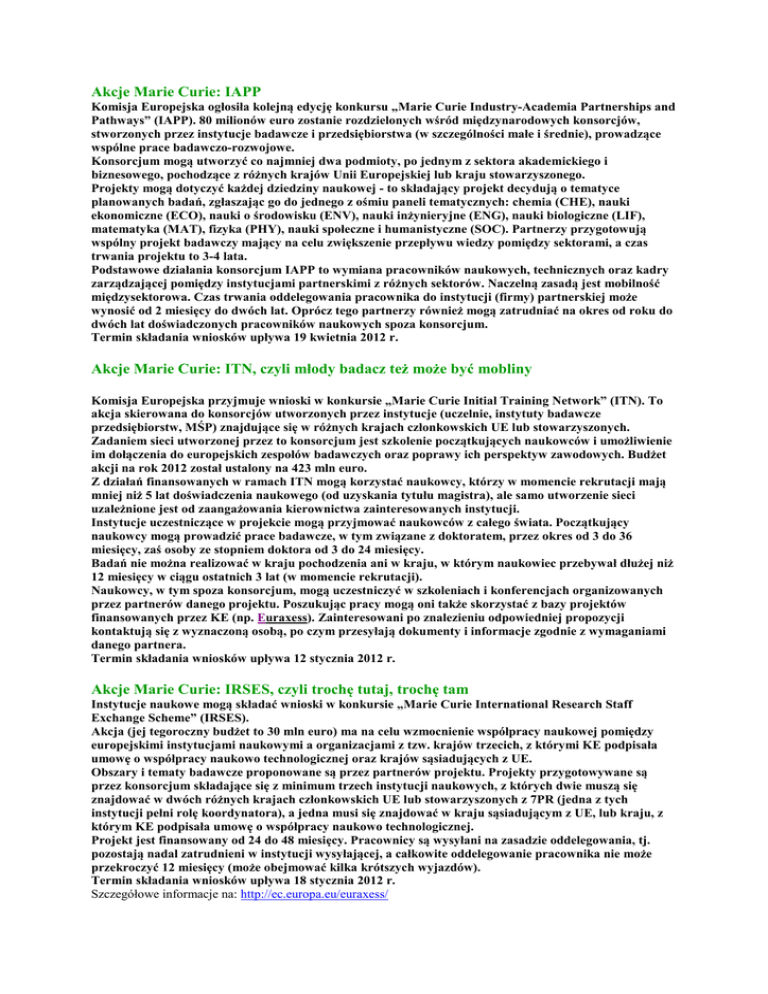Akcje Marie Curie: IAPP Komisja Europejska ogłosiła kolejną edycję konkursu „Marie Curie Industry-Academia Partnerships and Pathways” (IAPP). 80 milionów euro zostanie rozdzielonych wśród międzynarodowych konsorcjów, stworzonych przez instytucje badawcze i przedsiębiorstwa (w szczególności małe i średnie), prowadzące wspólne prace badawczo-rozwojowe. Konsorcjum mogą utworzyć co najmniej dwa podmioty, po jednym z sektora akademickiego i biznesowego, pochodzące z różnych krajów Unii Europejskiej lub kraju stowarzyszonego. Projekty mogą dotyczyć każdej dziedziny naukowej - to składający projekt decydują o tematyce planowanych badań, zgłaszając go do jednego z ośmiu paneli tematycznych: chemia (CHE), nauki ekonomiczne (ECO), nauki o środowisku (ENV), nauki inżynieryjne (ENG), nauki biologiczne (LIF), matematyka (MAT), fizyka (PHY), nauki społeczne i humanistyczne (SOC). Partnerzy przygotowują wspólny projekt badawczy mający na celu zwiększenie przepływu wiedzy pomiędzy sektorami, a czas trwania projektu to 3-4 lata. Podstawowe działania konsorcjum IAPP to wymiana pracowników naukowych, technicznych oraz kadry zarządzającej pomiędzy instytucjami partnerskimi z różnych sektorów. Naczelną zasadą jest mobilność międzysektorowa. Czas trwania oddelegowania pracownika do instytucji (firmy) partnerskiej może wynosić od 2 miesięcy do dwóch lat. Oprócz tego partnerzy również mogą zatrudniać na okres od roku do dwóch lat doświadczonych pracowników naukowych spoza konsorcjum. Termin składania wniosków upływa 19 kwietnia 2012 r. Akcje Marie Curie: ITN, czyli młody badacz też może być mobliny Komisja Europejska przyjmuje wnioski w konkursie „Marie Curie Initial Training Network” (ITN). To akcja skierowana do konsorcjów utworzonych przez instytucje (uczelnie, instytuty badawcze przedsiębiorstw, MŚP) znajdujące się w różnych krajach członkowskich UE lub stowarzyszonych. Zadaniem sieci utworzonej przez to konsorcjum jest szkolenie początkujących naukowców i umożliwienie im dołączenia do europejskich zespołów badawczych oraz poprawy ich perspektyw zawodowych. Budżet akcji na rok 2012 został ustalony na 423 mln euro. Z działań finansowanych w ramach ITN mogą korzystać naukowcy, którzy w momencie rekrutacji mają mniej niż 5 lat doświadczenia naukowego (od uzyskania tytułu magistra), ale samo utworzenie sieci uzależnione jest od zaangażowania kierownictwa zainteresowanych instytucji. Instytucje uczestniczące w projekcie mogą przyjmować naukowców z całego świata. Początkujący naukowcy mogą prowadzić prace badawcze, w tym związane z doktoratem, przez okres od 3 do 36 miesięcy, zaś osoby ze stopniem doktora od 3 do 24 miesięcy. Badań nie można realizować w kraju pochodzenia ani w kraju, w którym naukowiec przebywał dłużej niż 12 miesięcy w ciągu ostatnich 3 lat (w momencie rekrutacji). Naukowcy, w tym spoza konsorcjum, mogą uczestniczyć w szkoleniach i konferencjach organizowanych przez partnerów danego projektu. Poszukując pracy mogą oni także skorzystać z bazy projektów finansowanych przez KE (np. Euraxess). Zainteresowani po znalezieniu odpowiedniej propozycji kontaktują się z wyznaczoną osobą, po czym przesyłają dokumenty i informacje zgodnie z wymaganiami danego partnera. Termin składania wniosków upływa 12 stycznia 2012 r. Akcje Marie Curie: IRSES, czyli trochę tutaj, trochę tam Instytucje naukowe mogą składać wnioski w konkursie „Marie Curie International Research Staff Exchange Scheme” (IRSES). Akcja (jej tegoroczny budżet to 30 mln euro) ma na celu wzmocnienie współpracy naukowej pomiędzy europejskimi instytucjami naukowymi a organizacjami z tzw. krajów trzecich, z którymi KE podpisała umowę o współpracy naukowo technologicznej oraz krajów sąsiadujących z UE. Obszary i tematy badawcze proponowane są przez partnerów projektu. Projekty przygotowywane są przez konsorcjum składające się z minimum trzech instytucji naukowych, z których dwie muszą się znajdować w dwóch różnych krajach członkowskich UE lub stowarzyszonych z 7PR (jedna z tych instytucji pełni rolę koordynatora), a jedna musi się znajdować w kraju sąsiadującym z UE, lub kraju, z którym KE podpisała umowę o współpracy naukowo technologicznej. Projekt jest finansowany od 24 do 48 miesięcy. Pracownicy są wysyłani na zasadzie oddelegowania, tj. pozostają nadal zatrudnieni w instytucji wysyłającej, a całkowite oddelegowanie pracownika nie może przekroczyć 12 miesięcy (może obejmować kilka krótszych wyjazdów). Termin składania wniosków upływa 18 stycznia 2012 r. Szczegółowe informacje na: http://ec.europa.eu/euraxess/
