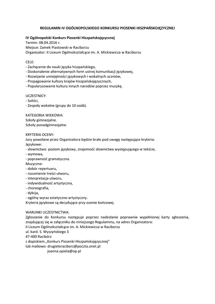 REGULAMIN IV OGÓLNOPOLSKIEGO KONKURSU PIOSENKI HISZPAŃSKOJĘZYCZNEJ IV Ogólnopolski Konkurs Piosenki Hiszpańskojęzycznej Termin: 08.04.2016 r. Miejsce: Zamek Piastowski w Raciborzu Organizator: II Liceum Ogólnokształcące im. A. Mickiewicza w Raciborzu CELE: - Zachęcenie do nauki języka hiszpańskiego, - Doskonalenie alternatywnych form ustnej komunikacji językowej, - Rozwijanie umiejętności językowych i wokalnych uczniów, - Propagowanie kultury krajów hiszpańskojęzycznych, - Popularyzowanie kultury innych narodów poprzez muzykę. UCZESTNICY: - Soliści, - Zespoły wokalne (grupy do 10 osób). KATEGORIA WIEKOWA: Szkoły gimnazjalne. Szkoły ponadgimnazjalne. KRYTERIA OCENY: Jury powołane przez Organizatora będzie brało pod uwagę następujące kryteria: Językowe: - słownictwo: poziom językowy, znajomość słownictwa występującego w tekście, - wymowa, - poprawność gramatyczna. Muzyczne: - dobór repertuaru, - rozumienie treści utworu, - interpretacja utworu, - indywidualność artystyczna, - choreografia, - dykcja, - ogólny wyraz estetyczno-artystyczny. Kryteria językowe są decydujące przy ocenie końcowej. WARUNKI UCZESTNICTWA: Zgłoszenie do Konkursu następuje poprzez nadesłanie poprawnie wypełnionej karty zgłoszenia, znajdującej się w załączniku do niniejszego Regulaminu, na adres Organizatora: II Liceum Ogólnokształcące im. A. Mickiewicza w Raciborzu ul. kard. S. Wyszyńskiego 3 47-400 Racibórz z dopiskiem „Konkurs Piosenki Hiszpańskojęzycznej” lub mailowo: [email protected] [email protected] TERMINY Termin nadsyłania zgłoszeń: 30 marca 2016 r. 08.04.2016 r. – w godzinach porannych (dokładna godzina zostanie podana w terminie późniejszym, najpóźniej do 31 marca 2016 r.) odbędą się przesłuchania. Koncert laureatów odbędzie się w godzinach popołudniowych. PRZEPISY DODATKOWE - Jedna placówka może zgłosić maksymalnie 3 uczestników. - Uczestnikiem nie może być laureat Grand Prix lub I miejsca w poprzednich edycjach Konkursu. - Zgłoszenia dokonuje uczestnik lub jego opiekun na specjalnej karcie zgłoszeń dostępnej w załączniku do Regulaminu. - Uczestnicy wykonują jeden utwór. - Maksymalna długość utworu wynosi 5 minut. - Soliści mogą być również członkami zespołów wokalno-instrumentalnych. - Repertuar jest dowolny, jednak niedozwolone jest śpiewanie piosenek zawierających zwroty wulgarne oraz treści niezgodne z przyjętymi obyczajami, obrażające uczucia innych osób, np. religijne itp. - Uczestnicy mogą wykonać piosenkę „a capella”, posłużyć się akompaniamentem nagranym na płycie CD (płyty powinny zostać opisane: wykonawca, numer i tytuł utworu, czas trwania nagrania) lub wystąpić z towarzyszeniem własnych instrumentów. Ścieżki dźwiękowe/akompaniament nie mogą mieć nagranego wokalu. Dopuszcza się czasowy pół-playback (np. fragment refrenu). - Jeśli podczas występu uczestnik będzie korzystał z własnych instrumentów, na karcie zgłoszenia należy umieścić szczegółowe informacje dotyczące niezbędnych wymogów technicznych. - Organizator zapewnia sprzęt nagłaśniający oraz obsługę techniczną. - Wszelkich zmian repertuarowych można dokonać w formie pisemnej najpóźniej na 7 dni przed Konkursem. - Organizator ustala kolejność występów i zawiadamia o niej uczestników mailowo lub telefonicznie do 31.03.2016 r. - Nieczytelna lub niekompletna karta zgłoszenia nie będzie uwzględniana. - Laureaci Konkursu biorą udział w koncercie laureatów, otrzymują dyplomy i nagrody. - Organizator nie zapewnia noclegu oraz zwrotu kosztów przejazdu. - Podpisanie karty zgłoszenia uczestnictwa w Konkursie jest równoznaczne z wyrażeniem zgody na nagrywania, filmowanie i fotografowanie uczestników podczas Konkursu, a powstały materiał będzie wyłączną własnością Organizatora Konkursu. - Obecność zgłasza opiekun lub uczestnik u Organizatora najpóźniej 15 minut przed występem. - Nośnik z utworem dostarczają uczestnicy w dniu występu. - Szczegółowe informacje o Konkursie można uzyskać pod numerem telefonu 602703918 lub za pośrednictwem poczty elektronicznej: [email protected] (Joanna Opiela). - Zasady objęte Regulaminem nie ulegają zmianom. - Sprawy nieujęte w Regulaminie rozstrzyga Organizator. - Podpisując kartę zgłoszeń, uczestnik/opiekun wyraża zgodę na przetwarzanie danych osobowych, zgodnie z ustawą z dn. 29.08.1997 r. o ochronie danych osobowych. Dz.U. Nr 133 poz. 883 z późniejszymi zmianami i wyraża zgodę na wykorzystywanie przez II Liceum Ogólnokształcące im. A. Mickiewicza w Raciborzu jego wizerunku w formie zdjęć i filmów wykorzystywanych do dokumentacji i promocji imprez II Liceum Ogólnokształcącego im. A. Mickiewicza w Raciborzu.