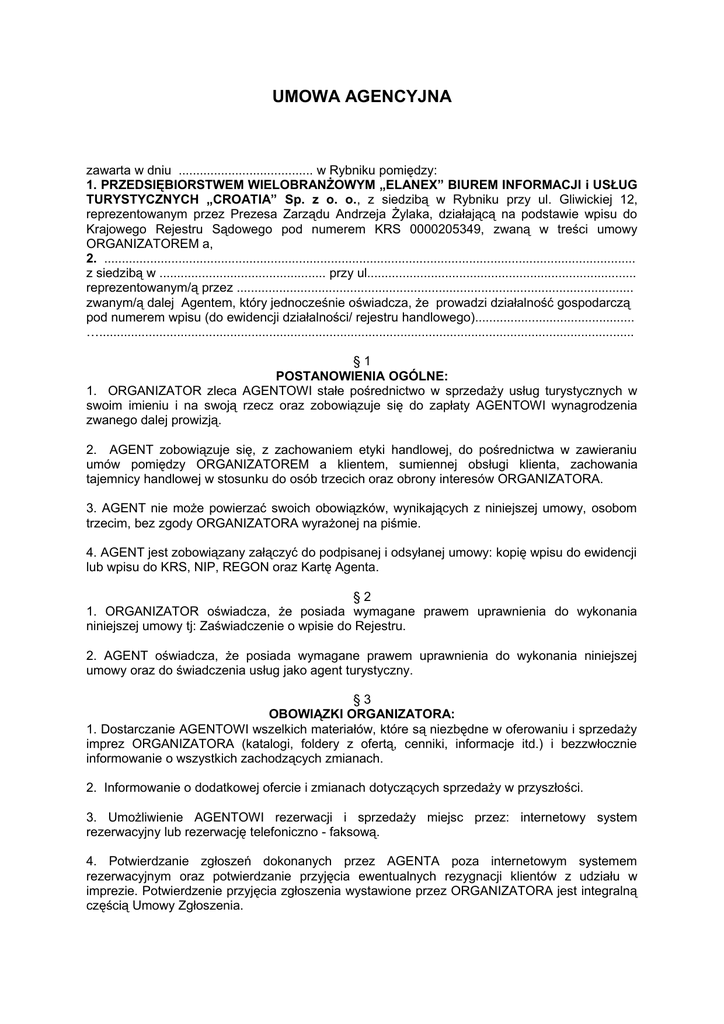 UMOWA AGENCYJNA zawarta w dniu ...................................... w Rybniku pomiędzy: 1. PRZEDSIĘBIORSTWEM WIELOBRANŻOWYM „ELANEX” BIUREM INFORMACJI i USŁUG TURYSTYCZNYCH „CROATIA” Sp. z o. o., z siedzibą w Rybniku przy ul. Gliwickiej 12, reprezentowanym przez Prezesa Zarządu Andrzeja Żylaka, działającą na podstawie wpisu do Krajowego Rejestru Sądowego pod numerem KRS 0000205349, zwaną w treści umowy ORGANIZATOREM a, 2. ...................................................................................................................................................... z siedzibą w ............................................... przy ul............................................................................ reprezentowanym/ą przez ................................................................................................................ zwanym/ą dalej Agentem, który jednocześnie oświadcza, że prowadzi działalność gospodarczą pod numerem wpisu (do ewidencji działalności/ rejestru handlowego)............................................. …....................................................................................................................................................... §1 POSTANOWIENIA OGÓLNE: 1. ORGANIZATOR zleca AGENTOWI stałe pośrednictwo w sprzedaży usług turystycznych w swoim imieniu i na swoją rzecz oraz zobowiązuje się do zapłaty AGENTOWI wynagrodzenia zwanego dalej prowizją. 2. AGENT zobowiązuje się, z zachowaniem etyki handlowej, do pośrednictwa w zawieraniu umów pomiędzy ORGANIZATOREM a klientem, sumiennej obsługi klienta, zachowania tajemnicy handlowej w stosunku do osób trzecich oraz obrony interesów ORGANIZATORA. 3. AGENT nie może powierzać swoich obowiązków, wynikających z niniejszej umowy, osobom trzecim, bez zgody ORGANIZATORA wyrażonej na piśmie. 4. AGENT jest zobowiązany załączyć do podpisanej i odsyłanej umowy: kopię wpisu do ewidencji lub wpisu do KRS, NIP, REGON oraz Kartę Agenta. §2 1. ORGANIZATOR oświadcza, że posiada wymagane prawem uprawnienia do wykonania niniejszej umowy tj: Zaświadczenie o wpisie do Rejestru. 2. AGENT oświadcza, że posiada wymagane prawem uprawnienia do wykonania niniejszej umowy oraz do świadczenia usług jako agent turystyczny. §3 OBOWIĄZKI ORGANIZATORA: 1. Dostarczanie AGENTOWI wszelkich materiałów, które są niezbędne w oferowaniu i sprzedaży imprez ORGANIZATORA (katalogi, foldery z ofertą, cenniki, informacje itd.) i bezzwłocznie informowanie o wszystkich zachodzących zmianach. 2. Informowanie o dodatkowej ofercie i zmianach dotyczących sprzedaży w przyszłości. 3. Umożliwienie AGENTOWI rezerwacji i sprzedaży miejsc przez: internetowy system rezerwacyjny lub rezerwację telefoniczno - faksową. 4. Potwierdzanie zgłoszeń dokonanych przez AGENTA poza internetowym systemem rezerwacyjnym oraz potwierdzanie przyjęcia ewentualnych rezygnacji klientów z udziału w imprezie. Potwierdzenie przyjęcia zgłoszenia wystawione przez ORGANIZATORA jest integralną częścią Umowy Zgłoszenia. 5. Zwrot AGENTOWI należności z tytułu rezygnacji klienta z udziału w imprezie, po dokonaniu zgodnych z Warunkami Uczestnictwa potrąceń. 6. Dokonywanie zwrotu całości otrzymanych od AGENTA należności w przypadku anulacji imprezy z przyczyn leżących po stronie ORGANIZATORA. 7. Przyjmowanie i rozpatrywanie reklamacji oraz ponoszenie odpowiedzialności wobec klientów będących uczestnikami imprez, za niewykonanie lub nienależyte wykonanie świadczeń będących przedmiotem umowy z klientem. 8. Za niewykonanie lub nienależyte wykonanie usług zawartych w umowie Biuro odpowiada na zasadach określonych w Kodeksie Cywilnym. Wszelkie odszkodowania są przyznawane wyłącznie na podstawie uzasadnionej i udokumentowanej szkody (potwierdzenie na voucherze u recepcjonisty lub przedstawiciela biura), powstałej w związku z niewykonaniem lub nienależytym wykonaniem umowy przez Biuro. Biuro ma obowiązek dokonania zwrotu wymaganych części lub całości wpłat za imprezę lub innych uzasadnionych roszczeń najpóźniej do 7 dni od daty uznania reklamacji, bez naliczania odsetek. §4 OBOWIĄZKI AGENTA: 1. Propagowanie, składanie ofert i sprzedaż wczasów oraz pozostałych usług ORGANIZATORA w sieci swojej sprzedaży. 2. Udzielanie klientom pełnych i rzetelnych informacji, zgodnych z otrzymanymi materiałami, na temat oferty ORGANIZATORA oraz niezwłoczne przekazywanie klientom informacji na temat ewentualnych zmian tej oferty. 3. Dokładne zapoznanie się z Warunkami Uczestnictwa oraz staranne zapoznawanie klienta z Warunkami Uczestnictwa, będącymi integralną częścią Umowy Agencyjnej oraz Umowy Zgłoszenia. 4. Każdorazowe sprawdzenie stanu wolnych miejsc przed podpisaniem z klientem Umowy Zgłoszenia, a następnie jej zatwierdzenie poprzez przesłanie faxem starannie wypełnionego druku Umowy Zgłoszenia ORGANIZATORA. Brak powyższego jest równoznaczny z anulowaniem rezerwacji wstępnej. 5. Przyjmowanie od klientów wpłat za imprezy, zgodnie z Warunkami Uczestnictwa. 6. Przekazywanie wpłat pobranych od klienta nie później niż do 3 dni od momentu ich pobrania wyznaczonego przez Warunki Uczestnictwa. W przypadku zgłoszenia klienta w terminie krótszym niż 30 dni przed imprezą AGENT ma obowiązek niezwłocznie przekazać pobraną od klienta należność oraz przesłać faxem potwierdzenie przelewu bankowego. Całość należności musi być przekazana do ORGANIZATORA przed datą wyjazdu klienta. W przypadku jej braku ORGANIZATOR ma prawo anulować rezerwację i poinformować o tym fakcie klienta. Wpłaty należy przekazywać na poniższe konto ORGANIZATORA: Bank Millennium 27 1160 2202 0000 0002 0948 5592 7. Agent zobowiązuje się do niezwłocznego wystawienia Faktury VAT, na przyznaną mu prowizję. Faktura VAT powinna być przesłana na adres ORGANIZATORA w terminie do 7 dni od daty otrzymania pełnej wpłaty przez klien