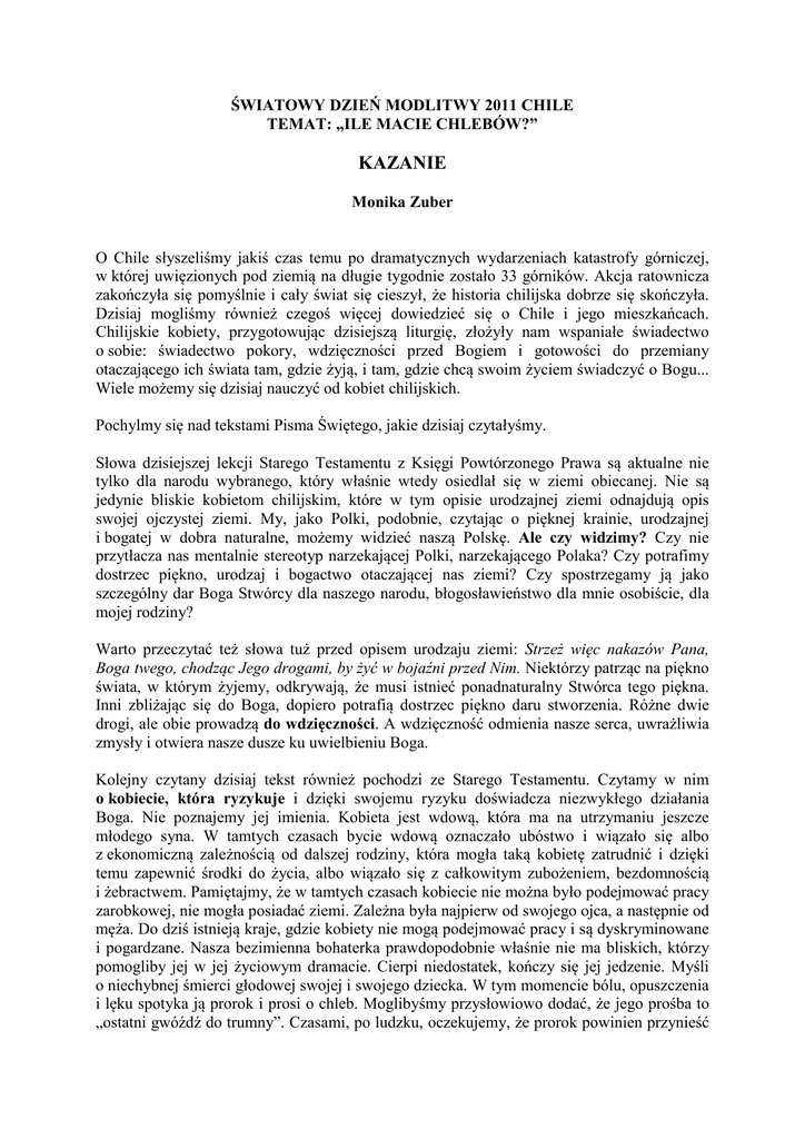 ŚWIATOWY DZIEŃ MODLITWY 2011 CHILE TEMAT: „ILE MACIE CHLEBÓW?” KAZANIE Monika Zuber O Chile słyszeliśmy jakiś czas temu po dramatycznych wydarzeniach katastrofy górniczej, w której uwięzionych pod ziemią na długie tygodnie zostało 33 górników. Akcja ratownicza zakończyła się pomyślnie i cały świat się cieszył, że historia chilijska dobrze się skończyła. Dzisiaj mogliśmy również czegoś więcej dowiedzieć się o Chile i jego mieszkańcach. Chilijskie kobiety, przygotowując dzisiejszą liturgię, złożyły nam wspaniałe świadectwo o sobie: świadectwo pokory, wdzięczności przed Bogiem i gotowości do przemiany otaczającego ich świata tam, gdzie żyją, i tam, gdzie chcą swoim życiem świadczyć o Bogu... Wiele możemy się dzisiaj nauczyć od kobiet chilijskich. Pochylmy się nad tekstami Pisma Świętego, jakie dzisiaj czytałyśmy. Słowa dzisiejszej lekcji Starego Testamentu z Księgi Powtórzonego Prawa są aktualne nie tylko dla narodu wybranego, który właśnie wtedy osiedlał się w ziemi obiecanej. Nie są jedynie bliskie kobietom chilijskim, które w tym opisie urodzajnej ziemi odnajdują opis swojej ojczystej ziemi. My, jako Polki, podobnie, czytając o pięknej krainie, urodzajnej i bogatej w dobra naturalne, możemy widzieć naszą Polskę. Ale czy widzimy? Czy nie przytłacza nas mentalnie stereotyp narzekającej Polki, narzekającego Polaka? Czy potrafimy dostrzec piękno, urodzaj i bogactwo otaczającej nas ziemi? Czy spostrzegamy ją jako szczególny dar Boga Stwórcy dla naszego narodu, błogosławieństwo dla mnie osobiście, dla mojej rodziny? Warto przeczytać też słowa tuż przed opisem urodzaju ziemi: Strzeż więc nakazów Pana, Boga twego, chodząc Jego drogami, by żyć w bojaźni przed Nim. Niektórzy patrząc na piękno świata, w którym żyjemy, odkrywają, że musi istnieć ponadnaturalny Stwórca tego piękna. Inni zbliżając się do Boga, dopiero potrafią dostrzec piękno daru stworzenia. Różne dwie drogi, ale obie prowadzą do wdzięczności. A wdzięczność odmienia nasze serca, uwrażliwia zmysły i otwiera nasze dusze ku uwielbieniu Boga. Kolejny czytany dzisiaj tekst również pochodzi ze Starego Testamentu. Czytamy w nim o kobiecie, która ryzykuje i dzięki swojemu ryzyku doświadcza niezwykłego działania Boga. Nie poznajemy jej imienia. Kobieta jest wdową, która ma na utrzymaniu jeszcze młodego syna. W tamtych czasach bycie wdową oznaczało ubóstwo i wiązało się albo z ekonomiczną zależnością od dalszej rodziny, która mogła taką kobietę zatrudnić i dzięki temu zapewnić środki do życia, albo wiązało się z całkowitym zubożeniem, bezdomnością i żebractwem. Pamiętajmy, że w tamtych czasach kobiecie nie można było podejmować pracy zarobkowej, nie mogła posiadać ziemi. Zależna była najpierw od swojego ojca, a następnie od męża. Do dziś istnieją kraje, gdzie kobiety nie mogą podejmować pracy i są dyskryminowane i pogardzane. Nasza bezimienna bohaterka prawdopodobnie właśnie nie ma bliskich, którzy pomogliby jej w jej życiowym dramacie. Cierpi niedostatek, kończy się jej jedzenie. Myśli o niechybnej śmierci głodowej swojej i swojego dziecka. W tym momencie bólu, opuszczenia i lęku spotyka ją prorok i prosi o chleb. Moglibyśmy przysłowiowo dodać, że jego prośba to „ostatni gwóźdź do trumny”. Czasami, po ludzku, oczekujemy, że prorok powinien przynieść pomoc, a nie kolejne wyzwanie. Kobieta nie ma już nic do stracenia, pogodziła się ze swoim nieszczęściem i bólem. Ostatnią mąkę i oliwę zużywa, by poczęstować gościa. Tak, jak było dzisiaj już wspomniane, że są ludzie, którzy prawie nic nie mają, a mimo to dzielą się z potrzebującymi. Może po prostu wiedzą, jaki posmak w ustach ma głód? Może wiedzą, jak upokarzające i bolesne jest prosić o pomoc? Może doświadczyli, co to znaczy być zależnym od jałmużny innych? Wdowa w swoim cierpieniu i upadku doświadcza, że oddany ostatni kawałek chleba mnoży się, ilekroć dzieli go między siebie, syna i gościa, który zatrzymał się w jej domu. Dzień za dniem Bóg błogosławi, pomnaża i napełnia naczynia. Niektórzy mogliby powiedzieć, że ryzyko się opłaciło. Jednak lepiej byłoby powiedzieć, że Bóg bliski jest naszemu cierpieniu. Przychodzi do nas, kiedy dręczą nas problemy, kiedy opadamy z sił i zachęca: Doświadcz mnie! Zobacz, że jestem źródłem nadziei i Cię nie opuszczę... Wdowa nie tylko zyskała pożywienie dla siebie, dla swojego dziecka, ale również towarzystwo i wsparcie w postaci proroka. Kogoś, z kim mogła podzielić choć w części swój codzienny trud przeżycia. Nasz Bóg nie jest Bogiem łatwych odpowiedzi. Może dlatego jest takim doskonałym pedagogiem? Kiedy uczniowie Jezusa w czytanej dzisiaj Ewangelii przychodzą do niego z problemem, mają już gotową również odpowiedź. Zachowują się bardzo podobnie do nas. Przyjrzyjmy się, jak doskonale przygotowali całą strategię. Opisali kontekst sytuacyjny, narysowali najbardziej logiczne rozwiązanie i przedstawili swojemu Nauczycielowi, co powinien w tej sytuacji zrobić. Dzisiaj moglibyśmy jeszcze tylko dodać: prosimy o pozytywne rozpatrzenie naszej prośby. Jako chrześcijanie też podobnie działamy. Widzimy otaczające nas problemy, bolączki świata, w którym żyjemy, ludzi, którzy potrzebują pomocy... Odpowiedzi na problemy, jakie widzimy są proste – jak i nasze modlitwy: „Boże uzdrów ich. Boże uratuj ich. Boże pomóż im. Boże wesprzyj ich. Boże ześlij deszcz, lub Boże powstrzymaj deszcz...” Co w odpowiedzi słyszą uczniowie? Co im mówi Jezus? WY im dajcie jeść! Uczniowie są zdezorientowani. Nie takiej odpowiedzi oczekiwali. Nie o to im chodziło. Cóż mogą zrobić ze swoimi oszczędnościami? Nie starczy ich, by kupić odpowiedniej ilości pożywienia dla wszystkich... My również skupiamy się na tym, że mamy mało, niewyst