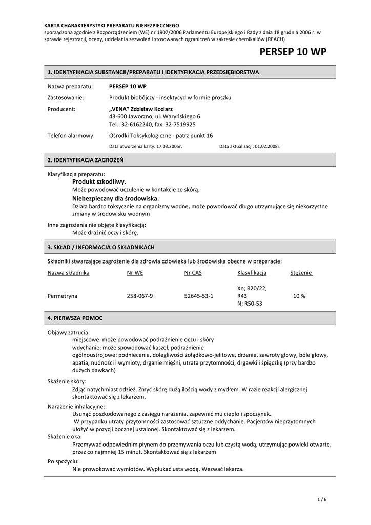 KARTA CHARAKTERYSTYKI PREPARATU NIEBEZPIECZNEGO sporządzona zgodnie z Rozporządzeniem (WE) nr 1907/2006 Parlamentu Europejskiego i Rady z dnia 18 grudnia 2006 r. w sprawie rejestracji, oceny, udzielania zezwoleń i stosowanych ograniczeń w zakresie chemikaliów (REACH) PERSEP 10 WP 1. IDENTYFIKACJA SUBSTANCJI/PREPARATU I IDENTYFIKACJA PRZEDSIĘBIORSTWA Nazwa preparatu: PERSEP 10 WP Zastosowanie: Produkt biobójczy ‐ insektycyd w formie proszku Producent: „VENA” Zdzisław Koziarz 43‐600 Jaworzno, ul. Waryńskiego 6 Tel.: 32‐6162240, fax: 32‐7519925 Telefon alarmowy Ośrodki Toksykologiczne ‐ patrz punkt 16 Data utworzenia karty: 17.03.2005r. Data aktualizacji: 01.02.2008r. 2. IDENTYFIKACJA ZAGROŻEŃ Klasyfikacja preparatu: Produkt szkodliwy. Może powodować uczulenie w kontakcie ze skórą. Niebezpieczny dla środowiska. Działa bardzo toksycznie na organizmy wodne, może powodować długo utrzymujące się niekorzystne zmiany w środowisku wodnym Inne zagrożenia nie objęte klasyfikacją: Może drażnić oczy i skórę. 3. SKŁAD / INFORMACJA O SKŁADNIKACH Składniki stwarzające zagrożenie dla zdrowia człowieka lub środowiska obecne w preparacie: Nazwa składnika Nr WE Nr CAS Klasyfikacja Stężenie Permetryna 258‐067‐9 52645‐53‐1 Xn; R20/22, R43 N; R50‐53 10 % 4. PIERWSZA POMOC Objawy zatrucia: miejscowe: może powodować podrażnienie oczu i skóry wdychanie: może spowodować kaszel, podrażnienie ogólnoustrojowe: podniecenie, dolegliwości żołądkowo‐jelitowe, drżenie, zawroty głowy, bóle głowy, apatia, nudności i wymioty, drganie mięśni, utrata przytomności, drgawki i śpiączkę (przy bardzo dużych dawkach) Skażenie skóry: Zdjąć natychmiast odzież. Zmyć skórę dużą ilością wody z mydłem. W razie reakcji alergicznej skontaktować się z lekarzem. Narażenie inhalacyjne: Usunąć poszkodowanego z zasięgu narażenia, zapewnić mu ciepło i spoczynek. W przypadku utraty przytomności zastosować sztuczne oddychanie. Pacjentów nieprzytomnych ułożyć w pozycji bocznej ustalonej. Skontaktować się z lekarzem. Skażenie oka: Przemywać odpowiednim płynem do przemywania oczu lub czystą wodą, utrzymując powieki otwarte, przez co najmniej 15 minut. Skontaktować się z lekarzem Po spożyciu: Nie prowokować wymiotów. Wypłukać usta wodą. Wezwać lekarza. 1 / 6 KARTA CHARAKTERYSTYKI PREPARATU NIEBEZPIECZNEGO sporządzona zgodnie z Rozporządzeniem (WE) nr 1907/2006 Parlamentu Europejskiego i Rady z dnia 18 grudnia 2006 r. w sprawie rejestracji, oceny, udzielania zezwoleń i stosowanych ograniczeń w zakresie chemikaliów (REACH) PERSEP 10 WP Informacja dla lekarzy: Permetryna należy do toksyn kanałów sodowych, powoduje obniżenie progu pobudzenia nerwów czuciowych i przedłużone pobudzenie neuronalne. Antidotum brak. Stosować leczenie objawowe. Witamina E zmniejsza nasilenie parestezji. 5. POSTĘPOWANIE W PRZYPADKU POŻARU Zalecenia ogólne: Usunąć z zagrożonego obszaru osoby niepowołane, niebiorące udziału w likwidowaniu pożaru. Usunąć źródła zapłonu, nie palić. W razie potrzeby wezwać Straż Pożarną tel. 998 Właściwe środki gaśnicze Gaśnice pianowe, śniegowe (CO2), proszkowe lub mgła wodna Niewłaściwe środki gaśnicze Uwaga! Preparat bardzo toksyczny dla organizmów wodnych ‐ nie stosować wody w formie silnego strumienia wodnego. Spływającą wodę ograniczać, np. tymczasową barierą ziemną Środki ochrony indywidualnej dla strażaków: Stosować odzież ochronną oraz w razie potrzeby maskę przeciwgazową. 6. POSTĘPOWANIE W PRZYPADKU NIEZAMIERZONEGO UWOLNIENIA DO ŚRODOWISKA Osobiste środki ostrożności Unikać kontaktu ze skórą i oczami, chronić drogi oddechowe. Stosować odzież ochronną (roboczą, chroniąca przed zabrudzeniem), rękawice (gumowe lub tworzywowe), ochronę twarzy (maska przeciwpyłowa). Środki ostrożności w zakresie ochrony środowiska: Uwaga! Preparat bardzo toksyczny dla organizmów wodnych ‐ nie dopuszczać do przedostania się do ścieków, kanalizacji i cieków wodnych. Metody oczyszczania Zlokalizować i zabezpieczyć wysyp. Zabezpieczyć teren i przystąpić do usuwania awarii. Zmieść, a najlepiej zebrać odkurzaczem produkt, wykorzystując sprzęt wyposażony w filtr przeciwpyłowy. Przenieść zabrany materiał do odpowiedniego plastikowego pojemnika, oznakować i przechowywać bezpiecznie do czasu usunięcia. Usuwać zgodnie z pkt 13. 7. POSTĘPOWANIE Z SUBSTANCJĄ/PREPARATEM I JEJ/JEGO MAGAZYNOWANIE Obchodzenie się z preparatem Przed zastosowaniem preparatu zapoznać się z tekstem etykiety. Zapobiegać kontaktowi z ustami, ze skórą i oczami. Podczas pracy nie jeść, nie pić i nie palić. Przed jedzeniem, piciem lub paleniem umyć ręce i twarz. Przechowywanie Preparat przechowywać pod zamknięciem, w miejscu niedostępnym dla dzieci, osób niepowołanych i zwierząt domowych; z dala od żywności, napojów i pasz dla zwierząt; w oryginalnym i szczelnym opakowaniu; w chłodnym (w temperaturze 0 do 30oC), suchym i dobrze wentylowanym pomieszczeniu. 2 / 6 KARTA CHARAKTERYSTYKI PREPARATU NIEBEZPIECZNEGO sporządzona zgodnie z Rozporządzeniem (WE) nr 1907/2006 Parlamentu Europejskiego i Rady z dnia 18 grudnia 2006 r. w sprawie rejestracji, oceny, udzielania zezwoleń i stosowanych ograniczeń w zakresie chemikaliów (REACH) PERSEP 10 WP 8. KONTROLA NARAŻENIA I ŚRODKI OCHRONY INDYWIDUALNEJ Najwyższe dopuszczalne stężenie w miejscu pracy: NDS, NDSCh ‐ brak Rozporządzenie Ministra Pracy i Polityki Społecznej z dnia 29 listopada 2002 r. w sprawie najwyższych dopuszczalnych stężeń i natężeń czynników szkodliwych dla zdrowia w środowisku pracy (Dz.U. 2002 Nr 217, poz. 1833). Kontrola narażenia – środki techniczne: Wydajna wentylacja na stanowisku pracy w pomieszczeniach zamkniętych. Higiena pracy: Uwzględniać środki bezpieczeństwa podane w etykiecie preparatu jak również przepisy bezpieczeństwa i higieny pra