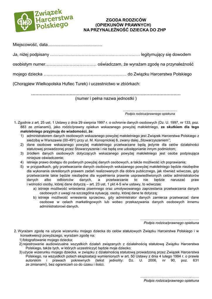 ZGODA RODZICÓW (OPIEKUNÓW PRAWNYCH) NA PRZYNALEŻNOŚĆ DZIECKA DO ZHP Miejscowość, data.............................................. Ja, niżej podpisany ……………………………………………………… legitymujący się dowodem osobistym numer……………………………… oświadczam, że wyrażam zgodę na przynależność mojego dziecka ………………………………...……………….. do Związku Harcerstwa Polskiego (Chorągiew Wielkopolska Hufiec Turek) i uczestnictwo w zbiórkach: …………………………………………………………………………………………… (numer i pełna nazwa jednostki ) …….………………………………..…… Podpis rodzica/prawnego opiekuna 1. Zgodnie z art. 25 ust. 1 Ustawy z dnia 29 sierpnia 1997 r. o ochronie danych osobowych (Dz. U. 1997, nr 133, poz. 883 ze zmianami), jako rodzic/prawny opiekun wskazanego powyżej małoletniego, ze skutkiem dla tego małoletniego przyjmuję do wiadomości, że: 1) administratorem danych osobowych wskazanego powyżej małoletniego jest Związek Harcerstwa Polskiego z siedzibą w Warszawie (00-491) przy ul. M. Konopnickiej 6, zwany dalej „Stowarzyszeniem”; 2) dane osobowe wskazanego powyżej małoletniego przetwarzane będą jedynie dla celów działalności statutowej prowadzonej przez Stowarzyszenie i nie będą one udostępnianie innym podmiotom; 3) źródłem danych osobowych dotyczących wskazanego powyżej małoletniego jest osoba podpisująca niniejsze oświadczenie; 4) istnieje prawo dostępu do podanych powyżej danych osobowych, a także możliwość ich poprawiania; 5) w przypadkach, gdy przetwarzanie danych osobowych wskazanego powyżej małoletniego będzie niezbędne dla wykonania określonych prawem zadań realizowanych dla dobra publicznego, jak również wówczas, gdy przetwarzanie takie będzie niezbędne dla wypełnienia prawnie usprawiedliwionych celów administratorów danych albo odbiorców danych, a przetwarzanie to nie będzie naruszać praw i wolności osoby, której dane dotyczą – art. 23 ust. 1 pkt 4-5 w/w ustawy, to wówczas: a) istnieje możliwość wniesienia pisemnego oraz umotywowanego zaprzestania przetwarzania danych osobowych z uwagi na szczególna sytuację, osoby, której dane te dotyczą; b) istnieje możliwość wniesienia sprzeciwu, gdy administrator danych zamierza przetwarzać dane osobowe w celach marketingowych lub wobec przekazywania danych osobowych innemu administratorowi danych. ……………………………………..…… Podpis rodzica/prawnego opiekuna 2. Wyrażam zgodę na użycie wizerunku mojego dziecka do celów statutowych Związku Harcerstwa Polskiego i w konsekwencji powyższego, wyrażam zgodę na: 1) fotografowanie mojego dziecka; 2) rejestrowanie audiowizualne wszystkich działań związanych z działalnością statutową Związku Harcerstwa Polskiego, także tych, w których uczestniczyć będzie moje dziecko; 3) użycie wizerunku mojego dziecka, w związku z działalnością statutową prowadzoną przez Związek Harcerstwa Polskiego, na wszystkich polach eksploatacji wymienionych w art. 50 Ustawy z dnia 4 lutego 1994 r. o prawie autorskim i prawach pokrewnych (tekst jednolity: Dz. U. 2006, nr 90, poz. 631 ze zmianami), bez ograniczeń co do czasu i ilości. ……………………………………..…… Podpis rodzica/prawnego opiekuna Imię i nazwisko dziecka Data urodzenia PESEL Adres Numer telefonu dziecka Numery kontaktowe (telefon) do rodziców opiekunów Adres e-mail Szkoła i klasa Alergie/ choroba lokomocyjna/ inne choroby Przynależność do ZHP jest równoznaczna z wyrażeniem zgody na umieszczenie danych osobowych dziecka w Ewidencji Członkowskiej ZHP. W jaki sposób jesteśmy w stanie pomóc drużynie/ gromadzie?1 …......................................................................................................................................................... ............................................................................................................................................................ ............................................................................................................................................................ Inne uwagi w sprawie działania drużyny/ gromady: …........................................................................................................................................................ …......................................................................................................................................................... …......................................................................................................................................................... Wyrażam zgodę/ nie wyrażam zgody (niepotrzebne skreślić), aby mój syn/córka …............................................................................................. wracał/a sam/a do domu po zbiórce. ……………………………………..…… Podpis rodzica/prawnego opiekuna 1 Pytanie to ma na celu stworzenie potencjalnej bazy sojuszników drużyny/ gromady. Może to pomóc śródrocznej działalności. Jeśli np. mają Państwo z racji wykonywanego zawodu lub kontaktów dostęp do bezpłatnych środków opatrunkowych, które pomogłyby nam uzupełnić apteczkę lub do artykułów papierniczych, które mogliby Państwo przekazać gromadzie, jest to dla nas bardzo ważna informacja. Może wiedzą Państwo, gdzie jest dobre miejsce na zorganizowanie biwaku lub znają policjanta, którego będziemy mogli odwiedzić przy okazji zdobywania sprawności. Może będą chcieli Państwo wspomóc ZHP 1% podatku na rzecz organizacji pożytku publicznego. Każda pomoc jest dla nas ważna, a mając taką bazę, będziemy wiedzieli, do kogo się zwrócić we właściwym momencie.