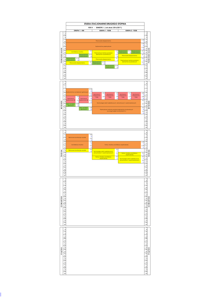 STUDIA STACJONARNE DRUGIEGO STOPNIA ROK II - SEMESTR 3 ( rok akad. 2016/2017 ) GRUPA 1 - KBI GRUPA 1 - TOZB GRUPA 2 - TOZB 715 715 800 800 8 15 815 9 00 Planowanie eksperymentu 1000 1015 1100 Budownictwo przemysłowe Architektura mostów 1315 Budownictwo przemysłowe 1400 1415 15 00 15 15 1600 Budownictwo przemysłowe 1 D-10 Przemysłowe metody produkcji elementów budowlanych 33 D-10 Planowanie eksperymentu S-27 54 Planowanie eksperymentu 33 S-27 Budownictwo 54 przemysłowe D-1 Budownictwo 2 przemysłowe D-10 Budownictwo 33 przemysłowe Planowanie eksperymentu D-1 2 D-10 Przemysłowe metody produkcji elementów budowlanych 33 1615 Budownictwo przemysłowe 1700 1015 33 1100 A-28 1115 33 1200 D-7 1215 56 1300 D-1 1315 2 1400 S-27 1415 54 1500 S-27 1515 54 1600 D-10 1615 33 1700 1715 1715 1800 1800 18 15 1815 19 00 1900 1915 1915 2000 2000 15 715 800 800 815 815 7 900 900 915 1000 10 15 Budownictwo na terenach górniczych 1100 WTOREK 1215 D-4 Seminarium Dyplomowe KBI 1300 13 15 14 00 1415 1500 915 26 1000 D-10 26 1115 1200 D-10 D-10 8 40 Seminarium D-4 Dyplomowe KBI D-10 8 Bud. na teren. górniczych 40 S-28 LKM Seminarium Dyplomowe TOZB 3 LKM LFB Seminarium Dyplomowe TOZB 3 28 LFB S-27 Seminarium Dyplomowe TOZB 39 36 S-27 Seminarium Dyplomowe TOZB 36 Technologia robót rozbiórkowych, remontowych i wykończeniowych 56 Bud. na teren. górniczych S-28 56 1515 Przemysłowe metody produkcji elementów budowlanych (co drugi tydzień od 02.03.2017r.) 1600 LMB 1015 27 1100 LMB 1115 20 1200 D-9 1215 1 1300 D-9 1315 1 1400 A-0 1415 50 1500 A-0 1515 50 1600 16 15 1615 17 00 1700 1715 1715 1800 1800 1815 1815 1900 1900 19 15 1915 20 00 2000 715 715 800 8 800 15 900 915 Betonowe konstrukcje wysokie 1000 1015 ŚRODA 11 900 D-4 915 19 1000 Architektura mostów 37 D-4 37 1215 D-4 1300 1315 14 00 14 15 1515 1600 Betonowe konstrukcje wysokie 55 Formy i struktury architekury współczesnej A-28 1015 41 1100 A-28 1115 41 1200 1215 D-2 Technologia robót rozbiórkowych, remontowych i wykończeniowych D-2 21 Formy i struktury architekury współczesnej 1300 21 Formy i struktury architekury współczesnej D-6 41 Technologia robót rozbiórkowych, remontowych i wykończeniowych D-6 1315 41 1400 D-2 1415 21 1500 D-2 1515 21 1600 1615 1615 1700 1700 17 15 1715 18 00 1800 1815 1815 00 19 1915 00 19 1915 2000 2000 15 715 800 800 815 815 900 900 7 915 915 1000 1000 1015 1015 1100 1100 15 1115 1200 1200 1215 1215 1300 1300 1315 1315 14 00 1400 14 15 1415 1500 1500 1515 1515 1600 1600 1615 1615 17 00 1700 17 15 1715 1800 1800 1815 1815 1900 1900 1915 1915 2000 2000 715 715 800 800 815 815 900 900 11 CZWARTEK 815 19 1200 1500 PIĄTEK D-4 D-4 1100 15 WTOREK 1300 D-2 A-28 9 15 915 10 00 1000 1015 1015 1100 1100 11 15 1115 12 00 1200 1215 1215 1300 1300 1315 1315 1400 1400 1415 1415 15 00 1500 15 15 1515 1600 1600 1615 1615 1700 1700 1715 1715 18 00 1800 18 15 1815 1900 1900 1915 1915 2000 2000 ŚRODA 12 15 1000 CZWARTEK 12 00 915 2 PIĄTEK PONIEDZIAŁEK 1115 A-28 PONIEDZIAŁEK 900 915
