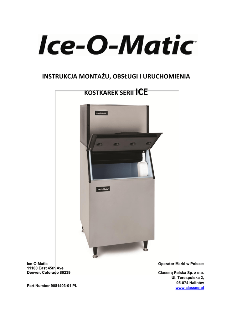 INSTRUKCJA MONTAŻU, OBSŁUGI I URUCHOMIENIA KOSTKAREK SERII ICE Ice-O-Matic 11100 East 45th Ave Denver, Colorado 80239 Part Number 9081403-01 PL Operator Marki w Polsce: Classeq Polska Sp. z o.o. Ul. Terespolska 2, 05-074 Halinów www.classeq.pl INSTRUKCJA OBSŁUGI DO MASZYN SERII ICE Jak używać niniejszy podręcznik Ice-O-Matic dostarcza niniejszy podręcznik jako pomoc dla użytkownika koocowego oraz technika serwisowego podczas instalacji i konserwacji maszyn do produkcji lodu z serii ICE. Nie wolno podejmowad prób instalacji, uruchamiania lub konserwacji maszyny bez dokładnego zapoznania się i zrozumienia treści niniejszego podręcznika. Jeśli, w trakcie użytkowania maszyny wystąpią okoliczności nieopisane w niniejszym podręczniku, należy skontaktowad się z Działem Serwisowym w sposób telefoniczny, za pomocą poczty elektronicznej lub tradycyjnej. Ice-O-Matic 11100 E. 45th Ave. Denver, Co. 80239 Attn: Technical Service Department E-Mail: [email protected] Lub Telefonicznie: 800-423-3367 All Departments 888-349-4423 Technical Assistance Only 303-371-3737 Lub: Classeq Polska E-Mail: [email protected] Tel. 22 813 03 25 W przypadku kontaktowania się z Działem Serwisowym należy podad: Numer modelu Numer seryjny Szczegółowy opis problemu Niniejszy podręcznik należy zachowad do celów referencyjnych. Podręczniki dotyczące części serwisowych dla maszyn z serii ICE są udostępniane oddzielnie. Maszyny do produkcji lodu oraz dozowniki Ice-O-Matic nie są przeznaczone do instalacji na zewnątrz. OSTRZEŻENIE: Podczas przeprowadzania czynności konserwacji lub naprawy maszyny do produkcji lodu, należy zawsze wyłączad zasilanie oraz doprowadzenie wody. UWAGA: Podczas przeprowadzania konserwacji lub napraw maszyny do produkcji lodu, należy zawsze używad sprzęt ochronny dla oczu. str. 2 INSTRUKCJA OBSŁUGI DO MASZYN SERII ICE Ważne! Dokładna inspekcja Urządzenie zostało dokładnie skontrolowane i zapakowane zgodnie ze specyfikacjami przewoźnika. Odpowiedzialnośd za bezpieczną dostawę ponosi przewoźnik. W razie wystąpienia uszkodzenia, odbiorca przesyłki musi złożyd skargę do przewoźnika oraz zachowad przesyłkę do celów inspekcji przeprowadzanej przez przewoźnika. Widzialne uszkodzenia Wszelkie zewnętrzne dowody uszkodzeo muszą zostad w pełni opisane i zanotowane na liście przewozowym podpisanym przez przedstawiciela przewoźnika. Skarga powinna zostad złożona na formularzu dostępnym u przewoźnika. Ukryte uszkodzenia Jeśli uszkodzenie nie było widoczne do momentu rozpakowania produktu, należy sporządzid pisemne żądanie inspekcji przez przewoźnika w terminie do 7 dni od daty dostawy. Następnie należy złożyd skargę za pomocą formularza dostępnego u przewoźnika. Skargi należy składad bez zbędnej zwłoki. Nie zwracad uszkodzonego produktu do Classeq Plska. str. 3 INSTRUKCJA OBSŁUGI DO MASZYN SERII ICE Wskazówki odnośnie instalacji W celu prawidłowej obsługi maszyny do produkcji lodu Ice-O-Matic, należy przestrzegad następujących wskazówek. Nieprzestrzegania tych wskazówek może prowadzid do utraty zdolności produkcyjnej, przedwczesnych awarii części oraz może byd przyczyną unieważnienia gwarancji. Temperatury zewnętrzne pracy maszyny: (Bez skraplacza) Minimalna temperatura pracy: 50 °F (10 °C) Maksymalna temperatura pracy 100 °F (38 °C) Uwaga: Maszyny do produkcji lodu oraz dozowniki Ice-O-Matic nie są przeznaczone do instalacji na zewnątrz. Woda wchodząca Minimalna temperatura wody wchodzącej: 40 °F (4,5 °C) Maksymalna temperatura wody wchodzącej: 100 °F (38 °C) Minimalne ciśnienie wody wchodzącej: 20 psi (1,4 bara) Maksymalne ciśnienie wody wchodzącej: 80 psi (4,1 bara) Uwaga: Jeśli ciśnienie wody będzie przekraczad wartośd 80 psi, należy zainstalowad regulator ciśnienia. Odprowadzenie wody Wszystkie linie odprowadzania wody muszą byd zainstalowane zgodnie z lokalnymi przepisami. Połączenia za pomocą rur elastycznych nie są zalecane. Wodę z pojemnika oraz wodę z parownika należy odprowadzad indywidualnie do kanału podłogowego. Używanie pomp kondensacyjnych do odprowadzania wody nie jest zalecane przez Ice-O-Matic. Ice-O-Matic nie ponosi odpowiedzialności za nieprawidłowo zainstalowany sprzęt. Filtracja wody System filtrowania wody należy zainstalowad wraz z maszyną do produkcji lodu. Wymagania odnośnie prześwitów Wolnostojące maszyny do produkcji lodu chłodzone powietrzem muszą posiadad odstęp wielkości przynajmniej 15 cm po bokach i z tyłu maszyny w celu prawidłowej cyrkulacji powietrza. Układanie w stosy Maszyny Ice-O-Matic z serii ICE nie są przeznaczone do układania w stosy. Używanie dozownika Maszyna do produkcji lodu z serii ICE jest zatwierdzona do użytku wraz z określonym dozownikiem, zobacz strona 4. Maszyny z serii ICE nie są zatwierdzone do użytku wraz z dozownikami. Specyfikacje elektryczne Zapoznad się z tabliczką znamionową umieszczoną w tylnej części maszyny w celu określenia prawidłowego napięcia oraz przerywacza prądowego. Upewnid się, czy maszyna nie jest zasilana dedykowanym obwodem. Maszyny z serii ICE nie są dostarczane wraz z przewodem zasilającym i muszą byd instalowane zgodnie z lokalnymi przepisami elektrycznymi. Regulacje Wypoziomowad maszyną w zakresie 2 mm we wszystkich kierunkach. Sprawdzid obsługę pojemnika pod katem prawidłowego funkcjonowania. Sprawdzid poziom wody w zbiorniku. Sprawdzid zawór regulacyjny wody, pod kątem prawidłowego chłodzenia wody. str. 4 INSTRUKCJA OBSŁUGI DO MASZYN SERII ICE str. 5 INSTRUKCJA OBSŁUGI DO MASZYN SERII ICE Zbiorniki (BIN) Maszyny z serii ICE 305-405-605-805-1005 są przeznaczone do użytku z następującymi zbiornikami (BINAMI) Ice-O-Matic B25, B40, B55 Lokalizacja: Maszyny do produkcji lodu Ice-O-Matic są przeznaczone do instalacji w pomieszczeniach zamkniętych i w kontrolowanym środowisku. Maszyny należy instalowad w miejscu, gdzie istnieje wystarczająca