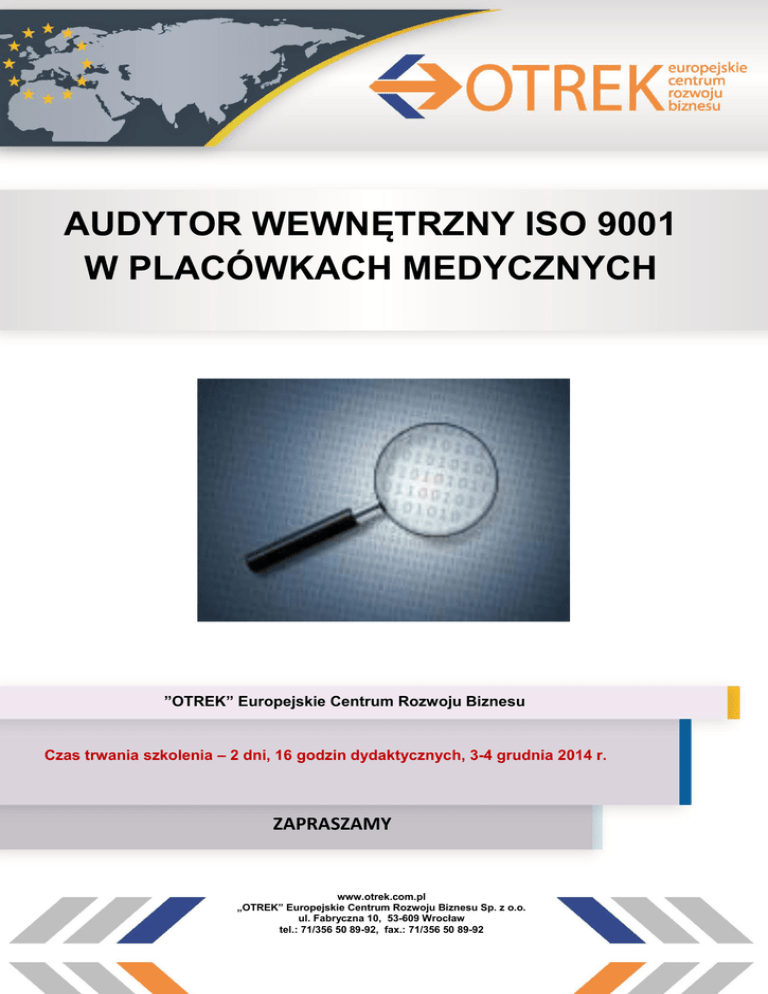 AUDYTOR WEWNĘTRZNY ISO 9001 W PLACÓWKACH MEDYCZNYCH ”OTREK” Europejskie Centrum Rozwoju Biznesu Czas trwania szkolenia – 2 dni, 16 godzin dydaktycznych, 3-4 grudnia 2014 r. ZAPRASZAMY www.otrek.com.pl „OTREK” Europejskie Centrum Rozwoju Biznesu Sp. z o.o. ul. Fabryczna 10, 53-609 Wrocław tel.: 71/356 50 89-92, fax.: 71/356 50 89-92 Wykładowca: Dr Paweł Skowron – od 2006 r. pracownik Jeleniogórskiego Wydziału Uniwersytetu Ekonomicznego we Wrocławiu (Katedra Zarządzania Jakością i Środowiskiem). Autor licznych publikacji naukowych na temat zarządzania jakością, zarządzania środowiskowego, bezpieczeństwa żywności oraz gospodarowania wartościami niematerialnymi. Współorganizator konferencji i warsztatów z zakresu systemów zarządzania zgodnych z normami ISO. Posiada bogate doświadczenie praktyczne we wdrażaniu i udoskonalaniu systemów zarządzania jakością w firmach. Ponadto posiada kwalifikacje audytora wewnętrznego systemu zarządzania: jakością, środowiskiem, bezpieczeństwem żywności, kwalifikacje audytora wiodącego systemu zarządzania jakością, kwalifikacje doradcy zawodowego – członka komisji indywidualnych programów rehabilitacyjnych. Adresaci: Kierownicy placówek medycznych, kandydaci do pełnienia funkcji audytora wewnętrznego systemu zarządzania jakością w placówce medycznej, audytorzy wewnętrzni systemów zarządzania jakością. Miejsce, czas i termin szkolenia: Sala szkoleniowa „OTREK” Europejskie Centrum Rozwoju Biznesu Sp. z o.o., ul. Fabryczna 10, 53-609 Wrocław, w godzinach 9:00 – 16:00, w wymiarze 16 h dydaktycznych, 2 dni, 3-4 grudnia 2014. Zgłoszenia: Zgłoszenie udziału szkoleniu należy przesłać faksem na nr 71/356 50 90, najpóźniej na 5 dni przed terminem rozpoczęcia zajęć. Formularz zgłoszenia w załączeniu lub do pobrania z naszej strony, www.otrek.com.pl Cena: Opłata za szkolenie wynosi 1050, 00 PLN + 23% VAT i obejmuje udział w szkoleniu, materiały dydaktyczne piśmiennicze, lunch, przerwy kawowe oraz zaświadczenie. W przypadku zgłoszenia dwóch i więcej osób z jednego podmiotu leczniczego, udzielamy upustu w wysokości 5%. Należność za udział w szkoleniu, prosimy przekazać przelewem, po otrzymaniu potwierdzenia o rozpoczęciu szkolenia, na konto: BZ WBK I/O Wrocław, Nr: 85 1090 2398 0000 0001 1426 1336 UWAGA! Szkolenie realizujemy także w formie ZAMKNIĘTEJ (wyłącznie dla pracowników jednego podmiotu leczniczego). Warunki realizacji (czas, miejsce, wymiar i cena) do uzgodnienia. Kontakt: Dodatkowych informacji udziela: Aneta Bigdoń Tel. 71/ 356-50-89, 607-907-957 E-mail: [email protected] Opis szkolenia: Celem szkolenia jest zapoznanie uczestników z wymaganiami normy ISO 9001:2008 w jednostce służby zdrowia oraz uzyskanie kompetencji audytora wewnętrznego systemu zarządzania jakością według normy ISO 9001:2008 w placówce służby zdrowia. Szkolenie prowadzone jest w formie interaktywnych wykładów oraz warsztatów z aktywnym udziałem uczestników. Podczas szkolenia omawiane są takie zagadnienia, jak: podejście procesowe, wymagania dotyczące dokumentacji, zaangażowanie kierownictwa, zapewnienie niezbędnych zasobów, realizacja i dostarczanie usług, doskonalenie. Uczestnicy szkolenia zostaną zapoznani z wymaganiami dotyczącymi planowania i nadzorowania audytów wewnętrznych oraz technikami ich przeprowadzania w placówce medycznej. Program szkolenia: 1. Rozwój systemów jakości, zasady zarządzania jakością. 2. Wymagania NFZ dotyczące stosowanych systemów znormalizowanych w placówkach medycznych. 3. Terminologia norm ISO serii 9000, zasady dokonywania wyłączeń. 4. Identyfikacja i zarządzanie procesami. 5. Odpowiedzialność kierownictwa. 6. Zarządzania zasobami. 7. Realizacja i dostarczanie usługi. 8. Doskonalenie. 9. Wymagania dotyczące dokumentacji. 10. Zmiany w normie ISO 9001:2015 11. Rola audytu w systemie jakości. 12. Terminologia dotycząca audytów 13. Zasady audytowania. 14. Planowanie działań audytowych. 15. Techniki prowadzenia audytu wewnętrznego. 16. Identyfikowanie i raportowanie niezgodności. 17. Komunikowanie i raportowanie ustaleń z audytu. 18. Kompetencje audytora wewnętrznego. 19. Egzamin. Po ukończeniu szkolenia uczestnik będzie: a) b) c) d) znał wymagania normy ISO 9001:2008, wiedział, jakie są planowane zmiany w wydaniu normy ISO 9001 w 2015 r., potrafił zaplanować audyt wewnętrznych w oparciu o normę ISO 9001, znał sposoby przeprowadzenia audytu wewnętrznego systemu zarządzania jakością, e) wiedział, jak zidentyfikować niezgodność, f) potrafił sporządzić raport z audytu wewnętrznego systemu zarządzania jakością. Warunkiem ukończenia szkolenia jest aktywny udział w zaplanowanych zajęciach oraz przystąpienie do egzaminu potwierdzającego uzyskane kompetencje audytora wewnętrznego systemu zarządzania jakością w placówce medycznej.