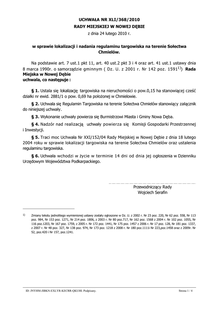 UCHWAŁA NR XLI/368/2010 RADY MIEJSKIEJ W NOWEJ DĘBIE z dnia 24 lutego 2010 r. w sprawie lokalizacji i nadania regulaminu targowiska na terenie Sołectwa Chmielów. Na podstawie art. 7 ust.1 pkt 11, art. 40 ust.2 pkt 3 i 4 oraz art. 41 ust.1 ustawy dnia 8 marca 1990r. o samorządzie gminnym ( Dz. U. z 2001 r. Nr 142 poz. 15911)) Rada Miejska w Nowej Dębie uchwala, co następuje : § 1. Ustala się lokalizację targowiska na nieruchomości o pow.0,15 ha stanowiącej cześć działki nr ewid. 2881/1 o pow. 0,69 ha położonej w Chmielowie. § 2. Uchwala się Regulamin Targowiska na terenie Sołectwa Chmielów stanowiący załącznik do niniejszej uchwały. § 3. Wykonanie uchwały powierza się Burmistrzowi Miasta i Gminy Nowa Dęba. § 4. Nadzór nad realizacją uchwały powierza się Komisji Gospodarki Przestrzennej i Inwestycji. § 5. Traci moc Uchwała Nr XXI/152/04 Rady Miejskiej w Nowej Dębie z dnia 18 lutego 2004 roku w sprawie lokalizacji targowiska na terenie Sołectwa Chmielów oraz ustalenia regulaminu targowiska. § 6. Uchwała wchodzi w życie w terminie 14 dni od dnia jej ogłoszenia w Dzienniku Urzędowym Województwa Podkarpackiego. Przewodniczący Rady Wojciech Serafin 1) Zmiany tekstu jednolitego wymienionej ustawy zostały ogłoszone w Dz. U. z 2002 r. Nr 23 poz. 220, Nr 62 poz. 558, Nr 113 poz. 984, Nr 153 poz. 1271, Nr 214 poz. 1806, z 2003 r. Nr 80 poz.717, Nr 162 poz. 1568 z 2004 r. Nr 102 poz. 1055, Nr 116 poz.1203, Nr 167 poz. 1759, z 2005 r. Nr 172 poz. 1441, Nr 175 poz. 1457 z 2006 r. Nr 17 poz. 128, Nr 181 poz. 1337, z 2007 r. Nr 48 poz. 327, Nr 138 poz. 974, Nr 173 poz. 1218 z 2008 r. Nr 180 poz.1111i Nr 223,poz.1458 oraz z 2009r. Nr 52, poz.420 i Nr 157, poz.1241. Załącznik do uchwały Nr XLI/368/2010 Rady Miejskiej w Nowej Dębie z dnia 24 lutego 2010 r. REGULAMIN TARGOWISKA W CHMIELOWIE § 1. 1. Targowisko zlokalizowane na nieruchomości o pow. 0,15 ha stanowiącej cześć działki o nr ewid. 2881/1 o pow . 0, 69 ha położonej w Chmielowie przeznaczone jest do prowadzenia działalności handlowej przez osoby fizyczne i inne uprawnione podmioty oraz przedsiębiorców ID: JNYHM-JIBKN-EXLYR-KECRR-QKUHI. Podpisany. Strona 1 / 4 prowadzących działalność gospodarczą w tym zakresie 2. Targowisko czynne jest : 1) we wtorki w godzinach od 600 do 1500. z 2007 r. Nr 48 poz. 327, Nr 138 poz. 974, Nr 173 poz. 1218 z 2008 r. Nr 180 poz.1111i Nr 223,poz.1458 oraz z 2009r. Nr 52, poz.420 i Nr 157, poz.1241. Załącznik do uchwały Nr XLI/368/2010 Rady Miejskiej w Nowej Dębie z dnia 24 lutego 2010 r. REGULAMIN TARGOWISKA W CHMIELOWIE § 1. 1. Targowisko zlokalizowane na nieruchomości o pow. 0,15 ha stanowiącej cześć działki o nr ewid. 2881/1 o pow . 0, 69 ha położonej w Chmielowie przeznaczone jest do prowadzenia działalności handlowej przez osoby fizyczne i inne uprawnione podmioty oraz przedsiębiorców prowadzących działalność gospodarczą w tym zakresie 2. Targowisko czynne jest : 1) we wtorki w godzinach od 600 do 1500. 2) w soboty w godzinach od godz. 6 00 do 15 00 3. Targowisko prowadzi osoba fizyczna lub prawna wyłoniona w drodze przetargu zwana dalej „dzierżawcą” . 4. Nadzór mad targowiskiem pełni Burmistrz Miasta i Gminy Nowa Dęba. § 2. 1. Na targowisku mogą być sprzedawane wszystkie towary, z wyjątkiem towarów, których sprzedaż jest zabroniona przez przepisy prawa, a w szczególności : 1) nafty, benzyny, spirytusu skażonego, trucizn, środków leczniczych, 2) nafty, benzyny, spirytusu skażonego, trucizn, środków leczniczych, 3) kamieni i metali szlachetnych oraz wykonanych z nich przedmiotów, 4) zagranicznych banknotów i monet, 5) ) broni, amunicji oraz artykułów pirotechnicznych, 6) towarów szkodliwych dla zdrowia, 7) innych artykułów, których sprzedaż jest zabroniona odrębnymi przepisami, 8) towarów pochodzących z kradzieży lub innego nielegalnego źródła. 2. W przypadku ujawnienia sprzedaży towarów wymienionych w ust. 1 pkt 6, 7, 8 dzierżawca targowiska powiadomi o tym fakcie właściwe organy tj. 1) Policję, 2) Straż Miejską, 3) Państwowego Powiatowego Inspektora Sanitarnego, 4) Państwową Inspekcję Handlową. § 3. 1. Sprzedaż odbywa się w miejscach do tego wyznaczonych. 2. Namioty handlowe lub inne urządzenia, w których prowadzony jest handel powinny być oznaczone imieniem i nazwiskiem osoby sprzedającej, a w przypadku osób prowadzących działalnoś ć gospodarczą nazwą i adresem firmy oraz numerem zaświadczenia o wpisie do ewidencji działalności gospodarczej 3. Osoba prowadząca handel na targowisku zobowiązana jest uwidocznić na towarach przeznaczonych do sprzedaży ich ceny w sposób zapewniający prostą i nie budzącą wątpliwości informację o ich wysokości. 4. Sprzedaż artykułó w s p ożywczych powinna być prowadzona zgodnie z przepisami i zasadami obowiązującymi w tym zakresie. ID: JNYHM-JIBKN-EXLYR-KECRR-QKUHI. Podpisany. Strona 2 / 4 § 4. Narzędzia pomiarowe używane na targowisku powinny mieć ważne cechy legalizacyjne oraz powinny być ustawione i użytkowane w ten sposób, aby kupujący mieli możliwość stwierdzenia prawidłowości i rzetelności ważenia i mierzenia. przeznaczonych do sprzedaży ich ceny w sposób zapewniający prostą i nie budzącą wątpliwości informację o ich wysokości. 4. Sprzedaż artykułó w s p ożywczych powinna być prowadzona zgodnie z przepisami i zasadami obowiązującymi w tym zakresie. § 4. Narzędzia pomiarowe używane na targowisku powinny mieć ważne cechy legalizacyjne oraz powinny być ustawione i użytkowane w ten sposób, aby kupujący mieli możliwość stwierdzenia prawidłowości i rzetelności ważenia i mierzenia. § 5. 1. Za handel na targowisku pobiera się dzienną opłatę targową w wysokości określonej uchwałą Rady Miejskiej w Nowej Dębie w sprawie wysokości opłaty targowej. 2. Stawki opłaty targowej oraz niniejszy regulamin winny być umieszczone na tablicy ogłoszeń usytuowanej n