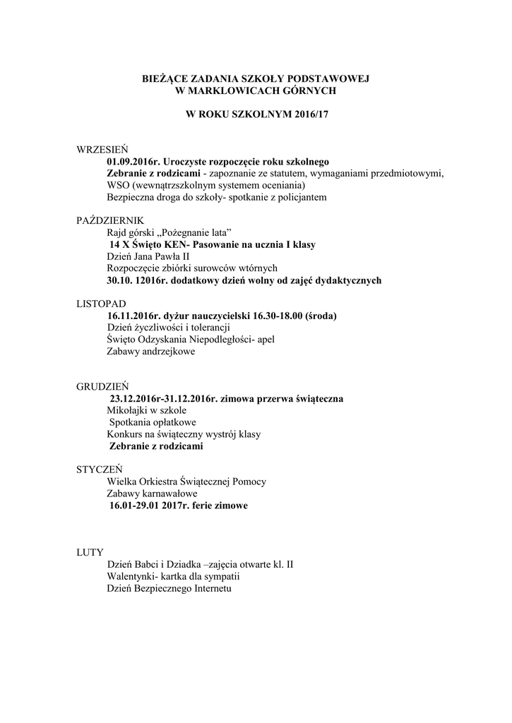 BIEŻĄCE ZADANIA SZKOŁY PODSTAWOWEJ W MARKLOWICACH GÓRNYCH W ROKU SZKOLNYM 2016/17 WRZESIEŃ 01.09.2016r. Uroczyste rozpoczęcie roku szkolnego Zebranie z rodzicami - zapoznanie ze statutem, wymaganiami przedmiotowymi, WSO (wewnątrzszkolnym systemem oceniania) Bezpieczna droga do szkoły- spotkanie z policjantem PAŹDZIERNIK Rajd górski „Pożegnanie lata” 14 X Święto KEN- Pasowanie na ucznia I klasy Dzień Jana Pawła II Rozpoczęcie zbiórki surowców wtórnych 30.10. 12016r. dodatkowy dzień wolny od zajęć dydaktycznych LISTOPAD 16.11.2016r. dyżur nauczycielski 16.30-18.00 (środa) Dzień życzliwości i tolerancji Święto Odzyskania Niepodległości- apel Zabawy andrzejkowe GRUDZIEŃ 23.12.2016r-31.12.2016r. zimowa przerwa świąteczna Mikołajki w szkole Spotkania opłatkowe Konkurs na świąteczny wystrój klasy Zebranie z rodzicami STYCZEŃ Wielka Orkiestra Świątecznej Pomocy Zabawy karnawałowe 16.01-29.01 2017r. ferie zimowe LUTY Dzień Babci i Dziadka –zajęcia otwarte kl. II Walentynki- kartka dla sympatii Dzień Bezpiecznego Internetu MARZEC Konkurs matematyczny KANGUR Pierwszy dzień wiosny –„Zielony dzień” 16.03.2017r. dyżur nauczycielski 16.30-18.00 ( środa) KWIECIEŃ Rekolekcje wielkopostne Światowy Dzień Ziemi 13.04-18.04.2017r. wiosenna przerwa świąteczna MAJ 02.05.2017r. dodatkowy dzień wolny od zajęć dydaktycznych 04-05.05.2017r. dodatkowy dzień wolny od zajęć dydaktycznych Obchody Konstytucji 3 Maja-apel Badanie efektów kształcenia Dzień Matki – zajęcia otwarte kl. I i III Rajd górski „ Powitanie wiosny” Zebranie z rodzicami CZERWIEC XVII Gminny Konkurs SUPER MATEMATYK kl. I-III Wycieczki klasowe Karta rowerowa uczniów klasy 4 Festyn szkolny/Dzień Sportu 23.06.2017r.uroczyste zakończenie roku szkolnego 2016/2017