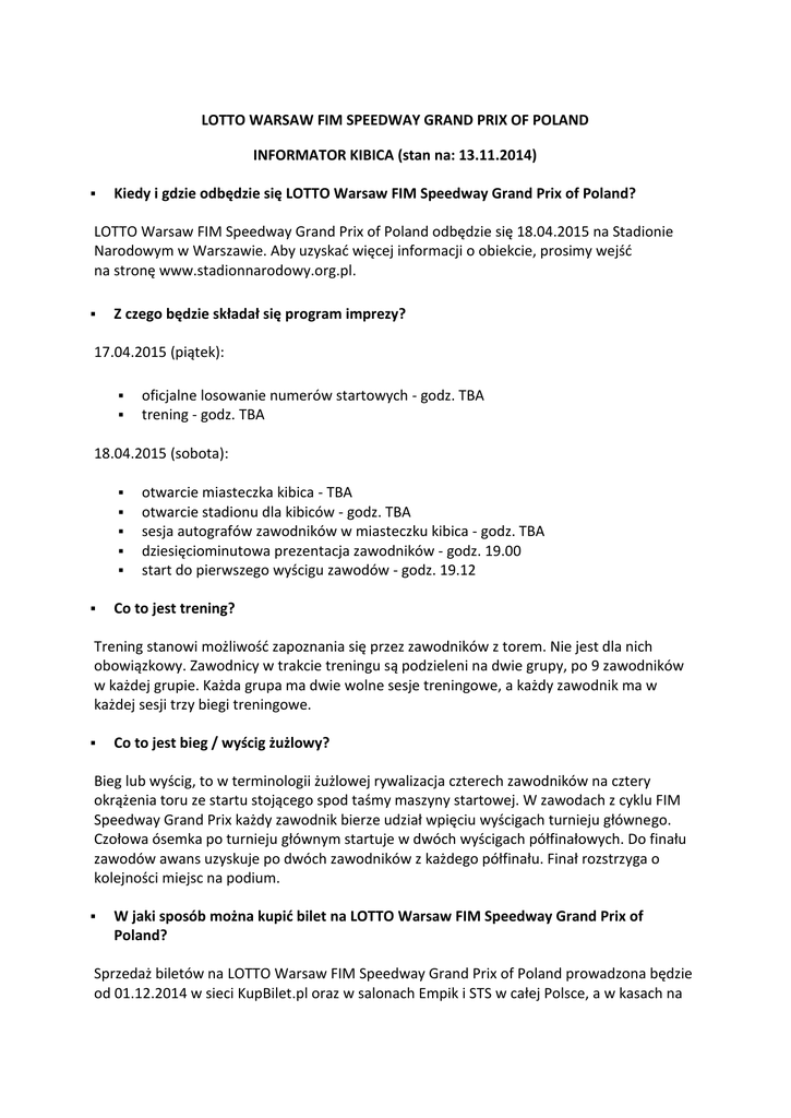 LOTTO WARSAW FIM SPEEDWAY GRAND PRIX OF POLAND INFORMATOR KIBICA (stan na: 13.11.2014) Kiedy i gdzie odbędzie się LOTTO Warsaw FIM Speedway Grand Prix of Poland? LOTTO Warsaw FIM Speedway Grand Prix of Poland odbędzie się 18.04.2015 na Stadionie Narodowym w Warszawie. Aby uzyskać więcej informacji o obiekcie, prosimy wejść na stronę www.stadionnarodowy.org.pl. Z czego będzie składał się program imprezy? 17.04.2015 (piątek): oficjalne losowanie numerów startowych - godz. TBA trening - godz. TBA 18.04.2015 (sobota): otwarcie miasteczka kibica - TBA otwarcie stadionu dla kibiców - godz. TBA sesja autografów zawodników w miasteczku kibica - godz. TBA dziesięciominutowa prezentacja zawodników - godz. 19.00 start do pierwszego wyścigu zawodów - godz. 19.12 Co to jest trening? Trening stanowi możliwość zapoznania się przez zawodników z torem. Nie jest dla nich obowiązkowy. Zawodnicy w trakcie treningu są podzieleni na dwie grupy, po 9 zawodników w każdej grupie. Każda grupa ma dwie wolne sesje treningowe, a każdy zawodnik ma w każdej sesji trzy biegi treningowe. Co to jest bieg / wyścig żużlowy? Bieg lub wyścig, to w terminologii żużlowej rywalizacja czterech zawodników na cztery okrążenia toru ze startu stojącego spod taśmy maszyny startowej. W zawodach z cyklu FIM Speedway Grand Prix każdy zawodnik bierze udział wpięciu wyścigach turnieju głównego. Czołowa ósemka po turnieju głównym startuje w dwóch wyścigach półfinałowych. Do finału zawodów awans uzyskuje po dwóch zawodników z każdego półfinału. Finał rozstrzyga o kolejności miejsc na podium. W jaki sposób można kupić bilet na LOTTO Warsaw FIM Speedway Grand Prix of Poland? Sprzedaż biletów na LOTTO Warsaw FIM Speedway Grand Prix of Poland prowadzona będzie od 01.12.2014 w sieci KupBilet.pl oraz w salonach Empik i STS w całej Polsce, a w kasach na Stadionie Narodowym w dniu zawodów. Ponadto podczas Zimowego Narodowego na Stadionie. Ile kosztują bilety na LOTTO Warsaw FIM Speedway Grand Prix of Poland? 49 PLN KAT. I – KAT. II – 59 PLN KAT. III – 69 PLN KAT. IV - 79 PLN KAT. V – 79 PLN KAT. VI – 89 PLN KAT. VII – 99 PLN VIP – 850 PLN Na bilet VIP składa się: miejsce siedzące, catering, open bar, program, drobny upominek od organizatora. Menu zamieścimy w terminie późniejszym. BILETY DO NABYCIA JUŻ OD 1 GRUDNIA 2014 NA: KUPBILET.PL PONADTO BILETY DO NABYCIA: EMPIK, STS, ZIMOWY NARODOWY, KASY W DNIU ZAWODÓW SZCZEGÓŁY: SGPNARODOWY.PL Ile kosztuje i czym jest program zawodów LOTTO Warsaw FIM Speedway Grand Prix of Poland? Jest to publikacja zawierająca podstawowe informacje na temat zawodów i ich uczestników z tabelą wyścigów wraz z możliwością jej uzupełniania. Program ma wartość kolekcjonerską, stanowi też zbiór informacji statystycznych. Program zawodów kosztuje 15 zł (do nabycia od 16.04.2015 w kasach na terenie SN). Jak dojechać na Stadion Narodowy? Komunikacja miejska przed imprezą: Przystanek PKP Warszawa Stadion linie SKM S1, S2 Przystanek Al. Zieleniecka linie tramwajowe: 3, 7, 8, 22 linie autobusowe: 123,125, 135, 138, 146, 147, 166, 226, 509, 517 Przystanek Rondo Waszyngtona linie tramwajowe: 7, 8, 9, 22, 24, 25 linie autobusowe: 102, 111, 117, 123, 138, 146, 147, 158, 166, 507, 509, 517, 521 Komunikacja miejska po imprezie: Przystanek PKP Warszawa Stadion linie SKM S1, S2 Ostatnie pociągi z dworca Stadion odjeżdżać będą w kierunku wschodnim o godzinie 23.38, a w kierunku zachodnim o godzinie 23.51. Przystanek Al. Zieleniecka linie tramwajowe: 3, 7, 8, 22 kursujące na trasach objazdowych tylko po Pradze linie autobusowe: 123,125, 135, 138, 146, 147, 166, 226, 509, 517, N02, N03, N21, N71 Przystanek Rondo Waszyngtona linie tramwajowe: 7, 8, 9, 22, 24, 25 linie autobusowe: 123, 138, 146, 147, 509, 517, N02 Czy na miejscu dostępny będzie parking dla publiczności? Na terenie błoni Stadionu Narodowego będzie funkcjonował płatny parking dla publiczności (wjazd od ul. Sokolej, ul. Zamoyskiego lub ul Targowej). Jego pojemność jest jednak ograniczona, dlatego warto wziąć to pod uwagę planując przybycie na LOTTO Warsaw FIM Speedway Grand Prix of Poland. Organizator nie jest w stanie zapewnić wystarczającej ilości miejsc parkingowych wszystkim zainteresowanym. Polecamy skorzystać ze środków komunikacji publicznej. Ceny biletów parkingowych: 20 PLN - samochód osobowy 40 PLN – bus 80 PLN – autokar Bilety sprzedawane przy wjeździe na parking (o ile nie zostaną wyprzedane w przedsprzedaży internetowej, rezerwacje biletów na parking: sklep.stadionnarodowy.org.pl/rezerwacja/termin-dzien.html?idg=44&d=3&data=2014-10-11 Rekomendujemy dojazd komunikacją miejską. Którzy zawodnicy wystąpią podczas LOTTO Warsaw FIM Speedway Grand Prix of Poland? Wszystkie szczegóły dotycząc programu wydarzenia na bieżąco będą publikowane na oficjalnej stronie internetowej www.sgpnarodowy.pl. Oficjalna strona cyklu FIM Speedway Grand Prix www.speedwaygp.com zawiera wszystkie informacje o uczestnikach. Czy po zawodach będzie wiadomo, który zawodnik został Indywidualnym Mistrzem Świata na żużlu w sezonie 2015? Nie. LOTTO Warsaw FIM Speedway Grand Prix of Poland to pierwszy turniej z cyklu FIM Speedway Grand Prix w sezonie 2015. Zawodnicy zbierają punkty przez cały sezon do klasyfikacji generalnej. Szczegóły dotyczące klasyfikacji i uczestników na www.speedwaygp.com. Czy na zawody LOTTO Warsaw FIM Speedway Grand Prix of Poland można będzie wnieść aparat fotograficzny? Na teren imprezy nie będzie można wnosić, bez uprzedniego uzyskania akredytacji prasowej, profesjonalnego sprzętu fotograficznego i wideo. Osoby które będą starały się wnieść na teren imprezy aparat fotograficzny z wymiennym zestawem optycznym lub kamerę wideo, będą musiały liczyć się z koniecznością przekazania go w depozyt, którego koszt wynosi 50 PLN. Koszt depozytu nie podlega zwrotowi. Czy na zawodach LOTTO