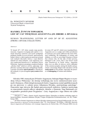A r t y k u ł y „Śląskie Studia Historyczno-Teologiczne” 47,2 (2014), s. 235-255 Ks. WINCENTY MYSZOR Uniwersytet Śląski w Katowicach Wydział Teologiczny Handel żywym towarem. List 10* i 24* świętego Augustyna (ze zbioru J. Divjaka) Human trafficking. Letter 10* and 24* of St. Augustine (from J. Divjak collection) Abstract W listach 10* i 24*, które zostały tutaj przetłumaczone, Augustyn występuje jako sędzia i w ramach instytucji audientia episcopalis podejmuje problemy handlu żywym towarem, uprowadzania kobiet i dzieci, a także społeczno-prawnej sytuacji tych wolnych obywateli, którzy z racji ubóstwa należeli do stanu kolonów, czyli najniższej warstwy społecznej (humiliores) w łacińskiej Afryce Północnej. Augustyn przejmuje urzędową funkcję „obrońcy ludu” (defensor plebis), zgłaszając wątpliwości i pytania dotyczące nielegalnego handlu, a przede wszystkim uprowadzania w niewolę ludzi wolnych, w tym szczególnie porywania kobiet i dzieci. In Letter 10* and 24*, which were translated here, Augustine acts as a judge and within jurisdiction of audientia episcopalis addresses the issue of human trafficking, the kidnapping of women and children, as well as socio-legal situation of those free citizens who, for the sake of their poverty, belonged to the coloni, that is the lowest social class (humiliores) in North Africa. Augustine takes over an office of defensor plebis (defender of the common people), raising the doubts and questions concerning illegal trade and above all the enslavement of free people, especially the practice of kidnapping of women and children. Od roku 1981 znanych jest 29 listów Augustyna, biskupa Hippo Regius w rzymskiej Afryce Północnej i do dzisiaj wzbudzają one żywe zainteresowanie uczonych i tłumaczy. Zbiór dotąd nieznanych listów Augustyna został opublikowanych po raz pierwszy w całości przez Johannesa Divjaka, austriackiego patrologa 1. Znaczenie tego okrycia dla badań patrystycznych niektórzy badacze porównują ze znaczeniem innych odkryć rękopisów, tekstów z Qumran, Nag Hammadi czy oryginałów greckich pism Orygenesa 2. Listy Augustyna z tego zbioru nie tylko (Divjak J. e., 1981) = Sancti Aureli Augustini Opera. Epistolae ex duobus codicibus nuper in lucem prolatae, recensuit Johannes Divjak, Corpus Scriptorum Ecclesiasticorum, vol. 88, Vindobonae 1981. W Polsce listami Augustyna ze zbioru Divjaka zainteresował się Jacek Pudliszewski: Do diakona Faustyna w sprawie zwrotu pieniędzy [Ep. 7*], „Vox Patrum” 19 (1990), s. 900-902; Epistola Sancti Augustini ad Fabiolam. List świętego Augustyna do Fabioli [Ep. 20*], Poznań 2002; List do 236 Ks. WINCENTY MYSZOR powiększają zasób korespondencji biskupa Hippony, ale także dokumentują nieznane dotąd formy aktywności św. Augustyna. W odkrytych listach nie znajdziemy nowych idei teologicznych, których nie ma w innych jego pismach. W listach przeważa tematyka społeczna, której Augustyn poświęcał mniej uwagi w dziełach teologicznych i filozoficznych. W zbiorze tym znalazły się dwa listy biskupa Hippony (Ep. 10* i Ep. 24*), które ze względu na treść i wypowiedzi ich autora zasługują na szczególną uwagę. Dokumentują działania Augustyna jako sędziego, który występował w procesach sądowych w ramach instytucji audientia episcopalis 3. Jako sędzia Augustyn zajmował się zarówno sporami odnoszącymi się do spraw własności, problemów rodzinnych, jak i do spraw karnych. Dokumentują to przede wszystkim jego listy i mowy. W listach 10* i 24*, które nas interesują, Augustyn – sędzia – odniósł się do problemu handlu żywym towarem. Porwania wolnych obywateli i ich sprzedaż na rynku handlu niewolnikami ujawniały najciemniejszą stronę antycznego świata epoki schyłkowej Cesarstwa. Sprawy sądowe, jak ilustrują to listy, odnosiły się najczęściej do ludzi o niższym lub średnim statusie społecznym. Do niższych warstw społecznych należeli niewolnicy i pracownicy rolni, koloni. W listach 10* i 24*, których polskie tłumaczenie przedstawiamy po tym wprowadzeniu, Augustyn zajął się problemem handlu ludźmi, uprowadzaniem kobiet i dzieci, a także społeczno-prawnym zagadnieniem pracowników, wprawdzie wolnych jako obywateli, ale z racji ubóstwa należących do najniższej warstwy ludzi i dodatkowo zniewolonych przez pracę w latyfundiach łacińskiej Afryki Północnej, czyli kolonów. Korespondencja to swoisty rodzaj aktywności literackiej Augustyna. Ze względu na okoliczności powstania jego teksty epistolarne mogą sprawiać dzisiaj pewne problemy w ich zrozumieniu. Augustyn w typowy dla korespondencji sposób odwoływał się do spraw najczęściej znanych adresatowi. Z tej racji wypowiadał się skrótowo. Listy w sprawach sądowych sprawiają także dodatkową trudność w tłumaczeniu na język polski 4. Trudności te wynikają nie tylko z racji terminologii prawniczej, znawca prawa rzymskiego późnej epoki Cesarstwa w miarę szybko może się z nimi uporać. Augustyn poruszał społeczne kwestie swojej epoki, nawiązywał do wydarzeń i dokumentów, aktów prawnych, które w tej epoce były znane czytelnikom. Ze względu na ówczesne okoliczności redagowania i przesyłania listów świadomie opuszczał niektóre sprawy; między innymi nie wymieniał z imienia urzędników publicznych, ludzi odpowiedzialnych za nieprawidłowe rozwiązania, uwikłanych w korupcję czy wprost w przestępcze działania. Trzeba Bonifaciusza [Ep. 17*], „Vox Patrum” 40/41 (2001), s. 515-517; Augustyńskie napomnienie Wiktora (Augustinus, Ep. 8*, coll J. Divjak), „Vox Patrum” 32 (2012), s. 923-927. Zagadnieniu audientia episcopalis w pracy duszpasterskiej Augustyna poświęciłem osobny artykuł w zbiorze prac opublikowanych w Studia Antiquitatis Christianae. Series Nova 15, Katowice 2014 [w dodatku źródłowym polskie tłum. Ep. 1*; 9*; 10*, 2-9; 24*]. Istnieją obecnie dwa tłumaczenia współczesne całoś
