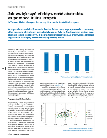 naukowiec w sieci Jak zwiększyć efektywność abstraktu za pomocą kilku kropek dr Tomasz Piekot, Grzegorz Zarzeczny, Pracownia Prostej Polszczyzny W poprzednim odcinku Pracownia Prostej Polszczyzny zaproponowała trzy zasady, które zapewnią abstraktowi moc oddziaływania. Były to: 1) odpowiedni poziom przystępności języka (readability), 2) dobra strukturyzacja treści, 3) przemyślana strategia kognitywna. Dzisiejszy odcinek rozwija pierwszą z nich. 30 | Najkrócej: efektywny abstrakt to mikroartykuł, a właściwie – miniraport. Efektywny abstrakt nie jest tekstem o tekście (artykule), lecz tekstem o badaniach. Efektywny abstrakt nie poprzestaje na celach badań – opisuje też ich wyniki. Jego głównym zadaniem jest dostarczyć czytelnikowi „bez zbędnej zwłoki” kompletnych informacji o badaniach – od metodologii aż po wnioski. Najbardziej liczy się tu czas przetwarzania informacji, ponieważ, szukając literatury przedmiotu, mamy dostęp do (zbyt) wielu wypełnionych po brzegi repozytoriów. Kiedy współcześnie szukamy lektur, zwykle znajdujemy od kilkunastu do kilkudziesięciu tekstów o podobnej tematyce. Od nadmiaru głowa nie boli, bo z nadmiarem radzimy sobie, filtrując dane i wyławiając z baz naukowych najprzydatniejsze publikacje. Najprzydatniejsze, czyli sprawiające w lekturze najmniej kłopotu? Wykres 1. FOG-PL pięciu korpusów tekstów naukowych (opracowanie: dr Marek Maziarz, Logios Re-search) scyplin: prawa, ekonomii, lingwistyki, socjologii i architektury. [wykres 1] Jak widać, przystępność języka naukowego zależy od dyscypliny, a najbardziej zapewne od bogactwa i stopnia komplikacji jej terminologii. Ważne mogą być także społeczne praktyki konstruowania tekstów, a zwłaszcza zwyczaj rozwlekania stylu. Składniki indeksu FOG (długie zdanie i długie wyrazy) podpowiadają bowiem, że trudność tekstu naukowego mogą wywołać albo liczne długie wyrazy, albo zbyt długie zdania. W pierwszym przypadku mówilibyśmy o dyscyplinach przesyconych skomplikowaną Przystępność polskich artykułów Przypomnijmy – miarą przystępności języka jest indeks mglistości FOG (pisaliśmy o nim szerzej w Przeglądzie Uniwersyteckim 4/2013). W tym ujęciu w procesie przetwarzania informacji bardzo ważna jest długość zdań i długość wyrazów. Indeks FOG uwzględnia oba czynniki i mierzy edukacyjną trudność wypowiedzi (w latach edukacji). Wróćmy teraz do abstraktów. Ich przystępność z pewnością zależy od przystępności tekstów streszczanych artykułów. Sprawdźmy najpierw zatem, jak przestawia się mglistość polskich tekstów naukowych z pięciu dy4 | 2014 Przegląd Uniwersytecki Wykres 2. Mapa przystępności tekstów (opracowanie: dr Marek Maziarz, Logios Research) naukowiec w sieci terminologią, w drugim – o dyscyplinach, w których efekt naukowości uzyskuje się rozbudowaną konstrukcją zdań. Obie cechy, tzn. długie wyrazy i długie zdania, można zestawić w formie mapy przystępności (poszczególne punkty oznaczają badane teksty). [wykres 2] Jak widać, w niektórych tekstach naukowych poziom trudnego słownictwa spada poniżej poziomu z codziennej prasy (15%), a zdania osiągają długość 48 wyrazów. Co jednak ciekawe, typowy tekst naukowy zbliża się do proporcji 20/20, czyli zawiera 20% słów długich i średnio 20 wyrazów w zdaniu. Wykres 3. Przystępność abstraktów (według wskaźnika FOG-PL) Poważny problem – kondensacja abstraktu W tym miejscu pojawiają się pierwsze kłopoty. Badania od dawna pokazują bowiem, że najczęściej abstrakty są trudniejsze od streszczanych artykułów (Dronberger i Kowitz 1975, King 1976). Dzieje się tak prawdopodobnie z powodu silnej kondensacji treści. Autorzy – tworząc abstrakty – wybierają po prostu najważniejsze słowa kluczowe (czyli trudne terminy) i umieszczają je w rozbudowanych zdaniach. Kondensacja abstraktu jest więc zjawiskiem niepożądanym z punktu widzenia jego efektywności (wirusowości). Zjawisko kondensacji potwierdziły też badania prowadzone na gruncie polszczyzny. Okazało się, że abstrakty polskich raportów ewaluacyjnych są trudniejsze od empirycznych analiz (Maziarz i in. 2011). Oznacza to, że pisząc abstrakt, powinniśmy koncentrować się głównie na skracaniu zdań (unikanie terminologii jest raczej niewskazane ze względu na strukturę tematyczną tekstu) i pilnowaniu, by wskaźnik FOG nie przekroczył 15 punktów. Więcej kropek! W polskim kontekście interesujące byłoby sprawdzenie, czy przystępność abstraktów z polskich czasopism naukowych zmniejsza się w związku z reformą nauki. Zmiana taka oznaczałaby, że polscy autorzy dostosowują się już do nowej sytuacji technologicznej i przygotowują abstrakty z pełną świadomością ich roli w upo- | 31 Wykres 4. Przystępność abstraktów (według wskaźnika FOG-PL) wszechnianiu wyników badań naukowych przez internet. Aby odpowiedzieć na to pytanie, poddaliśmy analizie abstrakty z trzech uznanych polskich czasopism. Dwa z nich to pisma socjologiczne („Studia Socjologiczne”, „Przegląd Socjologii Jakościowej”), trzecie zaś to „Studia Medioznawcze”. Każde z tych pism w parametryzacji uzyskało powyżej 7 punktów. Abstrakty z tych czasopism porównamy w dwóch grupach obejmujących numery z dwóch okresów: sprzed reformy (do 2010) i po reformie (2012– 2013). Poniżej przestawiamy nasze obserwacje. 1. Średnia przystępność języka abstraktów zmniejsza się nieznacznie, a proces ten spowalnia po reformie (po 2010). [wykres 3] 2. Nie obejmuje ona jednak wszystkich czasopism w tym samym stopniu. [wykres 4] 3. Powyższy wykres pokazuje też, że abstrakty medioznawcze są przystępniejsze od tekstów socjologicznych. 4. W ostatnich latach nieznacznie wzrasta długość abstraktów (średnio o 10 słów), które osiągają już najczęściej 100 słów. Niestety, długość ta jest ciągle niezgodna ze światowymi zaleceniami