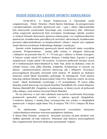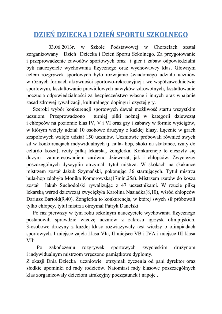 DZIEŃ DZIECKA I DZIEŃ SPORTU SZKOLNEGO 03.06.2013r. w Szkole Podstawowej w Chorzelach został zorganizowany Dzień Dziecka i Dzień Sportu Szkolnego. Za przygotowanie i przeprowadzenie zawodów sportowych oraz i gier i zabaw odpowiedzialni byli nauczyciele wychowania fizycznego oraz wychowawcy klas. Głównym celem rozgrywek sportowych było rozwijanie świadomego udziału uczniów w różnych formach aktywności sportowo-rekreacyjnej i we współzawodnictwie sportowym, kształtowanie prawidłowych nawyków zdrowotnych, kształtowanie poczucia odpowiedzialności za bezpieczeństwo własne i innych oraz wpajanie zasad zdrowej rywalizacji, kulturalnego dopingu i czystej gry. Szeroki wybór konkurencji sportowych dawał możliwość startu wszystkim uczniom. Przeprowadzono turniej piłki nożnej w kategorii dziewcząt i chłopców na poziomie klas IV, V i VI oraz gry i zabawy w formie wyścigów, w którym wzięły udział 10 osobowe drużyny z każdej klasy. Łącznie w grach zespołowych wzięło udział 150 uczniów. Uczniowie próbowali również swych sił w konkurencjach indywidualnych tj. hula- hop, skoki na skakance, rzuty do celu(do kosza), rzuty piłką lekarską, żonglerka. Konkurencje te cieszyły się dużym zainteresowaniem zarówno dziewcząt, jak i chłopców. Zwycięzcy poszczególnych dyscyplin otrzymali tytuł mistrza. W skokach na skakance mistrzem został Jakub Szymański, pokonując 36 startujących. Tytuł mistrza hula-hop zdobyła Monika Komorowska(17min.25s). Mistrzem rzutów do kosza został Jakub Suchodolski rywalizując z 47 uczestnikami. W rzucie piłką lekarską wśród dziewcząt zwyciężyła Karolina Nasiadka(8,10), wśród chłopców Dariusz Bartold(9,40). Żonglerka to konkurencja, w której swych sił próbowali tylko chłopcy, tytuł mistrza otrzymał Patryk Danelski. Po raz pierwszy w tym roku szkolnym nauczyciele wychowania fizycznego postanowili sprawdzić wiedzę uczniów z zakresu igrzysk olimpijskich. 3-osobowe drużyny z każdej klasy rozwiązywały test wiedzy o olimpiadach sportowych. I miejsce zajęła klasa VIa, II miejsce VB i IVA i miejsce III klasa VIb Po zakończeniu rozgrywek sportowych zwycięskim drużynom i indywidualnym mistrzom wręczono pamiątkowe dyplomy. Z okazji Dnia Dziecka uczniowie otrzymali życzenia od pani dyrektor oraz słodkie upominki od rady rodziców. Natomiast rady klasowe poszczególnych klas zorganizowały dzieciom atrakcyjny poczęstunek i napoje .
