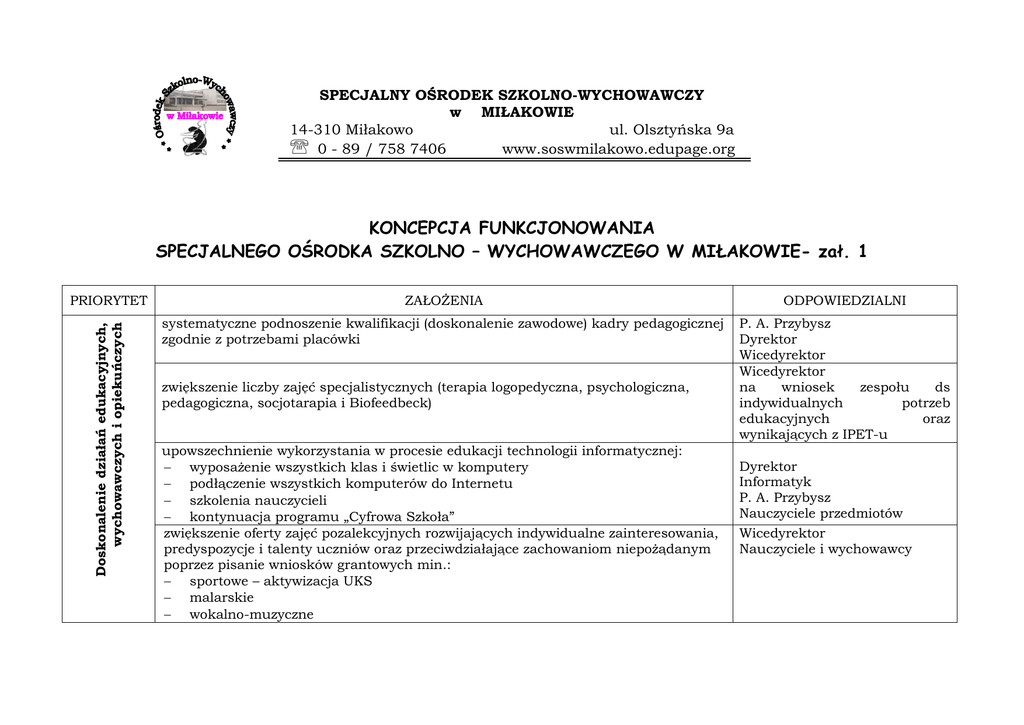 SPECJALNY OŚRODEK SZKOLNO-WYCHOWAWCZY w MIŁAKOWIE 14-310 Miłakowo ul. Olsztyńska 9a 0 - 89 / 758 7406 www.soswmilakowo.edupage.org KONCEPCJA FUNKCJONOWANIA SPECJALNEGO OŚRODKA SZKOLNO – WYCHOWAWCZEGO W MIŁAKOWIE- zał. 1 Doskonalenie działań edukacyjnych, wychowawczych i opiekuńczych PRIORYTET ZAŁOŻENIA ODPOWIEDZIALNI systematyczne podnoszenie kwalifikacji (doskonalenie zawodowe) kadry pedagogicznej zgodnie z potrzebami placówki P. A. Przybysz Dyrektor Wicedyrektor Wicedyrektor na wniosek zespołu ds indywidualnych potrzeb edukacyjnych oraz wynikających z IPET-u zwiększenie liczby zajęć specjalistycznych (terapia logopedyczna, psychologiczna, pedagogiczna, socjotarapia i Biofeedbeck) upowszechnienie wykorzystania w procesie edukacji technologii informatycznej: wyposażenie wszystkich klas i świetlic w komputery podłączenie wszystkich komputerów do Internetu szkolenia nauczycieli kontynuacja programu „Cyfrowa Szkoła” zwiększenie oferty zajęć pozalekcyjnych rozwijających indywidualne zainteresowania, predyspozycje i talenty uczniów oraz przeciwdziałające zachowaniom niepożądanym poprzez pisanie wniosków grantowych min.: sportowe – aktywizacja UKS malarskie wokalno-muzyczne Dyrektor Informatyk P. A. Przybysz Nauczyciele przedmiotów Wicedyrektor Nauczyciele i wychowawcy garncarskie rozwijające przedsiębiorczość informatyczne teatralne czytelnicze inne podniesienie poziomu kształcenia zawodowego uczniów: systematyczne doposażenie pracowni technicznych w narzędzia i materiały do pracy poszerzanie oferty edukacyjnej o nowe profile zgodnie z zainteresowaniami i możliwościami uczniów oraz potrzebami rynku pracy, rozwijanie współpracy z pracodawcami w celu odbywania praktyk w naturalnych warunkach i umożliwienia ewentualnego zdobycia pracy stosowanie indywidualnych form kształcenia – udział w zajęciach przedsiębiorczości, dyżury w kuchni, pomoc w pracach porządkowych i konserwatorskich na terenie placówki kontynuowanie działań z zakresu ekologii oraz promocji zdrowia, a także bezpieczeństwa wdrażanie nowych metod i form pracy umożliwiających osiąganie lepszych wyników w nauczaniu dzieci niepełnosprawnych intelektualnie, podnoszenie jakości pracy szkoły kontynuowanie dotychczasowych działań oraz podejmowanie nowych inicjatyw w zakresie kształtowania właściwych postaw sprzyjających integracji osób niepełnosprawnych ze społeczeństwem (programy profilaktyczne, współpraca z Policją, Strażą Pożarną – utworzenie młodzieżowej drużyny, warsztaty socjoterapeutyczne, imprezy integracyjne) rozwijanie działalności sportowej umożliwiające osiąganie wysokich wyników sportowych w dyscyplinach: warcaby 64 polowe, piłka siatkowa plażowa, tenis ziemny, piłka nożna, KONCEPCJA FUNKCJONOWANIA SPECJALNEGO OŚRODKA SZKOLNO – WYCHOWAWCZEGO W MIŁAKOWIE- zał. 1 Dyrektor Wicedyrektor Doradca zawodowy Nauczyciele i wychowawcy Doradca zawodowy Wicedyrektor Kierownik d/s opieki i wych. Nauczyciele i wychowawcy Nauczyciele i wychowawcy Nauczyciele i wychowawcy Nauczyciele i wychowawcy przy wsparciu zespołu kierowniczego Nauczyciele uczący w-f wychowawcy Utrwalanie pozytywnego wizerunku Ośrodka w środowisku, budowanie sprzyjającego uczniom, nauczycielom i rodzicom klimatu w Ośrodku sporty zimowe, unihokej (doposażenie bazy sportowej, zakup strojów dla reprezentacji Ośrodka, unowocześnienie otwartych obiektów sportowych – modernizacja boisk) propagowanie wśród uczniów i nauczycieli aktywnego wypoczynku (organizacja rajdów, biwaków, wycieczek krajoznawczych, turnusów rehabilitacyjnych) umożliwienie uczniom ze SPdP oraz OET korzystania z zajęć hipoterapii dalsza profesjonalizacja działań terapeutycznych poprzez wprowadzanie nowych metod pracy i poszerzenie zakresu usług Kierownik d/s opieki i wych. Nauczyciele i wychowawcy Specjaliści (psycholog, pedagog, logopeda, socjotarapeuta) kontynuowanie dobrej współpracy z firmami wspierającymi ośrodek i organizację imprez dla dzieci niepełnosprawnych. Przyznawanie statuetki przyjaciel Ośrodka Dyrektor Nauczyciele i wychowawcy podejmowanie działań służących większej integracji grona pedagogicznego, pracowników administracji i obsługi, rodziców (organizacja spotkań okolicznościowych, bali z okazji Dnia Edukacji Narodowej, bali charytatywnych, wycieczek, wyjazdów do teatru, Dni Otwartych Ośrodka itp.) szersze eksponowanie prac uczniów na terenie Ośrodka i poza nim Dyrektor Wicedyrektor Kierownik d/s opieki i wych. tworzenie przyjaznej, partnerskiej atmosfery w Ośrodku zwiększenie udziału rodziców w życiu Ośrodka (pomoc w organizowaniu imprez i uroczystości, opieka w czasie wycieczek szkolnych, wydawanie informatora dla rodziców zawierającego aktualne informacje o placówce oraz porady prawne, organizowanie dla rodziców warsztatów pedagogicznych) organizowanie imprez sportowych, rekreacyjnych, artystycznych na rzecz środowiska osób niepełnosprawnych w tym również o charakterze integracyjnym : Festyn z okazji Dnia Dziecka Otrzęsiny Plenery malarskie Festiwal sportowy – Dzień sportu szkolnego Eliminacje do Mistrzostw Polski w Warcabach, Mistrzostwa Polski Międzynarodowy Turniej Warcabowy KONCEPCJA FUNKCJONOWANIA SPECJALNEGO OŚRODKA SZKOLNO – WYCHOWAWCZEGO W MIŁAKOWIE- zał. 1 Nauczyciele przedm. artyst. Nauczyciele i wychowawcy Wszyscy pracownicy Psycholog, pedagog Nauczyciele i wychowawcy Samorządy uczniowskie z opiekunami Nauczyciele i wychowawcy Rozbudowa i modernizacja placówki Przegląd Twórczości Artystycznej – Baśnioterapia i inne promowanie osiągnięć uczniów, nauczycieli w lokalnych mediach, folderach okolicznościowych, w Internecie – opracowanie profesjonalnej strony rozszerzenie działań wolontariatu – wspomaganie w realizacji zadań statutowych rozwijanie dotychczasowych działań integracyjnych ze środowiskiem lokalnym (współpraca ze szkołami podstawowymi, przedszkolami - w ramach 