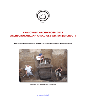 PRACOWNIA ARCHEOLOGICZNA I ARCHEOBOTANICZNA ARKADIUSZ WIKTOR (ARCHBOT) Należymy do Ogólnopolskiego Stowarzyszenia Prywatnych Firm Archeologicznych XVII‐wieczna studnia (fot. A. Wiktor) www.archbot.pl Pracownia Archeologiczna i Archeobotaniczna Arkadiusz Wiktor (nazwa skrócona ARCHBOT) jest nowo powstałą firmą badawczą zajmującą się interdyscyplinarną działalnością w dziedzinie ochrony zabytków. W chwili obecnej trzema głównymi profilami działalności naszej firmy są: archeologia, archeobotanika oraz fotografia lotnicza/wysokościowa. Działalność prowadzimy od czerwca 2009 roku jednakże trzon ekipy naukowej stanowią badacze z wieloletnim doświadczeniem zawodowym zdobytym w trakcie badań prowadzonych zarówno w Polsce jak i za granicą. Wykonujemy nadzory archeologiczne, archeologiczne badania rozpoznawcze (powierzchniowe lub sondażowe) oraz archeologiczne badania wykopaliskowe w tym: stacjonarne badania systematyczne, wyprzedzające badania ratownicze i badania interwencyjne. Nasza działalności obejmuje zarówno zabytkowe układy urbanistyczne jak i tereny wiejskie. Zajmujemy się również opracowaniem wyników takich badań, wykonując badania specjalistyczne m.in. analizy archeobotaniczne makroszczątków roślinnych zrejestrowanych w próbkach glebowych (jako jedyna firma prywatna na rynku!) oraz analizy pozyskanego materiału zabytkowego. Ponadto wykonujemy profesjonalne zdjęcia lotnicze/wysokościowe m.in. badanych obszarów, z wysokości do 100 m. Grot włóczni (fot. A. Wiktor) Prowadzimy prace archeologiczne na zlecenie osób fizycznych, podmiotów gospodarczych, instytucji państwowych oraz samorządów, na stanowiskach archeologicznych zagrożonych zniszczeniem na skutek robót budowlanych i ziemnych. Zagrożenia takie mogą wystąpić przy budowie: domów i osiedli mieszkaniowych, dróg, różnorodnych inwestycji liniowych jak gazo‐ i rurociągi, kanalizacje, melioracje czy sieci telekomunikacyjne. Są one także częste przy eksploatacji piasku i żwiru, przy wykonywaniu nasadzeń leśnych. Ponadto badania takie prowadzimy także na stanowiskach niszczonych w wyniku prac rolnych i procesów erozyjnych. 2 Załatwiamy wszelkie formalności związane z przeprowadzeniem badań archeologicznych, zaczynając od uzyskania pozwolenia na badania, poprzez wykonanie kwerend źródłowych, prac geodezyjnych, prace ziemnych, badań archeologicznych, sprawozdań i opracowań z wykonanych badań archeologicznych aż do formalno – prawnego przekazania inwestorowi przebadanego terenu. Zapewniamy szybkie i merytoryczne przeprowadzenie badań i ścisłe dostosowanie się do terminarza prac budowlanych. Jeśli jesteś inwestorem i planujesz jakąkolwiek budowę a Twoja inwestycja koliduje z zabytkiem archeologicznym lub istnieje prawdopodobieństwo, że w jej zasięgu będzie występował taki zabytek to nasza oferta jest skierowana między innymi do Ciebie! Więcej informacji na temat badań archeologicznych wyprzedzających inwestycję znajdziesz w Poradniku inwestora w zakładce Pliki do pobrania na naszej stronie www.archbot.pl. INWESTORZE PAMIĘTAJ. Badania archeologiczne nie muszą być jedynie przykrym obowiązkiem, który należy wypełnić, aby rozpocząć planowaną inwestycję. Ochrona dziedzictwa kulturowego może być także doskonałą reklamą Twojej działalności! Jeśli będziesz sobie tego życzył to dołożymy wszelkich starań, aby w każdym archeologicznym sprawozdaniu i opracowaniu, w każdej publikacji i notce prasowej, na każdej prezentacji multimedialnej czy wystawie, (które będą dotyczyć badań sponsorowanych przez Ciebie) widniało Twoje logo, nazwa oraz krótka charakterystyka działalności! Ponadto na stałe zagościsz w naszej zakładce „Współpraca” wraz z linkiem odsyłającym do Twojej strony! Jeśli jesteś firmą lub instytucją związana bezpośrednio z archeologią i poszukujesz podwykonawcy do przeprowadzenia badań archeologicznych, chciałbyś przeprowadzić specjalistyczne analizy archeobotaniczne lub pozyskanego materiału zabytkowego czy też potrzebujesz profesjonalnych zdjęć lotniczych/wysokościowych badanego obszaru – także zgłoś się do nas! Przęślik gliniany (fot. A. Wiktor) 3 Dział Archeologii: Kierownik Działu Archeologii: mgr Arkadiusz Wiktor tel. 604 944 389 email: [email protected] [email protected] Studia magisterskie z zakresu archeologii, o specjalizacji archeologia architektury, ukończył na Uniwersytecie Mikołaja Kopernika w Toruniu, w roku 2002. Uczestniczył w badaniach powierzchniowych, sondażowych, ratowniczych i stacjonarnych oraz nadzorach archeologicznych zarówno w kraju jak i za granicą. Stanowiska, na których pracował zlokalizowane były zarówno na terenach zabytkowych miast (Gdańsk, Sanok) jaki na terenach ruralistycznych. W kraju współpracował m.in. z Muzeum Okręgowym w Koninie, z Poznańskim Towarzystwem Prehistorycznym, z Muzeum Archeologicznym w Gdańsku, ze Stowarzyszeniem Promocji Zabytków Archeologicznych w Gdańsku, Fundacją Patrimonium z Poznania czy Archeologiczną Pracownią Badawczą THOR z Gniezna. Za granicą natomiast z licznymi firmami irlandzkimi takimi jak Archaeological Development Services, Headland Archaeology czy Irish Archaeology Consultancy. W sumie spędził w terenie ponad 7 lat pełniąc wielokrotnie funkcję kierownika badań. Od maja 2010 roku członek Ogólnopolskiego Stowarzyszenia Prywatnych Firm Archeologicznych (OSPFA). Współzałożyciel Kujawsko‐ Pomorskiego Oddziału Stowarzyszenia Naukowego Archeologów Polskich (SNAP), działającego od czerwca 2010 roku, w którym pełni funkcję sekretarza. Prowadzenie prac archeologicznych – odsłanianie fragmentu XV‐wiecznej chaty (fot. A. Wiktor) 4 Czym jest archeologia? Archeologia /z greckiego: archaios ‐ dawny, logos ‐ mowa, opowieść/ ‐ to słowo oznaczające mówienie, dociekanie na temat przeszłości, na temat spraw dawnych. Większość definicji określa 