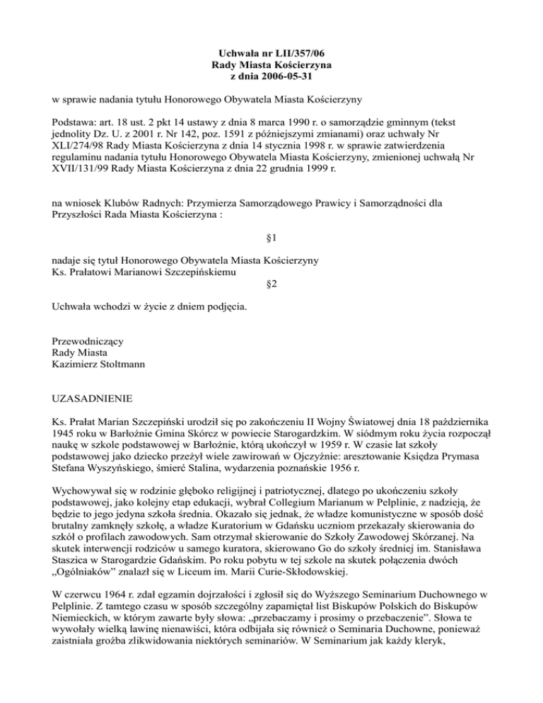 Uchwała nr LII/357/06 Rady Miasta Kościerzyna z dnia 2006-05-31 w sprawie nadania tytułu Honorowego Obywatela Miasta Kościerzyny Podstawa: art. 18 ust. 2 pkt 14 ustawy z dnia 8 marca 1990 r. o samorządzie gminnym (tekst jednolity Dz. U. z 2001 r. Nr 142, poz. 1591 z późniejszymi zmianami) oraz uchwały Nr XLI/274/98 Rady Miasta Kościerzyna z dnia 14 stycznia 1998 r. w sprawie zatwierdzenia regulaminu nadania tytułu Honorowego Obywatela Miasta Kościerzyny, zmienionej uchwałą Nr XVII/131/99 Rady Miasta Kościerzyna z dnia 22 grudnia 1999 r. na wniosek Klubów Radnych: Przymierza Samorządowego Prawicy i Samorządności dla Przyszłości Rada Miasta Kościerzyna : §1 nadaje się tytuł Honorowego Obywatela Miasta Kościerzyny Ks. Prałatowi Marianowi Szczepińskiemu §2 Uchwała wchodzi w życie z dniem podjęcia. Przewodniczący Rady Miasta Kazimierz Stoltmann UZASADNIENIE Ks. Prałat Marian Szczepiński urodził się po zakończeniu II Wojny Światowej dnia 18 października 1945 roku w Barłożnie Gmina Skórcz w powiecie Starogardzkim. W siódmym roku życia rozpoczął naukę w szkole podstawowej w Barłożnie, którą ukończył w 1959 r. W czasie lat szkoły podstawowej jako dziecko przeżył wiele zawirowań w Ojczyźnie: aresztowanie Księdza Prymasa Stefana Wyszyńskiego, śmierć Stalina, wydarzenia poznańskie 1956 r. Wychowywał się w rodzinie głęboko religijnej i patriotycznej, dlatego po ukończeniu szkoły podstawowej, jako kolejny etap edukacji, wybrał Collegium Marianum w Pelplinie, z nadzieją, że będzie to jego jedyna szkoła średnia. Okazało się jednak, że władze komunistyczne w sposób dość brutalny zamknęły szkołę, a władze Kuratorium w Gdańsku uczniom przekazały skierowania do szkół o profilach zawodowych. Sam otrzymał skierowanie do Szkoły Zawodowej Skórzanej. Na skutek interwencji rodziców u samego kuratora, skierowano Go do szkoły średniej im. Stanisława Staszica w Starogardzie Gdańskim. Po roku pobytu w tej szkole na skutek połączenia dwóch „Ogólniaków” znalazł się w Liceum im. Marii Curie-Skłodowskiej. W czerwcu 1964 r. zdał egzamin dojrzałości i zgłosił się do Wyższego Seminarium Duchownego w Pelplinie. Z tamtego czasu w sposób szczególny zapamiętał list Biskupów Polskich do Biskupów Niemieckich, w którym zawarte były słowa: „przebaczamy i prosimy o przebaczenie”. Słowa te wywołały wielką lawinę nienawiści, która odbijała się również o Seminaria Duchowne, ponieważ zaistniała groźba zlikwidowania niektórych seminariów. W Seminarium jak każdy kleryk, przechodził poszczególne stopnie: przyjął tzw. święcenia niższe, pod koniec 5 roku święcenia subdiakonatu i diakonatu. Przez przełożonych został wybrany jako prefekt główny (dzisiaj dziekan alumnów). Święcenia kapłańskie otrzymał 7 czerwca 1970 roku z rąk Jego Ekscelencji Księdza Biskupa Kazimierza Józefa Kowalskiego – Ordynariusza Diecezji Chełmińskiej. Prymicje odprawił w kościele parafialnym p.w. św. Marcina w Barłożnie. Pierwszy dekret na placówkę duszpasterską otrzymał w dniu święceń, i został skierowany do pracy w parafii Piaseczno – Sanktuarium Matki Bożej Królowej Pomorza. Na tej placówce duszpasterskiej nauczył się wielu form duszpasterstwa, szczególnie dotyczących kultu maryjnego. W 1975 r. po raz pierwszy miał okazję nawiedzić Rzym – z racji Roku Świętego. Spotkał wtedy Ojca Świętego Pawła VI i odprawił Mszę Świętą w Bazylice Watykańskiej. Od 1 lipca 1975 r. został wikariuszem w parafii św. Wojciecha w Starogardzie Gdańskim. Po dwóch latach pracy skierował prośbę do Księdza Biskupa Bernarda Czaplińskiego o przeniesienie do Wejherowa, ponieważ jego pragnieniem było poświęcić się pracy duszpasterskiej wśród ludzi niesłyszących. Podjął pracę w parafii Świętej Trójcy w Wejherowie, gdzie po roku, obok innych zajęć, rozpoczął duszpasterstwo ludzi niesłyszących. Pierwszym doświadczeniem było przygotowanie małej grupy dzieci do I-ej Komunii Świętej. W roku 1979 przeszedł do parafii św. Leona gdzie razem z Ks. Piotrem Neumanem zorganizowali katechizację i wszystkie formy duszpasterstwa dla dzieci i młodzieży niesłyszących uczęszczających do Szkół w Wejherowie. W 1981 r. Ksiądz Biskup Marian Przykucki skierował Go do pracy w parafii Matki Bożej Królowej Polski w Gdyni. Tam przeżył stan wojenny i wszystkie sprawy z nim związane. Po latach pracy wikariuszowskiej w czerwcu 1983 roku Ksiądz Biskup Marian Przykucki zaproponował mu samodzielną placówkę w nowo tworzącej się parafii Skorzewo. Dekret otrzymał 27 czerwca z poleceniem podjęcia pracy z dniem 1 lipca tegoż roku W Skorzewie zastał plac pod budowę kościoła, oraz chętnych ludzi do podjęcia pracy. Dnia 10 czerwca 1989 roku Ksiądz Biskup Marian Przykucki poświęcił kościół w Skorzewie. W Skorzewie wybudował także dom parafialny i cmentarz. Po śmierci Ks. Proboszcza Jana Weltrowskiego zaproponowano mu objęcie parafii Świętej Trójcy w Kościerzynie. Dnia 20 lipca 1990 roku otrzymał dekret na urząd proboszcza i dziekana dekanatu kościerskiego. Pierwsze prace, jakie wykonał, wspólnie z parafianami, to malowanie i remont kościoła św. Barbary łącznie z wymianą okien. W roku 1991 przystąpił do odnowienia kościoła parafialnego. Renowacji i konserwacji wymagały ołtarze i inne obiekty w kościerskiej farze. Jako pierwszy wraz z obrazem odrestaurowano ołtarz Matki Bożej Kościerskiej. Następnie odnaleziono zabytkowy obraz Chrystusa Ukrzyżowanego, który wraz z ołtarzem bocznym także poddano konserwacji. Kolejnymi obiektami były: ołtarz główny, chrzcielnica, stacje Drogi Krzyżowej oraz ambona. W 2002 roku wyremontowano witraże i zamontowano podwójne okna. W 2004 roku wykonano ławki na chórze i wymieniono okna. Po raz drugi odrestaurowano kościół w roku 2005 wraz z nową aranżacją kaplicy Matki Bożej Kości