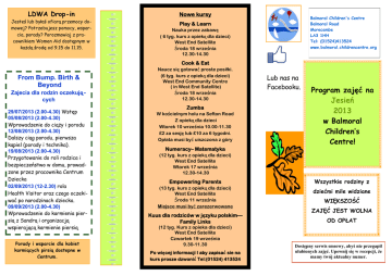 LDWA Drop-in Jesteś lub byłaś ofiarą przemocy domowej? Potrzebujesz pomocy, wsparcia, porady? Porozmawiaj z pracownikiem Women Aid dostępnym w każdą środę od 9.15 do 11.15. Nowe kursy Balmoral Children's Centre Balmoral Road Morecambe LA3 1HH Tel: (01524)413524 www.balmoral.childrencentre.org Play & Learn Nauka przez zabawę ( 6 tyg. kurs z opieką dla dzieci) West End Satellite Środa 18 września 12.30-14.30 Cook & Eat From Bump. Birth & Beyond Zajecia dla rodzin oczekujących 29/07/2013 (2.00-4.30) Wstęp 05/08/2013 (2.00-4.30) Wprowadzenie do ciąży i porodu 12/08/2013 (2.00-4.30) Dalszy ciąg porodu, pierwsza kąpiel (porady i technika). 19/08/2013 (2.00-4.30) Przygotowanie do roli rodzica i bezpieczeństwo w domu, prowadzone przez pracownika Centrum Dziecka 02/09/2013 (12-2.30) rola Health Visitor oraz czego oczekiwać po narodzinach dziecka. 09/09/2013 (2.00-4.30) Wprowadzenie do karmienia piersią z Sandrą i organizacją wspierającą karmienie piersią Porady i wsparcie dla kobiet karmiących pirsią dostepne w Centrum. Naucz się gotować proste posiłki. (6 tyg. kurs z opieką dla dzieci) West End Community Centre ( in West End Satellite) Środa 18 września 12.30-14.30 Zumba W kościelnym holu na Sefton Road Z opieką dla dzieci Wtorek 10 września 10.00-11.30 £2 za sesję lub £10 za 6 tygodni. Opłata musi być uiszczona z góry Numeracy– Matematyka Lub nas na Facebooku. Program zajęć na Jesień 2013 w Balmoral Children’s Centre! (12 tyg. kurs z opieką dla dzieci) West End Satellite Wtorek 17 września 12.30-14.30 Empowering Parents Wszystkie rodziny z (13 tyg. kurs z opieką dla dzieci) West End Satellite Środa 11 września Miejsce musi być zarezerwowane dziećmi mile widziane Kuus dla rodziców w języku polskim— Family Links (12 tyg. Kurs z opieka dla dzieci) West End Satellite Czwartek 19 września 9.30-11.30 Po więcej informacji I aby zapisać sie na kurs prosze dzwonić Tel:(01524) 413524 WIĘKSZOŚĆ ZAJĘĆ JEST WOLNA OD OPŁAT Dostępny serwis smsowy, abyś nie przegapił ulubionych zajęć. Upewnij się w recepcji, że mamy twój aktualny numer. Wake up and Shake up - zacznij tydzień tanecznie. Zajęcia rytmiczno-muzyczne, po których możesz dołączyć do... Zdrowe Śniadanie 9.15-10.00 Balmoral C.C. Baby Massage -doskonale relaksuje oraz pomaga nawiązać więź z twoim dzieckiem. Grupa dla dzieci od 8 tyg. 10.00-11.30 Balmoral C.C 1.00-2.30 Balmoral C.C. Nastoletnie mamy –grupa dla młodych mam i oczekujących mam Drop-In Contraception Out-reach Clinic - przyjdź lub skontaktuj sie z Hazel 07970848393 01524 413524 12.00-1.30 Balmoral C.C. 2.30-4.15 Balmoral C.C. WTOREK CZWARTEK Rhyme Time and Story Time. Piosenki, rymowanki i bajki dla maluchów wspierające roz- 9.30-10.15 woj mowy, po której możesz dołaczy do Sensory Play– zabawy sensorycznej 10.15-11.00 Glucose Tolerance Testing - tylko na zalecenie położnej 8.30-12.30 Balmoral C.C. Messy Play-No mess at home-odkryj nowe, twórcze zastosowanie przedmiotów codziennego użytku:) 9.30-11.00 Balmoral C.C. Zumba z crèchem 6 tyg. zajęcia. Z powodu ograniczonej liczby miejsc NIZBĘDNA jest REZERWACJA £2 za sesję lub £10 za 6 sesji. Opłata musi byś uiszczona z góry. 10.00-11.30 Sefton Road Church Hall Pokój sensoryczny– zarezerwuj swóją 1/2 godz. sesję 12-3.30 pm Balmoral C.C. Dad’s Group– co drugi tydzień: 3/17 września 1/15/29 października. Otwarta dla wszystkich ojców oraz opiekunów płci męskiej. Lekka kolacja na miejscu. 5.30-7.00 Balmoral C.C. Library—Biblioteka Dostępna w trakcie większości zajęć. Pożycz 2 książki lub książkę i story sack na 2 tygodnie do domu . PIĄTEK . Child Health Clinic-klinika zdrowia dziecka. Okazja, aby skonsultowac się z Health Visitor. Grow Your Own kurs ogrodnictwa W każdy poniedziałek między 12.30 a 14.30. Każdy uczestnik otrzyma swoją wyznaczoną działkę, na której można chodować warzywa, owoce, zioła itp. Dzwoń, aby wpisać się na listę. Witaminy *Healthy Start dostępne są w Centrum Dziecka Balmoral za okazaniem talonu. Proszę dzwonić po więcej informacji 01524 413524 9.30-11.30 Balmoral C.C. Położna umówione wizyty– skontaktuj się ze swoją położna lub zadzwoń 01524 413524, aby zmówi c wizytę. 9.00-11.30 Balmoral C.C. Midwife Drop-in 11.30-12.30 Balmoral C.C. Baby Signing– język migowy dla maluchów. dostępne w każdy wtorek po południu Skontaktuj się z nami w celu umówienia wizyty 10.00 Chill & Chat--poznaj innych rodziców, pobaw 10.15-11.00 Balmoral C.C. sie ze swoim dzieckiem, skorzystaj z porad Star Buddy Breastfeeding Group - porady i wsparcie dla mam karmiacych piersią. Spotkania z pracownikiem Citizens Advice Bureau ŚRODA PONIEDZIAŁEK 1.30-2.30 Balmoral C.C. Dostępny w każdy wtorek od 9.30 do 15.30. Pokój oferuje wielo sensoryczne środowisko, które może przyspieszyć rozwój wielu umiejętności np kncentrację, mowę, zdolności motoryczne itp.