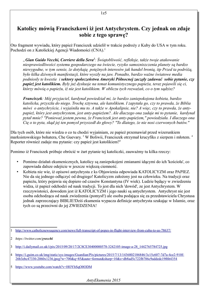 1z5 Katolicy mówią Franciszkowi iż jest Antychrystem. Czy jednak on zdaje sobie z tego sprawę? Oto fragment wywiadu, który papież Franciszek udzielił w trakcie podroży z Kuby do USA w tym roku. Pochodzi on z Katolickiej Agencji Wiadomości (CNA).1 „Gian Guido Vecchi, Corriere della Sera2: Świątobliwość, refleksje, także twoje atakowanie niesprawiedliwości systemu gospodarczego na świecie, ryzyko samozniszczenia planety są bardzo niewygodne, w tym sensie, że dotykają potężnych interesów jak handel bronią, itp Przed ta podróżą, było kilka dziwnych manifestacji, które wyszły na jaw. Ponadto, bardzo ważne światowe media podniosły te kwestie i sektory społeczeństwa Ameryki Północnej zaczęły zadawać sobie pytanie, czy papież jest katolikiem. Były już dyskusje na temat komunistycznego papieża, teraz pojawili się ci, którzy mówią o papieżu, iż nie jest katolikiem. W obliczu tych rozważań, co o tym sądzisz? Franciszek: Mój przyjaciel, kardynał powiedział mi, że bardzo zaniepokojona kobieta, bardzo katolicka, przyszła do niego. Trochę sztywna, ale katolikiem. I zapytała go, czy to prawda, że Biblia mówi o antychryście, i wyjaśniła mu to. A także w Apokalipsie, nie? A więc, czy to prawda, że antypapież, który jest antychrystem, jest anty-papieżem?. Ale dlaczego ona zadaje mi to pytanie, kardynał pytał mnie? "Ponieważ jestem pewna, że Franciszek jest anty-papieżem," powiedziała. I dlaczego ona Cię o to pyta, skąd jej ten pomysł przyszedł do głowy? "To dlatego, że nie nosi czerwonych butów." Dla tych osób, które nie wiedza o co tu chodzi wyjaśniam, ze papież przemawiał przed wizerunkiem marksistowskiego bohatera, Che Guevary. 3 W Boliwii, Franciszek otrzymał krucyfiks z sierpem i młotem. 4 Reporter również zadaje mu pytanie: czy papież jest katolikiem?5 Pomimo iż Franciszek próbuje obrócić w żart pytanie tej katoliczki, zauważmy tu kilka rzeczy: • • Pomimo działań ekumenicznych, katolicy są zaniepokojeni zmianami idącymi do ich 'kościoła', co zapowiada dalsze odejście w jeszcze większą ciemność. Kobieta nie wie, iż opisowi antychrysta z ks Objawienia odpowiada KATOLICYZM oraz PAPIEZ. Nie da się jednego odłączyć od drugiego! Katolicyzm założony jest na człowieku. Na tradycji oraz papieżu, który pojawia się dopiero od czasów Konstantyna (IV wiek). Ludzie będący w zwiedzeniu widza, iż papież odchodzi od nauk tradycji. To jest dla nich 'dowód', ze jest Antychrystem. W rzeczywistości, dowodem jest iż KATOLICYZM i jego nauki są antychrystem. Antychryst nie jest osoba odchodząca od nauk zwiedzenia (pomysł!) ale osoba podająca się za przedstawiciela Chrystusa jednak zaprzeczający BIBLIE!Dziś ekumenia wypacza definicje antychrysta szukając w Islamie, oraz tych co są przeciwni do jej ZWIEDZENIA! 1 http://www.catholicnewsagency.com/news/full-transcript-of-popes-in-flight-interview-from-cuba-to-us-78637/ 2 https://twitter.com/gvecchi 3 http://i.dailymail.co.uk/i/pix/2015/09/20/17/2C8CE30400000578-3242105-image-a-28_1442765784725.jpg 4 https://i.guim.co.uk/img/static/sys-images/Guardian/Pix/pictures/2015/7/13/1436802186846/3c15c607-7d7a-4ce2-910f26b3ebc47330-2060x1236.jpeg?w=700&q=85&auto=format&sharp=10&s=db8ad5c722fb786c9addedc19f6b4354 5 https://www.youtube.com/watch?v=HOYhSqO0ODM AntyEkumenia 2015 2z5 „[Jezus] umieścił Błogosławionego Piotra nad innymi apostołami, i ustanowił w nim na stałe, widzialnym źródłem i fundamentem jedności wiary i komunii...A cale to nauczanie o instytucji, ciągłość, znaczenie i powód świętego prymatu Biskupa Rzymskiego i jego nieomylnego Magisterium, jego Święty Sobór (II) ponownie proponuje by każdy wierny przyjął te nauki. Kontynuując w tym samym przedsięwzięciu , ta Rada postanawia zadeklarować i głosić przed wszystkimi, naukę o biskupach, następcach Apostołów, którzy wraz z następcą Piotra, Wikariusza Chrystusa, (2 *) widzialną głową całego Kościoła, regulują dom Boga żywego.” Lumen Gentium, Sobór Watykański II6, oficjalna strona Watykanu, 1964. Piotr nigdy nie znal katolicyzmu, gdyż narodził się on ok 4 wieku. Szatan użył osoby Piotra by stworzyć fałszywy system nauk ludzkich. Katolicyzm to zbiór osób nienawróconych, którym przewodzi człowiek i na jego naukach budują swoja wiarę i opierają wieczność! Piotr był omylny, napominał go Paweł. Żaden z wersetów Biblii nie wskazuje, iż Jezus stawiał Piotra ponad innych! Jezus w rzeczywistości mówił o budowaniu kościoła na SKALE jaka Jezus jest, oraz na objawieniu w Duchu i Piśmie! Vicarius Christi oznacza osobę na miejsce Chrystusa. Nie ma w Biblii tego tytułu poza ukrytym w znaczeniu anty-chrystus (anty oznacza przeciwko oraz w miejsce!). Biblia zawiera rożne tytuły dla osoby wierzącej (nie katolika!) jak pastor, biskup, starszy itd. Tytuł vicarius pochodzi z Imperium Rzymskiego, jak i większość nauk katolicyzmu! 7 Tytuły jak biskup zostały wypaczone, taki musi mieć żonę i być nawrócony! Kardynał jest czystym ludzkim wymysłem z VI wieku. Inne tytuły podobnie: • • • • • • Prymas Nuncjusz(wysłannik) apostolski Metropolita Arcybiskup Wikariusz apostolski Ordynariusz Tytuły papieskie są bluźniercze: • • Pontifex (pochodzi z Imperium Rzymskiego i powiązany jest z tzw kolegium biskupów, zbiorem najwyższych ranga pogańskich kapłanów jak pontifex maximus, rex sacrorum, flamenow oraz westalek – współcześnie ich odpowiednikiem są zakonnice/ mniszki ) Papież – Papa- Ojciec. Papiestwo zagrabia tytuły Boga Ojca, stad chwała idzie dla człowieka nie dla Boga. Magisterium8 oznacza autorytet do nauczania, w wypadku katolicyzmu 'świętej tradycji'. Łacińskie trado oznacza coś przekazane komuś, w wypadku katolicyzmu, to pogańskie tradycje ubrane w religijna formę (jak 'niepokalane poczęcie' Maryi czy jej 'wniebowzięcie i ukoronowanie w niebie'...) .Tradycja wypiera w 