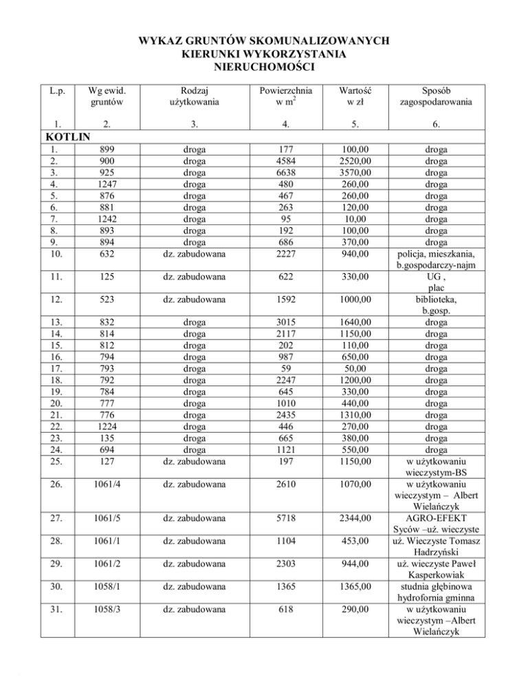 wykaz gruntów skomunalizowanych kierunki wykorzystania