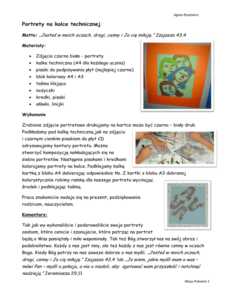 Agata Rysiewicz Portrety na kalce technicznej Motto: „Jesteś w moich oczach, drogi, cenny i Ja cię miłuję.” Izajasza 43,4 Materiały: Zdjęcia czarno białe - portrety kalka techniczna (A4 dla każdego ucznia) pisaki do podpisywania płyt (najlepiej czarne) blok kolorowy A4 i A3 taśma klejąca nożyczki kredki, pisaki ołówki, linijki Wykonanie Zrobione zdjęcie portretowe drukujemy na kartce może być czarno – biały druk. Podkładamy pod kalkę techniczną jak na zdjęciu i czarnym cienkim pisakiem do płyt CD odrysowujemy kontury portretu. Można stworzyć kompozycję nakładających się na siebie portretów. Następnie pisakami i kredkami kolorujemy portrety na kalce. Podklejamy kalkę kartką z bloku A4 dobierając odpowiednie tło. Z kartki z bloku A3 dobranej kolorystycznie robimy ramkę dla naszego portretu wycinając środek i podklejając taśmą. Praca znakomicie nadaje się na prezent, podziękowanie rodzicom, nauczycielom. Komentarz: Tak jak wy wykonaliście i podarowaliście swoje portrety osobom, które cenicie i szanujecie, które patrząc na portret będą o Was pamiętały i miło wspominały. Tak też Bóg stworzył nas na swój obraz i podobieństwo. Każdy z nas jest inny, ale też każdy z nas jest równie cenny w oczach Boga. Kiedy Bóg patrzy na nas zawsze dobrze o nas myśli. „Jesteś w moich oczach, drogi, cenny i Ja cię miłuję.” Izajasza 43,4 lub „Ja wiem, jakie myśli mam o was – mówi Pan – myśli o pokoju, a nie o niedoli, aby zgotować wam przyszłość i natchnąć nadzieją.” Jeremiasza 29,11 Misja Pokoleń 1