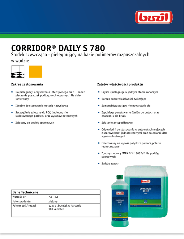 CORRIDOR® DAILY S 780 Środek czyszcząco - pielęgnujący na bazie polimerów rozpuszczalnych w wodzie Zakres zastosowania Zalety/ właściwości produktu Do pielęgnacji i czyszczenia intensywnego oraz zabez pieczania posadzek podłogowych odpornych Na dzia- łanie wody Czyści i pielęgnuje w jednym etapie roboczym Idealny do stosowania metodą natryskową Bardzo dobre właściwości zwilżające Samonabłyszczający, nie nawarstwia się Szczególnie zalecany do PCV, linoleum, nie lakierowanego parkietu oraz wyrobów betonowych Zapobiega powstawaniu śladów po butach oraz osadzaniu się brudu Zalecany do podłóg sportowych Sziałanie antypoślizgowe Odpowiedni do stosowania w automatach myjących, z szorowarkami jednotarczowymi oraz polerkami ultra wysokoobrotowymi Polerowalny na wysoki połysk za pomocą polerki jednotarczowej Zgodny z normą FMPA DIN 18032/2 dla podłóg sportowych Świeży zapach Dane Techniczne Wartość pH 7,6 - 8,6 Kolor produktu zielony Pojemność / rodzaj 12 x 1 l butelek w kartonie 10 l kanister CORRIDOR® DAILY S 780 Środek czyszcząco - pielęgnujący na bazie polimerów rozpuszczalnych w wodzie Zastosowanie i dozowanie Do posadzek podłogowych odpornych na działanie wody. Pielęgnacja: 20-50 ml/10 l wody mycie ręczne: warstwy ochronne: 500 - 1000 ml/10 l wody Stosując metodę czyszczenia na wilgotno nanieść środek na posadzkę podłogową, pozostawić do wyschnięcia i następnie wypolerować za pomocą maszyny jednotarczowej i pada do polerowania. Natrysk: 300 ml/10 l wody Czyszczenie intensywne: 500 ml/10 l wody Obrobić za pomocą maszyny jednotarczowej z użyciem pada czyszczącego, następnie odessać brudny roztwór i wypolerować posadzkę podłogową. Metoda spray: 1:3 z wodą. Wypolerować za pomocą maszyny polerki jednotarczowej lub szorowarki jednotarczowej. Automat: 50-100 ml/10 l wody Zwroty określające zagrożenie H 319 Działa drażniąco na oczy. Szczegółowe informacje znajdziecie Państwo w karcie preparatu niebezpiecznego do produktu S 780 Corridor® Daily na stronie www.buzil.com. Kod GISBAU: GU 40 Numer artykułu: S780-0001 S780-0010 Ważne wskazówki Zawsze używać zimnej wody. W przypadku czyszczenia maszynowego należy regularnie płukać zbiorniki. Dane zawarte w informacjach o produktach bazują na naszych doświadczeniach oraz badaniach i odpowiadają naszemu dzisiejszemu stanowi wiedzy. Różnorodność warunków panujących w obiektach oraz cech materiałów uniemożliwia jednak uwzględnienie wszystkich przypadków. Dlatego w informacjach technicznych możemy podać jedynie ogólne wskazówki odnośnie stosowania produktu. Jakość pracy zależy zatem od fachowej oceny obiektu dokonanej przez użytkownika. W przypadkach spornych jest on zobowiązany sprawdzić działanie produktu firmy Buzil na ukrytym kawałku nawierzchni przeznaczonej do czyszczenia lub zasięgnąć porady odnośnie techniki zastosowania. Ponosimy odpowiedzialność za niepełne lub niewłaściwe dane zawarte w naszych materiałach informacyjnych tylko w przypadku rażącej winy (działanie zamierzone lub rażące zaniedbanie); pozostałe roszczenia wynikające z rękojmi pozostają nienaruszone. Poprzez wprowadzenie tej informacji technicznej unieważniamy wszystkie poprzednie informacje techniczne. Data: 12.10.2015 BUZIL POLSKA SP. Z O.O. ul. Jana Długosza 60 . 51-162 Wrocław T +48 71 376 60 31 . F +48 71 376 60 35 . E [email protected] . www.buzil.pl
