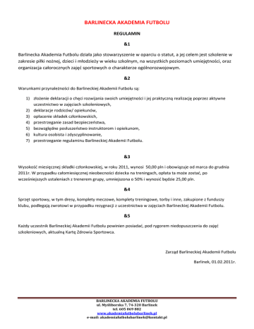 BARLINECKA AKADEMIA FUTBOLU REGULAMIN &1 Barlinecka Akademia Futbolu działa jako stowarzyszenie w oparciu o statut, a jej celem jest szkolenie w zakresie piłki nożnej, dzieci i młodzieży w wieku szkolnym, na wszystkich poziomach umiejętności, oraz organizacja całorocznych zajęć sportowych o charakterze ogólnorozwojowym. &2 Warunkami przynależności do Barlineckiej Akademii Futbolu są: 1) złożenie deklaracji o chęci rozwijania swoich umiejętności i jej praktyczną realizację poprzez aktywne uczestnictwo w zajęciach szkoleniowych, 2) deklaracje rodziców/ opiekunów, 3) opłacenie składek członkowskich, 4) przestrzeganie zasad bezpieczeństwa, 5) bezwzględne posłuszeństwo instruktorom i opiekunom, 6) kultura osobista i zdyscyplinowanie, 7) przestrzeganie regulaminu Barlineckiej Akademii Futbolu. &3 Wysokość miesięcznej składki członkowskiej, w roku 2011, wynosi 50,00 pln i obowiązuje od marca do grudnia 2011r. W przypadku całomiesięcznej nieobecności dziecka na treningach, opłata ta może zostać, po wcześniejszych ustaleniach z trenerem grupy, umniejszona o 50% i wynosić będzie 25,00 pln. &4 Sprzęt sportowy, w tym dresy, komplety meczowe, komplety treningowe, torby i inne, zakupione z funduszy klubu, podlegają zwrotowi w przypadku rezygnacji z uczestnictwa w zajęciach Barlineckiej Akademii Futbolu. &5 Każdy uczestnik Barlineckiej Akademii Futbolu powinien posiadać, pod rygorem niedopuszczenia do zajęć szkoleniowych, aktualną Kartę Zdrowia Sportowca. Zarząd Barlineckiej Akademii Futbolu Barlinek, 01.02.2011r. BARLINECKA AKADEMIA FUTBOLU ul. Myśliborska 7, 74-320 Barlinek tel. 605 069 882 www.akademiafutbolubarlinek.pl e-mail: [email protected]