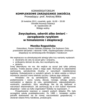 KONWERSATORIUM KOMPLEKSOWE ZARZĄDZANIE JAKOŚCIĄ Prowadzący: prof. Andrzej Blikle 26 kwietnia 2012, czwartek, godz. 16:00 – 20:00 Ośrodek Rozwoju Edukacji Al. Ujazdowskie 28 Wstęp wolny Zwycięstwo, odwrót albo śmierć zarządzanie ryzykiem w himalaizmie i eksploracji Monika Rogozińska Dziennikarz, Prezes Oddziału Polskiego The Explorers Club, przewodnik tatrzański i ratownik TOPR, współorganizator zimowych ekspedycji na ośmiotysięczniki Himalajów i Karakorum We wspinaczce na ośmiotysięcznik istnieją tylko trzy warianty wydarzeń: docieramy do celu na szczyt góry i wracamy, próbujemy dotrzeć do celu, lecz wycofujemy się, giniemy. Innej alternatywy nie ma. Ale wejście na szczyt jest tylko połową sukcesu. Trzeba jeszcze umieć z niego zejść. Wymusza to odpowiednie zachowanie, samokontrolę (trudną w warunkach niedotlenienia) logistykę. Doświadczenie w wysokich górach, to także wiedza w którym momencie zawrócić mimo bliskości szczytu i pokusy jego zdobycia. Himalaiści nie są samobójcami. Wspinaczka górska uczy podejmowania i oceny ryzyka, decyzji, rozwagi, odwagi, pokory, wytrwałości w dążeniu do celu, samodzielności, odpowiedzialności, wyobraźni, zaradności. Góry weryfikują. Nie da się blefować w warunkach ekstremalnych. Jak zachowują się w nich ludzie? Kierownik ekspedycji - wódz czy tylko organizator? Kobiety na wyprawach…? Przygotowanie wyprawy w czasach pustych sklepów PRL było szczególna szkołą przedsiębiorczości. Po 1989 r. himalaiści szybko potrafili dostosować się do nowej rzeczywistości gospodarczej — otwierali własne firmy handlowe, produkcyjne.