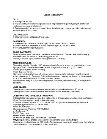 „ BIEG KRESOWY " CELE: 1. Pamięć o Kresach. 2. Poprzez aktywność fizyczną krzewienie współczesnych patriotycznych zachowań i pożądanych postaw młodzieży. 3. Popularyzacja i upowszechnianie biegania w bliskości z przyrodą, jako najprostszej formy aktywności ruchowej. ORGANIZATOR 1. Stowarzyszenie Wsparcia Pokolenia. PARTNERZY: 1. Nadleśnictwo Oława zs. w Bystrzycy. ul. Lipowa 8, 55-200 Oława 2.Gmina Oława pl. Marszałka Józefa Piłsudskiego 28, 55-200 Oława. 3.Stowarzyszenie Moja Bystrzyca. BIURO ZAWODÓW: Biuro organizacyjne zawodów znajdować się w budynku Zespołu Szkół w Bystrzycy. tel.669863800, 691050404 , [email protected]. Numery startowe będą wydawane w godzinach 7:30-9:30. TERMIN I MIEJSCE: Bieg odbędzie się 21 maja 2016 roku na ulicach Bystrzycy oraz drogach leśnych koło Ryczyna. Start koło stadionu lekko atletycznego w Bystrzycy, o godz. 10:00. 5 minut później start nordic walking Trasa długości 10 km. Start obok boiska szkolnego ul. Leśną, potem Lipową dalej szlakiem turystycznym i archeologicznym do Ryczyna. Potem skręt w prawo , bieg drogą leśną , przebiegnięcie obok boiska w lesie dalej u. Lipową, meta ul. Leśna. Nawierzchnia trasy w 90% crossowa(kamyki, korzenie, drobna kostka) w małej części asfaltowa. LIMIT CZASU: Obowiązuje limit czasu na pokonanie trasy dla uczestników biegu – 90 minut. Obowiązuje limit czasu na pokonanie trasy dla nordic walking – 180 minut. UCZESTNICTWO I OPŁATA STARTOWA: 1.Uczestnikiem zawodów może być każdy, kto w dniu zawodów będzie miał ukończone 16 lat. Dokonał zapisu i uiścił opłatę startową. 2. Opłata startowa wynosi 30 zł do 01.04.2016 po tym terminie opłata wynosi 40 zł. Zapisy przyjmowane są do 08.05.2016 r. Konto do płatności: Stowarzyszenie Wsparcia POKOLENIA, ul. Chabrowa 17 55-200 Bystrzyca Numer konta do wpłat BS Oława 04 9585 0007 0010 0022 7755 0001 W tytule przelewu proszę wpisać imię i nazwisko uczestnika biegu. Obowiązuje limit zgłoszeń do 500 osób. Za zgłoszenie uważa się wypełnienie formularza zgłoszeniowego oraz uiszczenie opłaty startowej. 4. Z opłaty startowej zwolnione są kategorie K-70 i M-70. Opłata startowa dla kategorii K60 i M-60 wynosi 10 zł. 5. W przypadku wolnych miejsc opłata w dniu zawodów wynosi 50 zł. 6. Wymagane są badania lekarskie potwierdzające zdolność do udziału w biegu, a w przypadku ich braku, uczestnik zobowiązany jest do złożenia podpisu pod oświadczeniem o zdolności do udziału w zawodach na własną odpowiedzialność. Osoby niepełnoletnie mogą wziąć udział w Biegu pod warunkiem złożenia podpisu na karcie zgłoszenia przez ich ustawowego opiekuna (podstawa prawna: Rozporządzenie Ministra Edukacji Narodowej z dnia 12.09.2001 Dz. U. Nr 101, poz.1095). 8. Wszyscy zawodnicy otrzymają numery startowe, które mają obowiązek umieścić na czas biegu na koszulkach z przodu. Zawodnicy bez numerów startowych lub z numerami umieszczonymi niezgodnie z regulaminem nie zostaną sklasyfikowani. 9. Każdy uczestnik otrzyma pakiet startowy (pamiątkowa koszulka), 10. Każdy uczestnik, który ukończy Bieg, otrzyma medal oraz posiłek regeneracyjny. 11. Bieg towarzyszący dla dzieci. Dodatkową atrakcją będzie Bieg Małego Kresowiaka dla dzieci w wieku 3-6 lat na długości 50 m oraz 7-10 lat na długości 100 m, na bieżni tartanowej. Ogłoszenie rozpoczęcia biegu nastąpi po zakończeniu biegu głównego. Nie obowiązują wcześniejsze zapisy ,tylko obecność w miejscu startu. Dla uczestników przewidziano nagrody niespodzianki. ZGŁOSZENIA: Zgłoszenia przyjmowane będą przez Internet na stronach: www.zmierzymyczas.pl www.maratonypolskie.pl/mp_index.php?dzial=3&action=5&code=37110&bieganie www.biegkresowy.pl KLASYFIKACJE: Przeprowadzona zostanie klasyfikacja kobiet i mężczyzn również w nordic walking. W „Biegu Kresowym" przeprowadzona zostanie klasyfikacja generalna kobiet i mężczyzn oraz klasyfikacje w następujących kategoriach wiekowych: K16 – roczniki 1999-1996 K20 – roczniki 1995-1986 K30 – roczniki 1985-1976 K40 – roczniki 1975-1966 K50 – roczniki 1965-1956 K60 – roczniki 1955-1946 K70 – roczniki 1945 i starsze M16 – roczniki 1999-1996 M20 – roczniki 1995-1986 M30 – roczniki 1985-1976 M40 – roczniki 1975-1966 M50 – roczniki 1965-1956 M60 – roczniki 1955-1946 M70 – roczniki 1945 i starsi NAGRODY: 1. Klasyfikacja generalna kobiet i mężczyzn w biegu – nagrody puchary za miejsca 1-3. 2. Klasyfikacja generalna kobiet i mężczyzn w nording walking – nagrody puchary za miejsca 1-3. 3. Zwycięscy w kategoriach wiekowych otrzymają pamiątkowe dyplomy.. 4. Dekoracja zwycięzców rozpocznie się około godz.13:00 na boisku szkolnym. POSTANOWIENIA KOŃCOWE: 1. Koordynatorem Biegu jest Helena Masło. 3. Organizator zapewnia pierwszą pomoc medyczną. 4. Organizator nie bierze odpowiedzialności za bezpieczeństwo osób trenujących na trasie przed i po imprezie. 5. Interpretacja niniejszego Regulaminu należy do Organizatora. Ewentualne protesty należy zgłaszać do 15 minut po wywieszeniu pierwszych nieoficjalnych wyników. Protesty będą rozpatrywane na miejscu. 6. Trasa nie jest zamknięta dla ruchu turystycznego. 7. Przebieralnia, prysznice oraz toalety znajdują się w budynku szkoły .