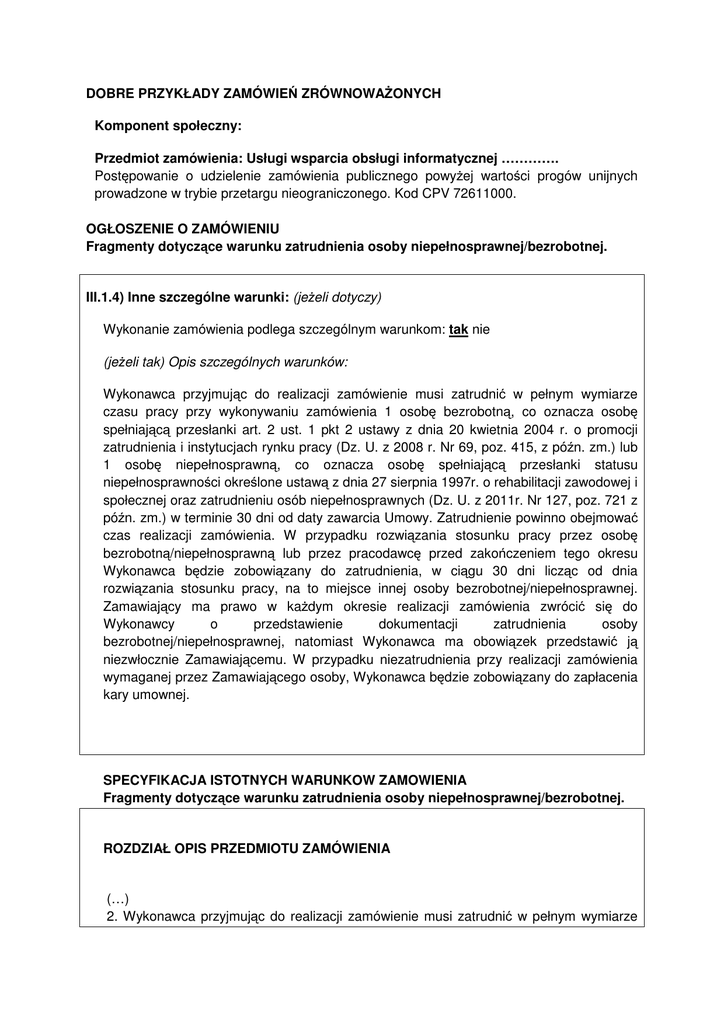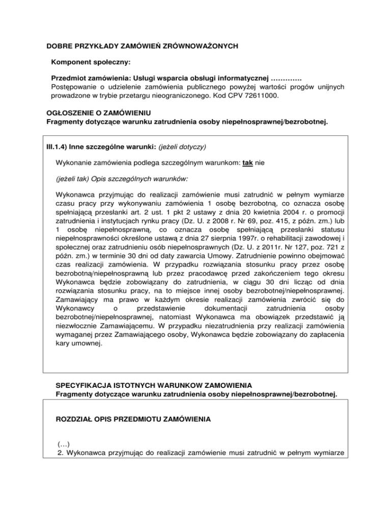 DOBRE PRZYKŁADY ZAMÓWIEŃ ZRÓWNOWAŻONYCH Komponent społeczny: Przedmiot zamówienia: Usługi wsparcia obsługi informatycznej …………. Postępowanie o udzielenie zamówienia publicznego powyżej wartości progów unijnych prowadzone w trybie przetargu nieograniczonego. Kod CPV 72611000. OGŁOSZENIE O ZAMÓWIENIU Fragmenty dotyczące warunku zatrudnienia osoby niepełnosprawnej/bezrobotnej. III.1.4) Inne szczególne warunki: (jeżeli dotyczy) Wykonanie zamówienia podlega szczególnym warunkom: tak nie (jeżeli tak) Opis szczególnych warunków: Wykonawca przyjmując do realizacji zamówienie musi zatrudnić w pełnym wymiarze czasu pracy przy wykonywaniu zamówienia 1 osobę bezrobotną, co oznacza osobę spełniającą przesłanki art. 2 ust. 1 pkt 2 ustawy z dnia 20 kwietnia 2004 r. o promocji zatrudnienia i instytucjach rynku pracy (Dz. U. z 2008 r. Nr 69, poz. 415, z późn. zm.) lub 1 osobę niepełnosprawną, co oznacza osobę spełniającą przesłanki statusu niepełnosprawności określone ustawą z dnia 27 sierpnia 1997r. o rehabilitacji zawodowej i społecznej oraz zatrudnieniu osób niepełnosprawnych (Dz. U. z 2011r. Nr 127, poz. 721 z późn. zm.) w terminie 30 dni od daty zawarcia Umowy. Zatrudnienie powinno obejmować czas realizacji zamówienia. W przypadku rozwiązania stosunku pracy przez osobę bezrobotną/niepełnosprawną lub przez pracodawcę przed zakończeniem tego okresu Wykonawca będzie zobowiązany do zatrudnienia, w ciągu 30 dni licząc od dnia rozwiązania stosunku pracy, na to miejsce innej osoby bezrobotnej/niepełnosprawnej. Zamawiający ma prawo w każdym okresie realizacji zamówienia zwrócić się do Wykonawcy o przedstawienie dokumentacji zatrudnienia osoby bezrobotnej/niepełnosprawnej, natomiast Wykonawca ma obowiązek przedstawić ją niezwłocznie Zamawiającemu. W przypadku niezatrudnienia przy realizacji zamówienia wymaganej przez Zamawiającego osoby, Wykonawca będzie zobowiązany do zapłacenia kary umownej. SPECYFIKACJA ISTOTNYCH WARUNKOW ZAMOWIENIA Fragmenty dotyczące warunku zatrudnienia osoby niepełnosprawnej/bezrobotnej. ROZDZIAŁ OPIS PRZEDMIOTU ZAMÓWIENIA (…) 2. Wykonawca przyjmując do realizacji zamówienie musi zatrudnić w pełnym wymiarze czasu pracy przy wykonywaniu zamówienia 1 osobę bezrobotną, co oznacza osobę spełniającą przesłanki art. 2 ust. 1 pkt 2 ustawy z dnia 20 kwietnia 2004 r. o promocji zatrudnienia i instytucjach rynku pracy (Dz. U. z 2008 r. Nr 69, poz. 415, z późn. zm.) lub 1 osobę niepełnosprawną, co oznacza osobę spełniającą przesłanki statusu niepełnosprawności określone ustawą z dnia 27 sierpnia 1997r. o rehabilitacji zawodowej i społecznej oraz zatrudnieniu osób niepełnosprawnych (Dz. U. z 2011r. Nr 127, poz. 721 z późn. zm.) w terminie 30 dni od daty zawarcia Umowy. Zatrudnienie powinno obejmować czas realizacji zamówienia. W przypadku rozwiązania stosunku pracy przez osobę bezrobotną/niepełnosprawną lub przez pracodawcę przed zakończeniem tego okresu Wykonawca będzie zobowiązany do zatrudnienia, w ciągu 30 dni licząc od dnia rozwiązania stosunku pracy, na to miejsce innej osoby bezrobotnej/niepełnosprawnej. Zamawiający ma prawo w każdym okresie realizacji zamówienia zwrócić się do Wykonawcy o przedstawienie dokumentacji zatrudnienia osoby bezrobotnej/niepełnosprawnej, natomiast Wykonawca ma obowiązek przedstawić ją niezwłocznie Zamawiającemu. W przypadku niezatrudnienia przy realizacji zamówienia wymaganej przez Zamawiającego osoby, Wykonawca będzie zobowiązany do zapłacenia kary umownej. Załącznik D - Wzór umowy Umowa nr ……….. §3. Sposób realizacji Umowy (…) Wykonawca przyjmując do realizacji zamówienie musi zatrudnić w pełnym wymiarze czasu pracy przy wykonywaniu zamówienia 1 osobę bezrobotną, co oznacza osobę spełniającą przesłanki art. 2 ust. 1 pkt 2 ustawy z dnia 20 kwietnia 2004 r. o promocji zatrudnienia i instytucjach rynku pracy (Dz. U. z 2008 r. Nr 69, poz. 415, z późn. zm.) lub 1 osobę niepełnosprawną, co oznacza osobę spełniającą przesłanki statusu niepełnosprawności określone ustawą z dnia 27 sierpnia 1997r. o rehabilitacji zawodowej i społecznej oraz zatrudnieniu osób niepełnosprawnych (Dz. U. z 201 lr. Nr 127, poz. 721 z późn. zm.) w terminie 30 dni od daty zawarcia Umowy. Zatrudnienie powinno obejmować czas realizacji zamówienia. W przypadku rozwiązania stosunku pracy przez osobę bezrobotną/niepełnosprawną lub przez pracodawcę przed zakończeniem tego okresu Wykonawca będzie zobowiązany do zatrudnienia, w ciągu 30 dni licząc od dnia rozwiązania stosunku pracy, na to miejsce innej osoby bezrobotnej/niepełnosprawnej. Zamawiający ma prawo w każdym okresie realizacji zamówienia zwrócić się do Wykonawcy o przedstawienie dokumentacji zatrudnienia osoby bezrobotnej/niepełnosprawnej, natomiast Wykonawca ma obowiązek przedstawić ją niezwłocznie Zamawiającemu. W przypadku niezatrudnienia przy realizacji zamówienia wymaganej przez Zamawiającego osoby, Wykonawca będzie zobowiązany do zapłacenia kary umownej. §11. Kary Umowne (…) W przypadku nie zatrudnienia przy realizacji zamówienia przez Wykonawcę 1 osoby bezrobotnej/niepełnosprawnej, Wykonawca będzie zobowiązany do zapłacenia kary umownej w wysokości 1000,00 zł brutto chyba że wykaże, że przedstawił zgłoszenie ofert pracy urzędowi pracy albo odpowiedniemu organowi zajmującemu się realizacją zadań z zakresu rynku pracy w państwie, w którym ten Wykonawca ma siedzibę lub miejsce zamieszkania, a nie zatrudnienie osoby bezrobotnej nastąpiło z przyczyn nie leżących po jego stronie. Za przyczynę nie leżącą po stronie Wykonawcy będzie uznawany brak osób bezrobotnych/niepełnosprawnych zdolnych do wykonywania zamówienia lub odmowa podjęcia pracy przez taką osobę bezrobotną/niepełnosprawną. (…)