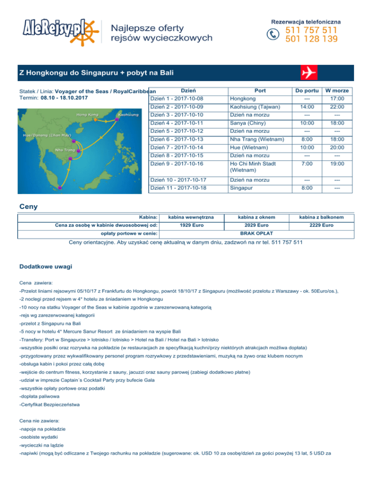 Z Hongkongu do Singapuru + pobyt na Bali Dzień Statek / Linia: Voyager of the Seas / RoyalCaribbean Termin: 08.10 - 18.10.2017 Dzień 1 - 2017-10-08 Port Do portu W morze --- 17:00 14:00 22:00 --- --- 10:00 18:00 Hongkong Dzień 2 - 2017-10-09 Kaohsiung (Tajwan) Dzień 3 - 2017-10-10 Dzień na morzu Dzień 4 - 2017-10-11 Sanya (Chiny) Dzień 5 - 2017-10-12 Dzień na morzu --- --- Dzień 6 - 2017-10-13 Nha Trang (Wietnam) 8:00 18:00 Dzień 7 - 2017-10-14 Hue (Wietnam) 10:00 20:00 Dzień 8 - 2017-10-15 Dzień na morzu --- --- Dzień 9 - 2017-10-16 Ho Chi Minh Stadt (Wietnam) 7:00 19:00 Dzień 10 - 2017-10-17 Dzień na morzu --- --- Dzień 11 - 2017-10-18 Singapur 8:00 --- Ceny Kabina: Cena za osobę w kabinie dwuosobowej od: kabina wewnętrzna 1929 Euro opłaty portowe w cenie: kabina z oknem kabina z balkonem 2029 Euro 2229 Euro BRAK OPŁAT Ceny orientacyjne. Aby uzyskać cenę aktualną w danym dniu, zadzwoń na nr tel. 511 757 511 Dodatkowe uwagi Cena zawiera: -Przelot liniami rejsowymi 05/10/17 z Frankfurtu do Hongkongu, powrót 18/10/17 z Singapuru (możliwość przelotu z Warszawy - ok. 50Euro/os.), -2 noclegi przed rejsem w 4* hotelu ze śniadaniem w Hongkongu -10 nocy na statku Voyager of the Seas w kabinie zgodnie w zarezerwowaną kategorią -rejs wg zarezerwowanej kategorii -przelot z Singapuru na Bali -5 nocy w hotelu 4* Mercure Sanur Resort ze śniadaniem na wyspie Bali -Transfery: Port w Singapurze > lotnisko / lotnisko > Hotel na Bali / Hotel na Bali > lotnisko -wszystkie posiłki oraz rozrywka na pokładzie (w restauracjach ze specyfikacją kuchni/przy niektórych atrakcjach możliwa dopłata) -przygotowany przez wykwalifikowany personel program rozrywkowy z przedstawieniami, muzyką na żywo oraz klubem nocnym -obsługa kabin i pokoi przez całą dobę -wejście do centrum fitness, korzystanie z sauny, jacuzzi oraz sauny parowej (zabiegi dodatkowo płatne) -udział w imprezie Captain´s Cocktail Party przy bufecie Gala -wszystkie opłaty portowe oraz podatki -dopłata paliwowa -Certyfikat Bezpieczeństwa Cena nie zawiera: -napoje na pokładzie -osobiste wydatki -wycieczki na lądzie -napiwki (mogą być odliczane z Twojego rachunku na pokładzie (sugerowane: ok. USD 10 za osobę/dzień za gości powyżej 13 lat, 5 USD za osobę/dzień za gości od 3 do 12 lat) -ubezpieczenie podróży -wiza, jeśli wymagana język na pokładzie: angielski Voyager of the Seas Rok budowy 1999, Rok modernizacji 2002, Liczba pokładów 14, Liczba kabin 1557, Udział balkonów 48%, Liczba pasażerów 3114 osób, Liczba załogi 1181 osób Szerokość 48m, Długość 311m, Wyporność 138000 ton Voyager of the SeasStatki klasy Voyager to coś więcej niż duże wycieczkowce, to prawdziwe cuda inzynierii morskiej. Statki klasy Voyager są o 30% większe niż pozostałe statki, a wprowadzone innowacje w tej klasie umożliwiają gościom rejs w luksusowych warunkach. Voyager of the Seas jest jednym z największych cudów inżynierii morskiej. Innowacje wprowadzone na tym i na innych statkach klasy Voyager umożliwiają gościom rejs w luksusowych warunkach. Zapewniają relaks dla ciała i duszy podczas korzystania z bogatej oferty centrum odnowy biologicznej oraz wielu innych atrakcji dostępnych na statku. Royal Carribean zaprasza na pokłady swoich statków gości w różnym wieku. Jednak warto zaznaczyć, iż Voyager of the Seas został zaprojektowany głównie z myślą o aktywnych turystach i rodzinach z dziećmi. Główne atrakcje na statku:promenada Royal, która jest czynna 24 h/dobę, znajduje się na niej 12 barów i 7 restauracji, dyskoteki, 3 baseny i 6 jacuzzi, kino, teatr, kasyno Royale, pełnowymiarowe boisko do koszykówki, sztuczne lodowisko, ściana wspinaczkowa, tor wrotkarski, trasa do biegania, symulator do gry w golfa, mini pole golfowe, centrum dziecięco - młodzieżowe, Adventure Ocean - program dla dzieci, galeria sklepów wolnocłowych, bibliotekacentrum odnowy biologicznej - fitness center, siłownia, aerobic, sauna, salon piękności, Na statku znajduje się centrum konferencyjne, które może pomieścić 425 osób - do dyspozycji fax, ksero, drukarki, dostęp do Internetu, sala multimedialna dla 60 osób - wyposażona w najnowszy sprzęt konferencyjnysala wykładowa dla 22 osób - do dyspozycji projektory, ekrany, mikrofony.